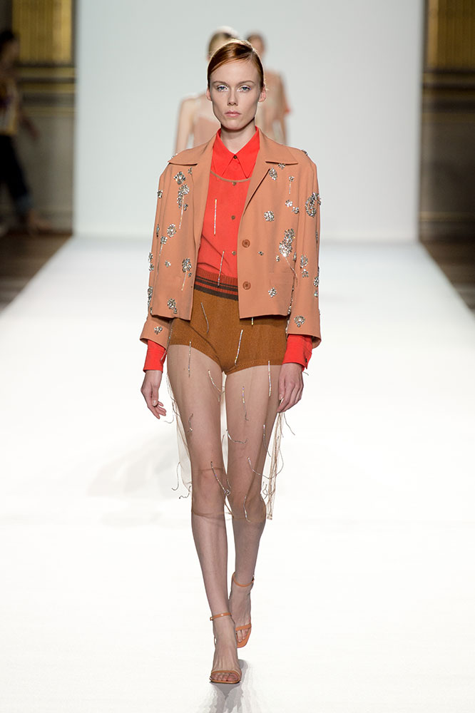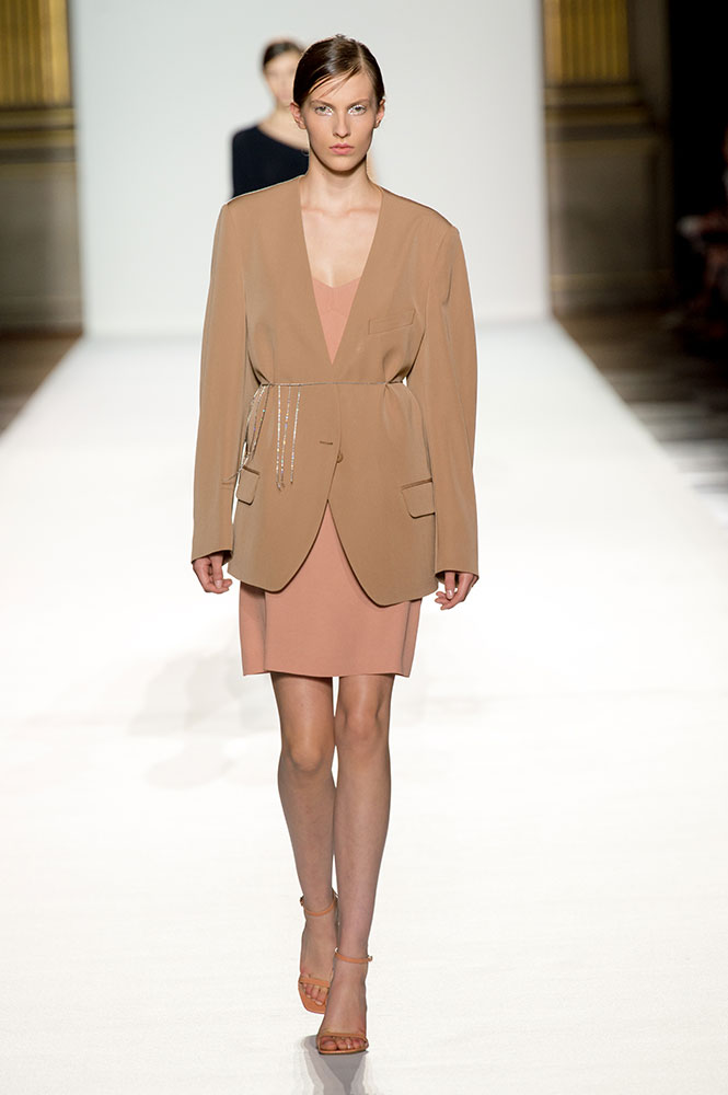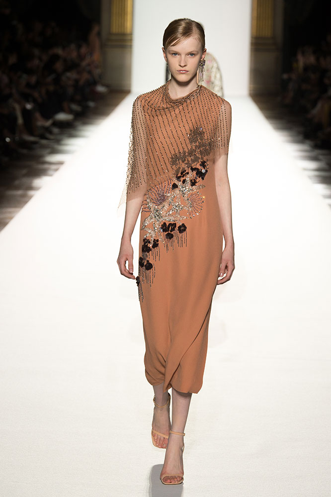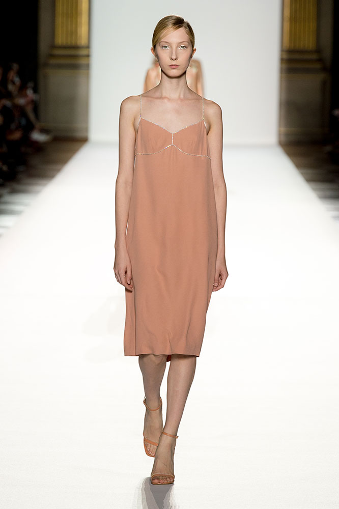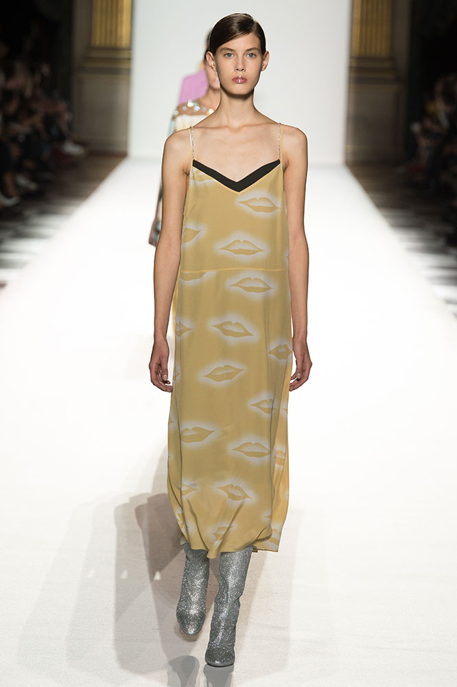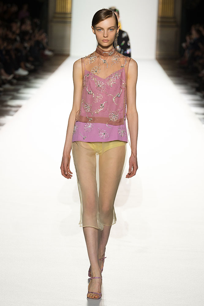 ドリスヴァンノッテンの18SSコレクションはヌードカラーのシンプルなスリップドレスからスタートした。ミニドレスの上にフリンジがついたチュールドレスが重なる。