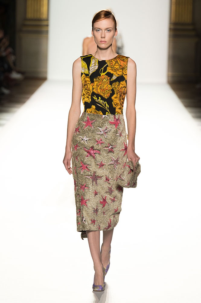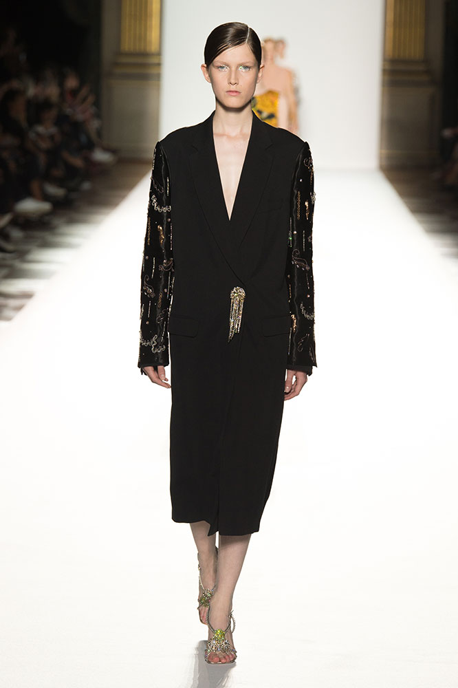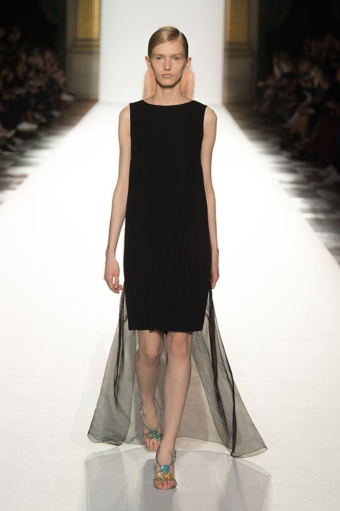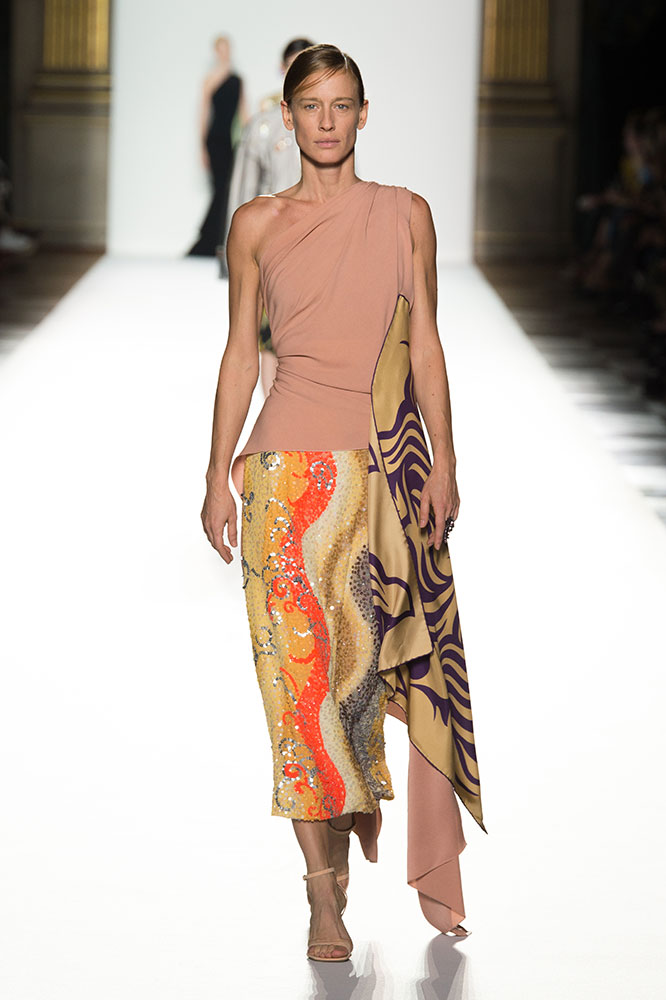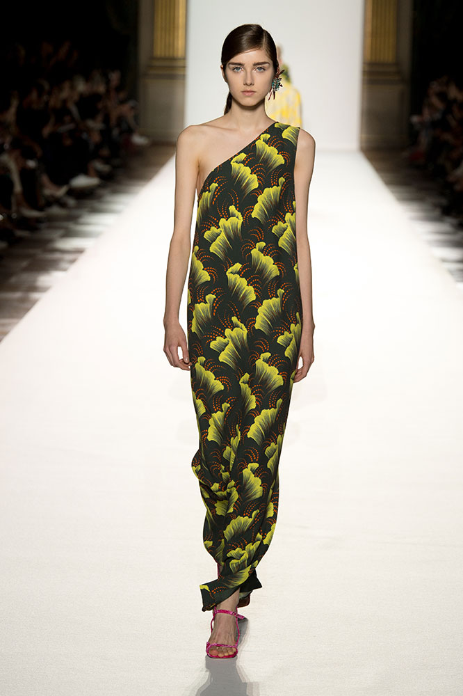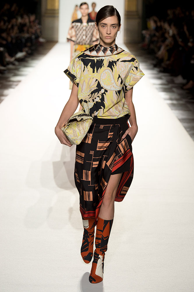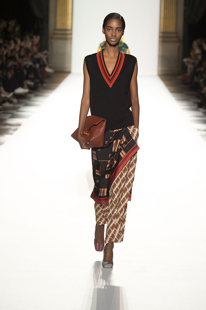 黒のドレスにはプリントスカーフを大胆にバイアスで剥ぎ、シンプルなIラインドレスを柄と動きでドラマチックに仕上げている。今シーズンのプリントはパネル柄を活かして、ボディにドレープを作る。