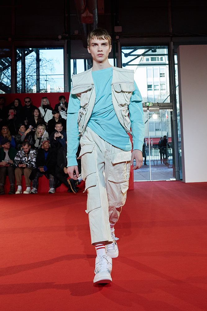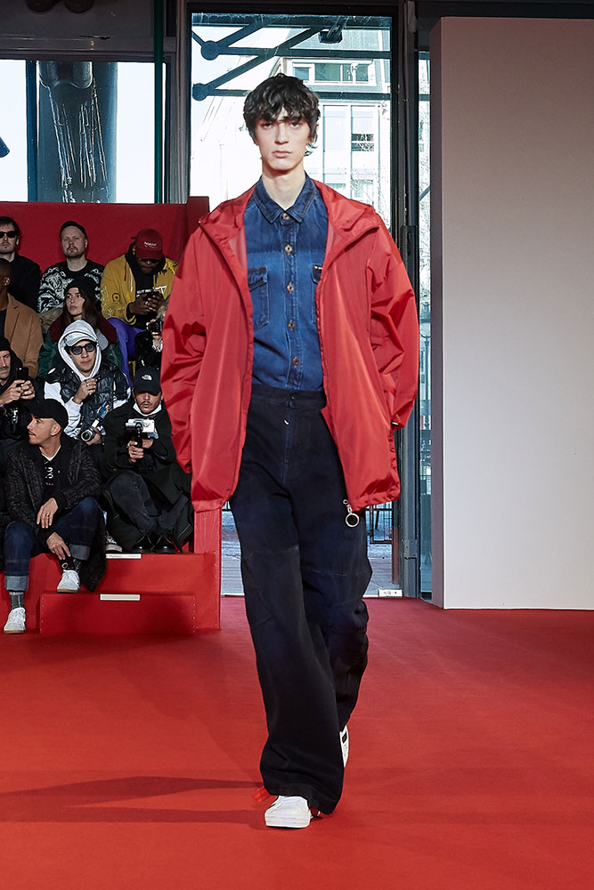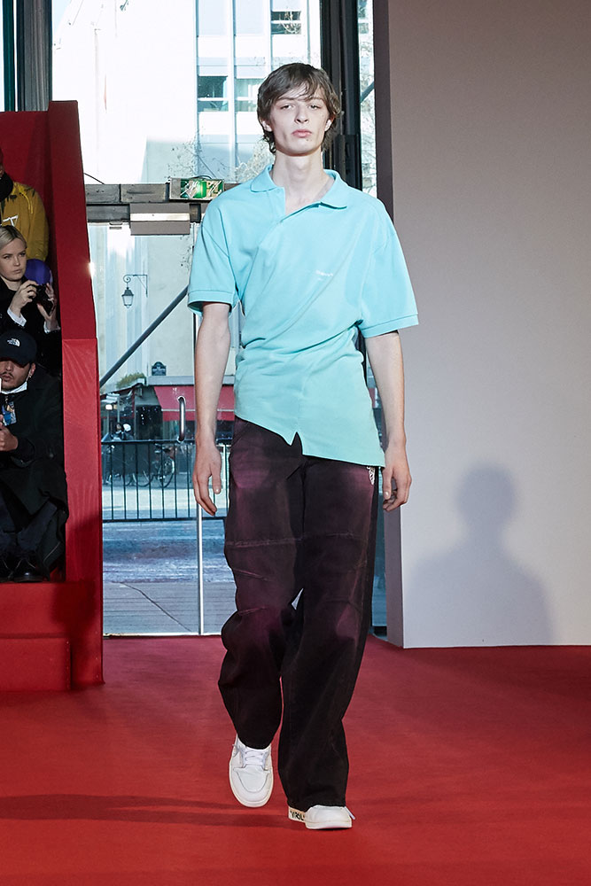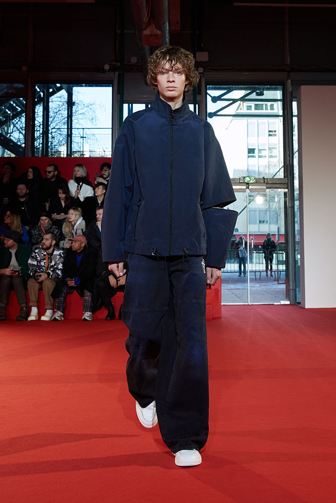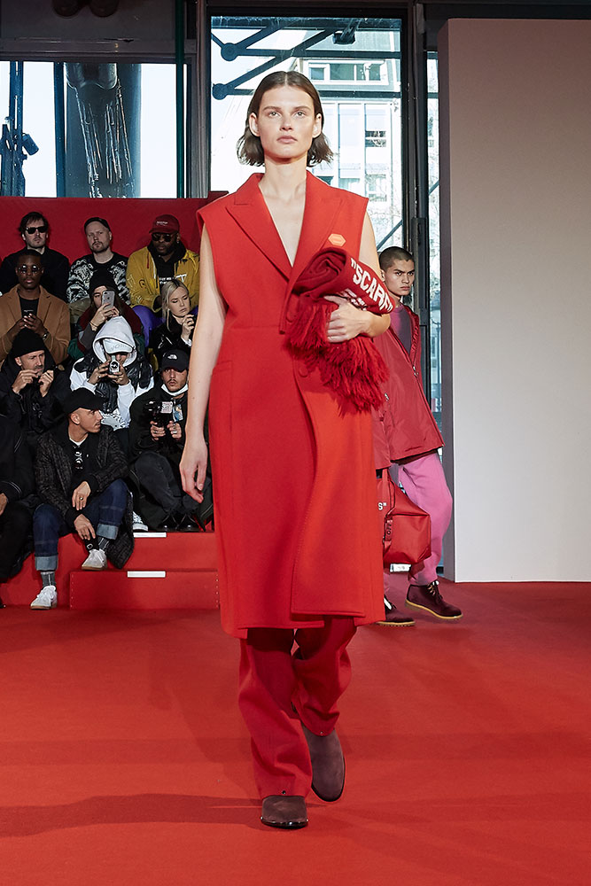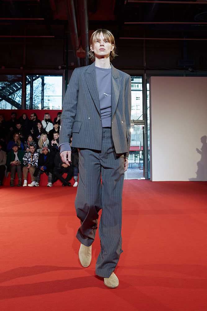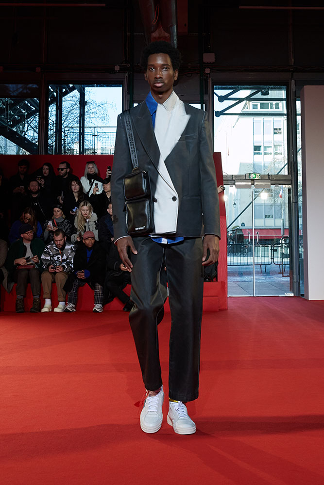 テーマを「BUSINESS CASUAL」と冠し、Virgil Abloh が魅せたのは OFF-WHITE 流ビジネススタイル。飛ぶ鳥を落とす勢いで躍進を続けるストリートウェアブランドでありながら、至極のテラーリングルックを披露。勿論、ショーでお目見えしたのは従来のスーツとは一線を画す、Virgil Abloh のひねりが存分に効いたユニークなルックの数々。建築家という顔も持つデザイナーらしく、構築的なデザインが随所に見てとることができる。