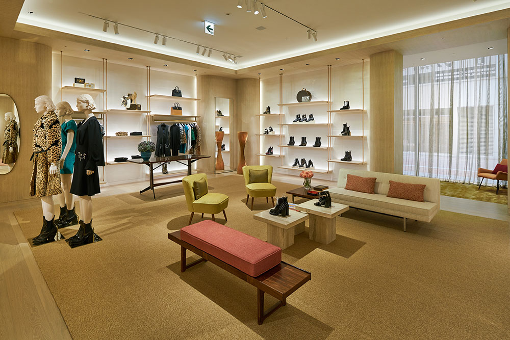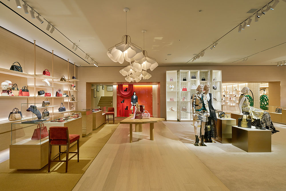 店舗ファサードには「オブジェ・ノマド コレクション」より Marcel Wanders (マルセル・ワンダース) の 「ダイヤモンド・スクリーン」から着想を得たデザインを採用。2フロアで構成される店内には、やわらかな自然光が差し込み開放的で心地よい空間が広がる。1Fはベージュからライトブラウンを基調としたラグジュアリーで洗練されたウィメンズフロア。各所に「オブジェ・ノマド コレクション」から着想を得たデザインや個性的なファニチャーが配され、上品でフェミニンなコレクションを引き立てている。2Fは趣を変え、ダークなカラートーンで落ち着きのあるメンズフロアを展開。存在感のあるナチュラル ウッドキャビネットで壁一面に並べられたレザーグッズは男性のロマンをくすぐること間違いなし。スペースを贅沢に使ったレイアウトでゆったりとくつろぎながら買い物を楽しむことができる。