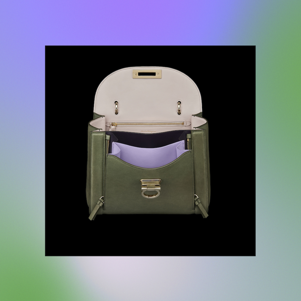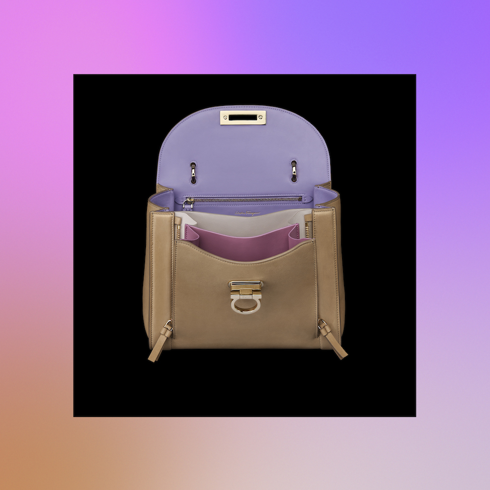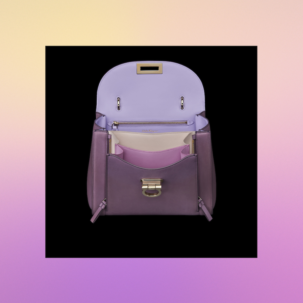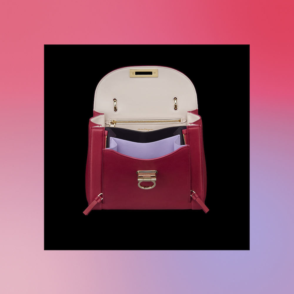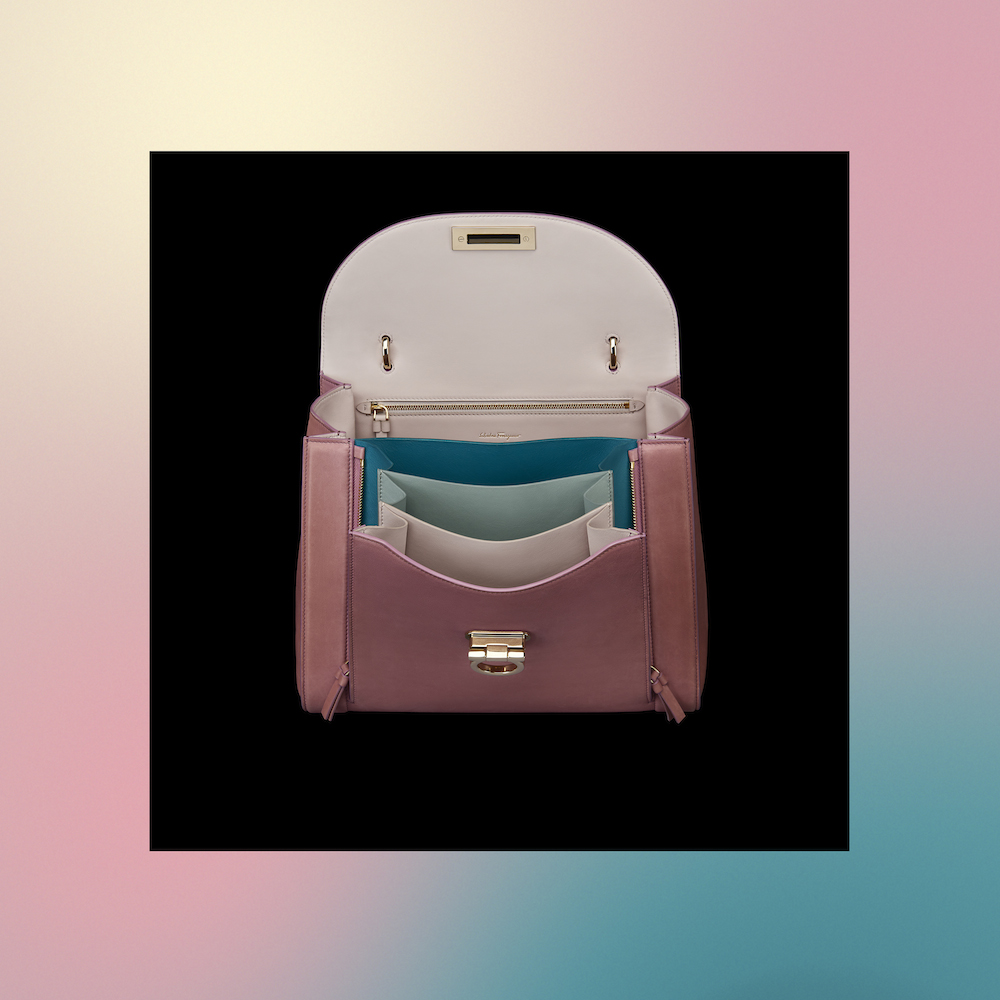 また、注目いただきたいのは、このバッグに隠されたとっておきのサプライズ。バッグの内側にある2つのサイドジップを開けると、マチ付きポケットのひとつずつのコンパートメントが違う異なる色でお目見え。実は、こちら1938年に Salvatore Ferragamo が Judy Garland (ジュディ・ガーランド) のために生み出したという伝説のレインボーサンダルへのオマージュ。Paul Andrew (ポール・アンドリュー) のブランドのヘリテージへの敬意とブランドの誇る精巧な技術と職人技が凝縮された贅沢な逸品だ。