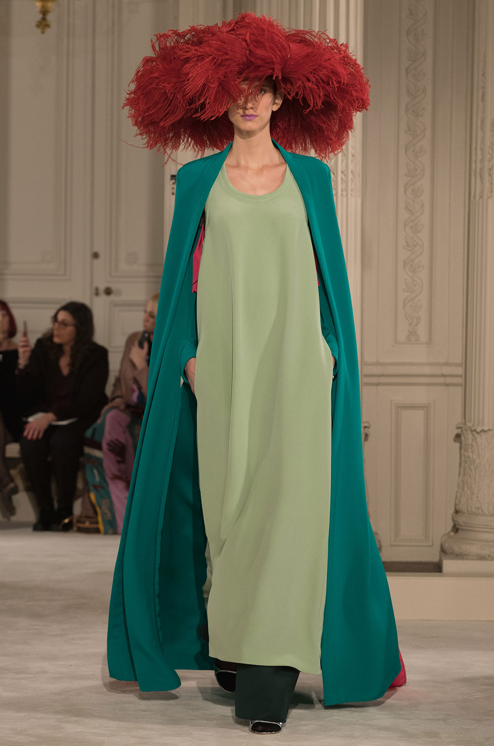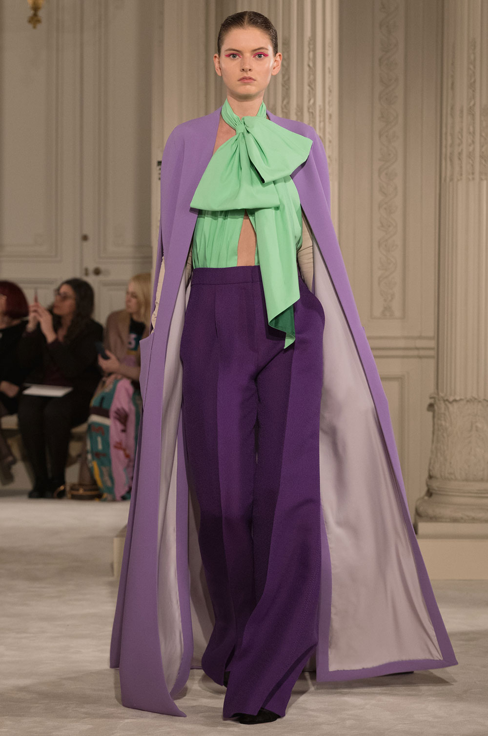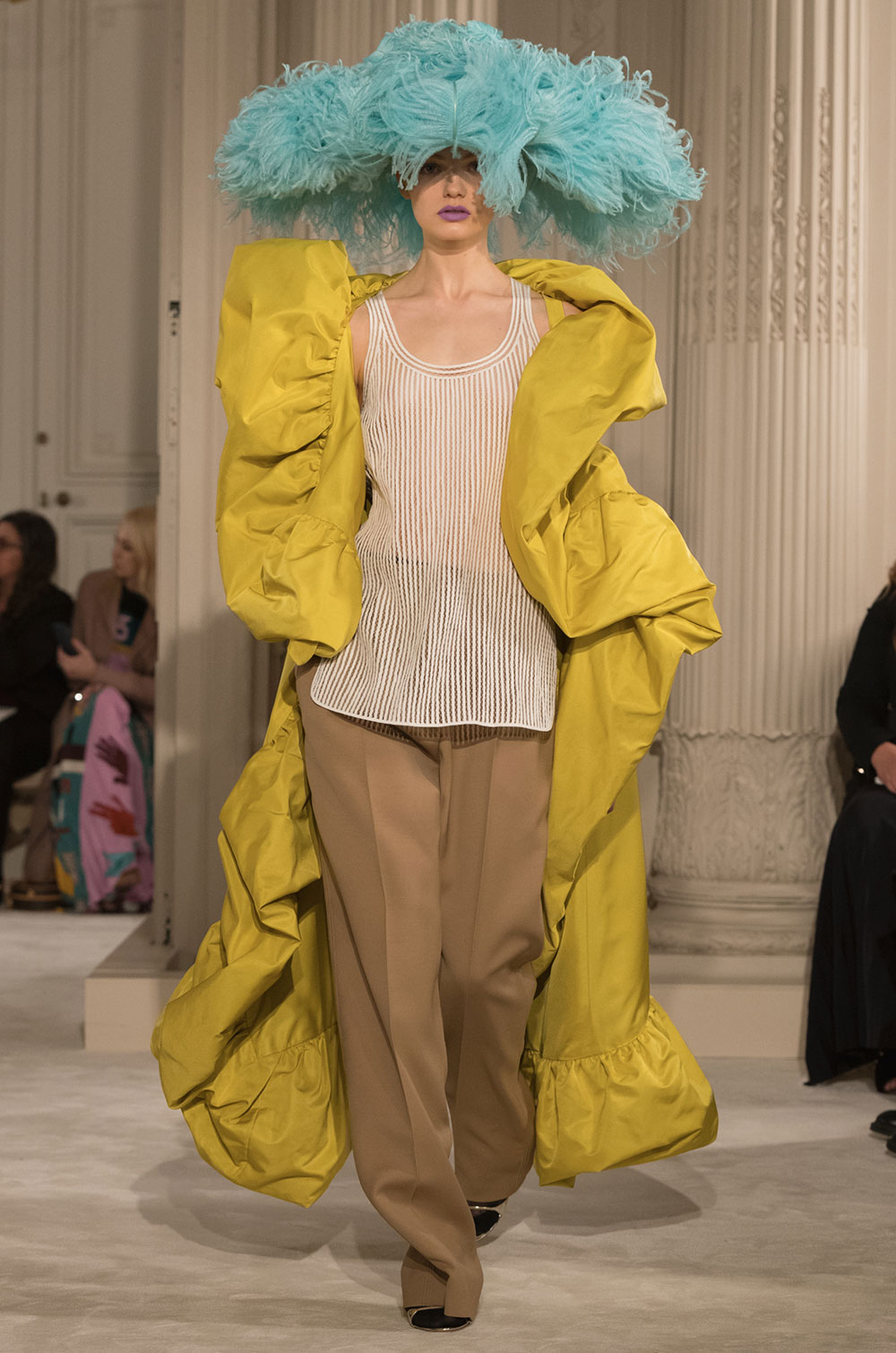 シルクタフタコートは大きなラッフルが揺れ、衣擦れの音がする。ランニングトップとワイドパンツを合わせてさらりと着ている。フェザーが揺れる大きなハットが女性の動きを優雅に見せる。コートやドレスのウエストに、あるいは首元に大きく結ぶリボンがカラーコントラストを加えている。シルクガザータの量感たっぷりのケープにフレアードレス、Vや直線ラインのドレスなど冴えあるカッティングはメゾンの技だ。