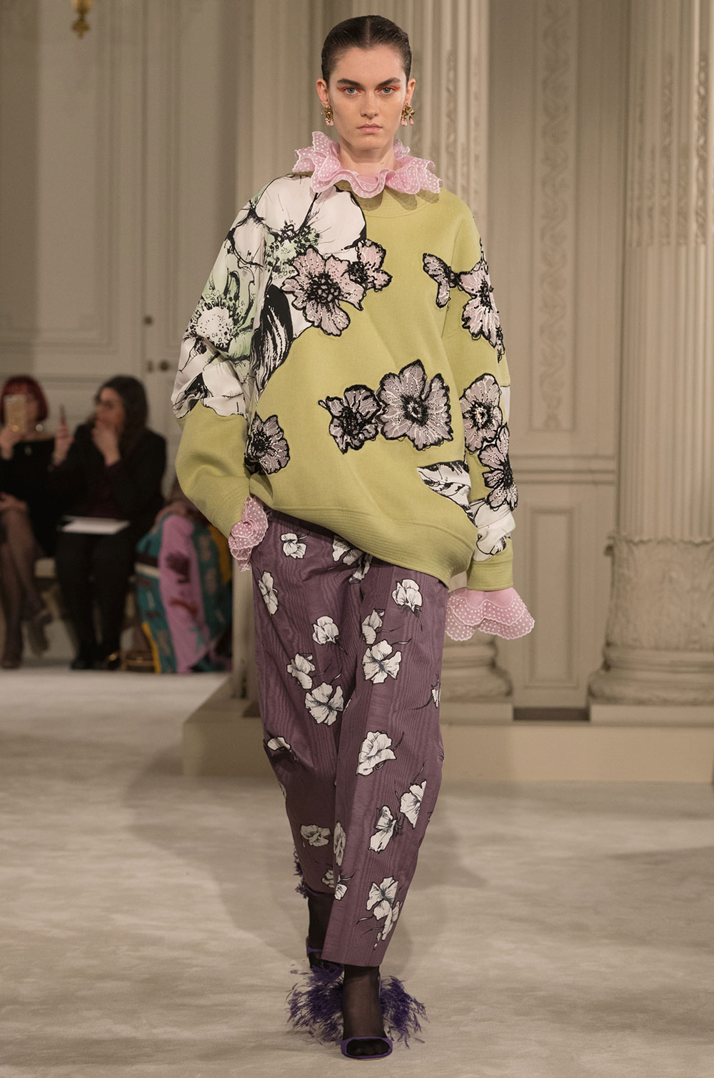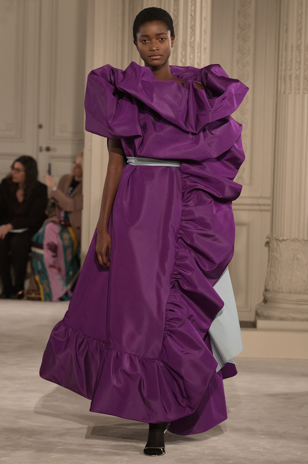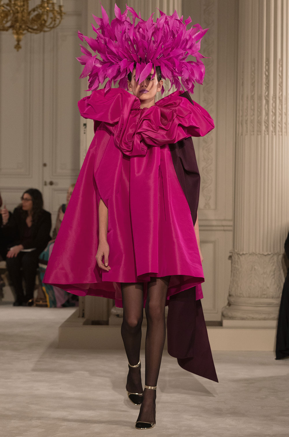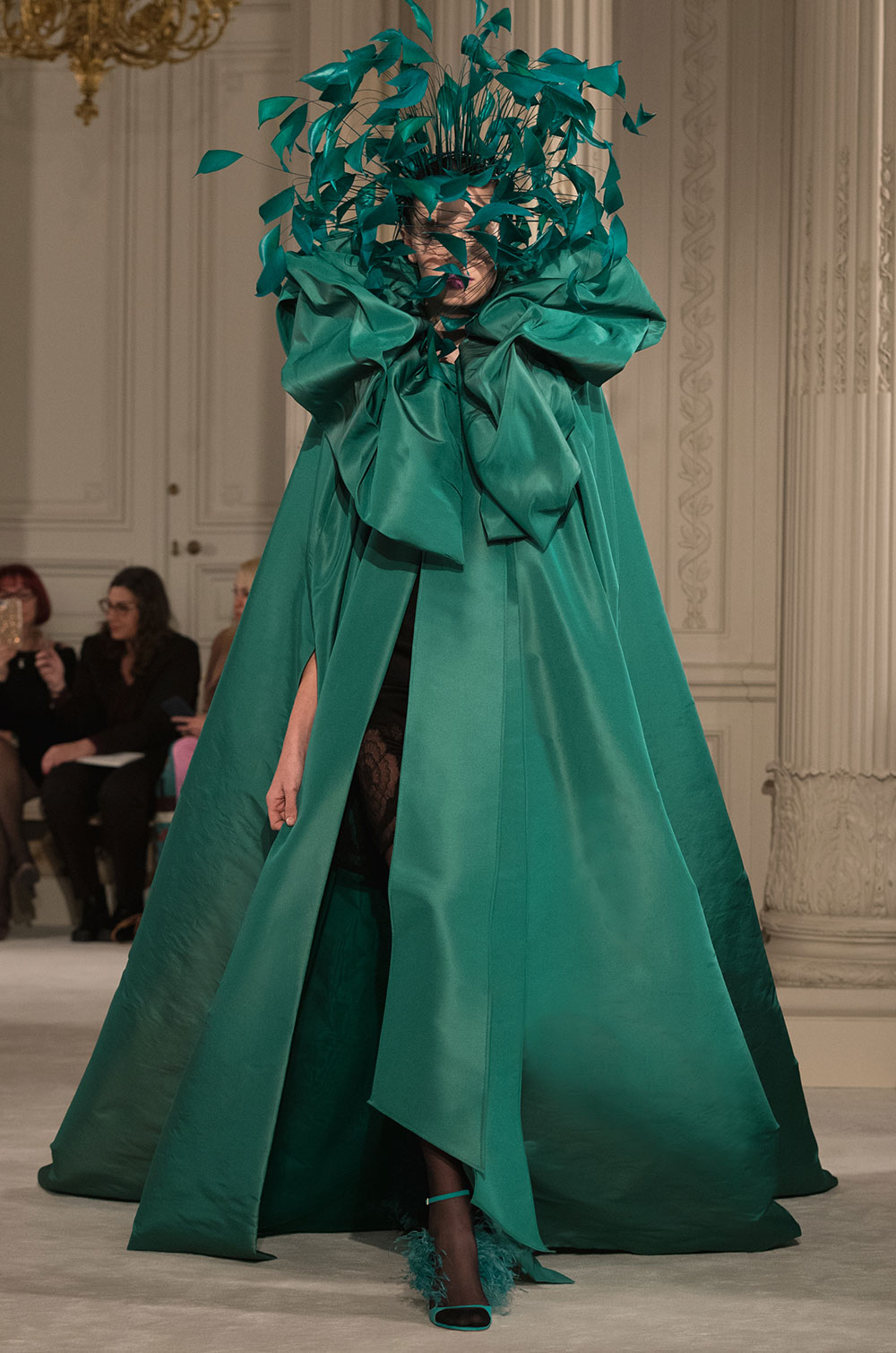 シルクタフタコートは大きなラッフルが揺れ、衣擦れの音がする。ランニングトップとワイドパンツを合わせてさらりと着ている。フェザーが揺れる大きなハットが女性の動きを優雅に見せる。コートやドレスのウエストに、あるいは首元に大きく結ぶリボンがカラーコントラストを加えている。シルクガザータの量感たっぷりのケープにフレアードレス、Vや直線ラインのドレスなど冴えあるカッティングはメゾンの技だ。
