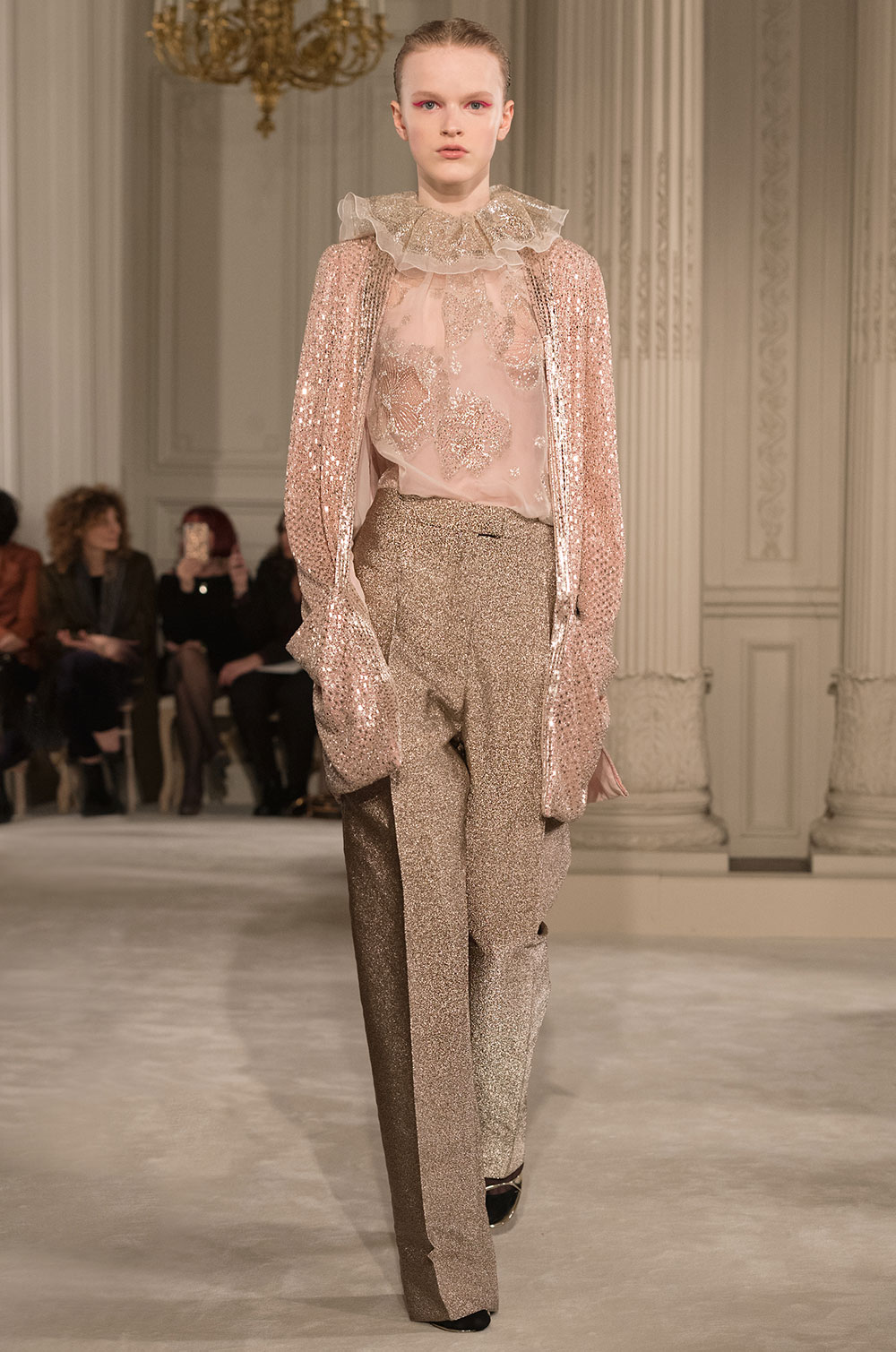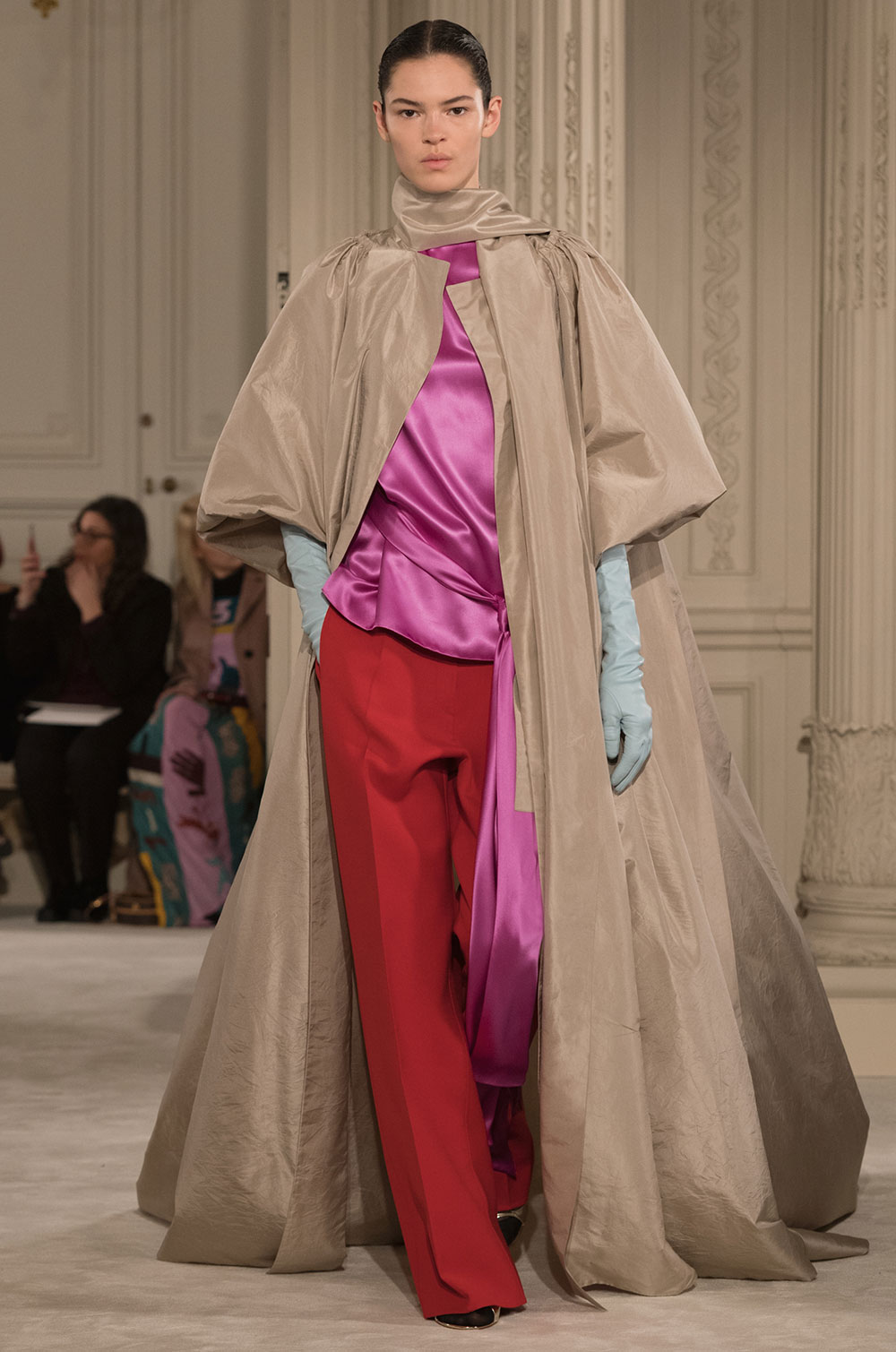 Valentino はクチュール2シーズン前から、トレンチコートやワイドパンツなどリアルアイテムをスタイリングで見せてきた。そのカラーパレットはピンクベージュにマンダリン、アクアグリーンにラベンダーなど、なんともエレガントな組み合わせだ。今シーズンは優雅なゆとり感あるコートにチノパンからロングドレスまで合わせている。