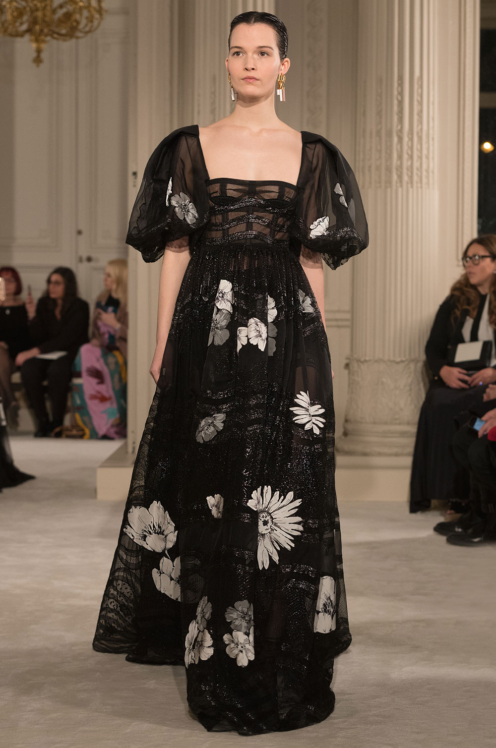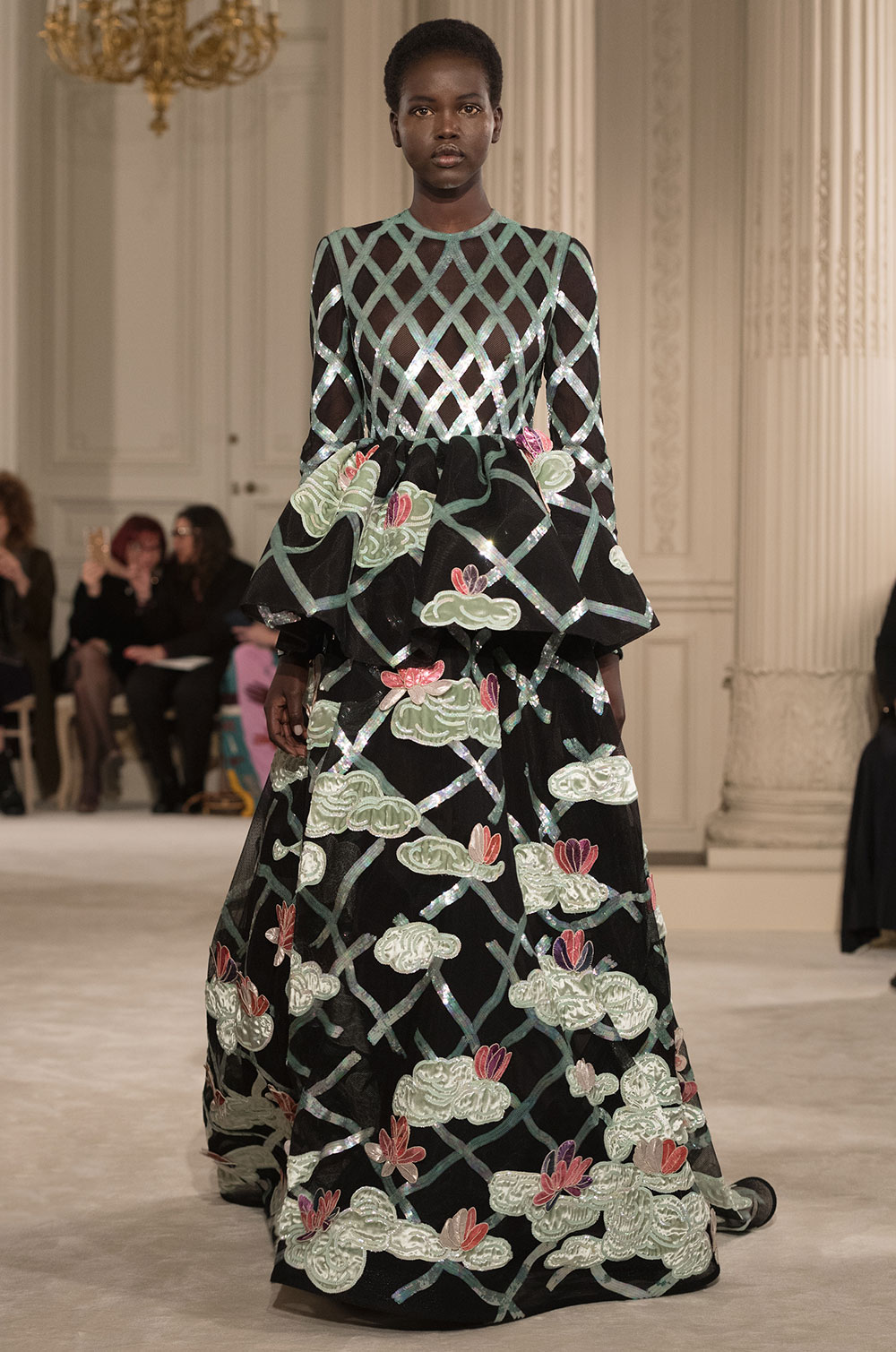 黒いシフォンの花柄は象嵌で剥いであり、レースモチーフは丁寧に繋がれている。ビスチュエドレスの下にちらっと覗くアンダードレスの色など、着る人だけが楽しめる秘めたディテールがラグジュアリーを感じさせる。イブニングドレスには両脇ポケットが付き、エスコートされなくても歩ける今の女性たちのドレスだ。