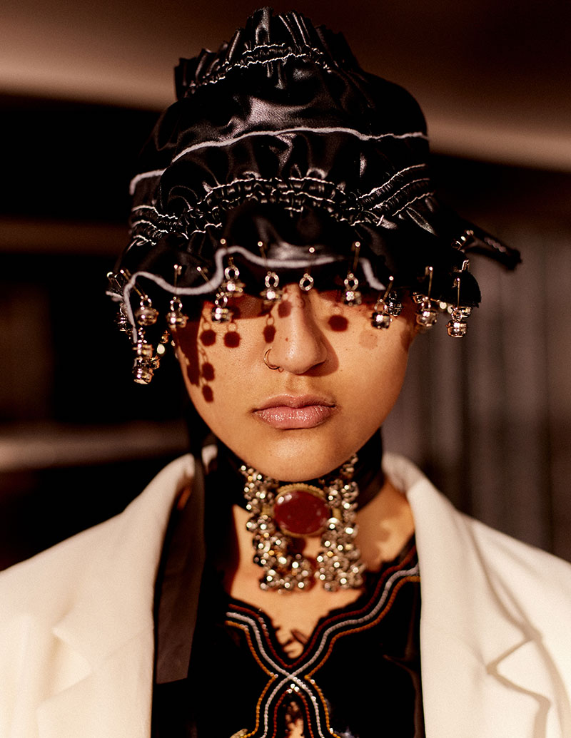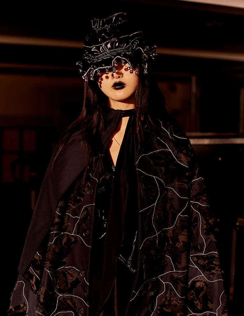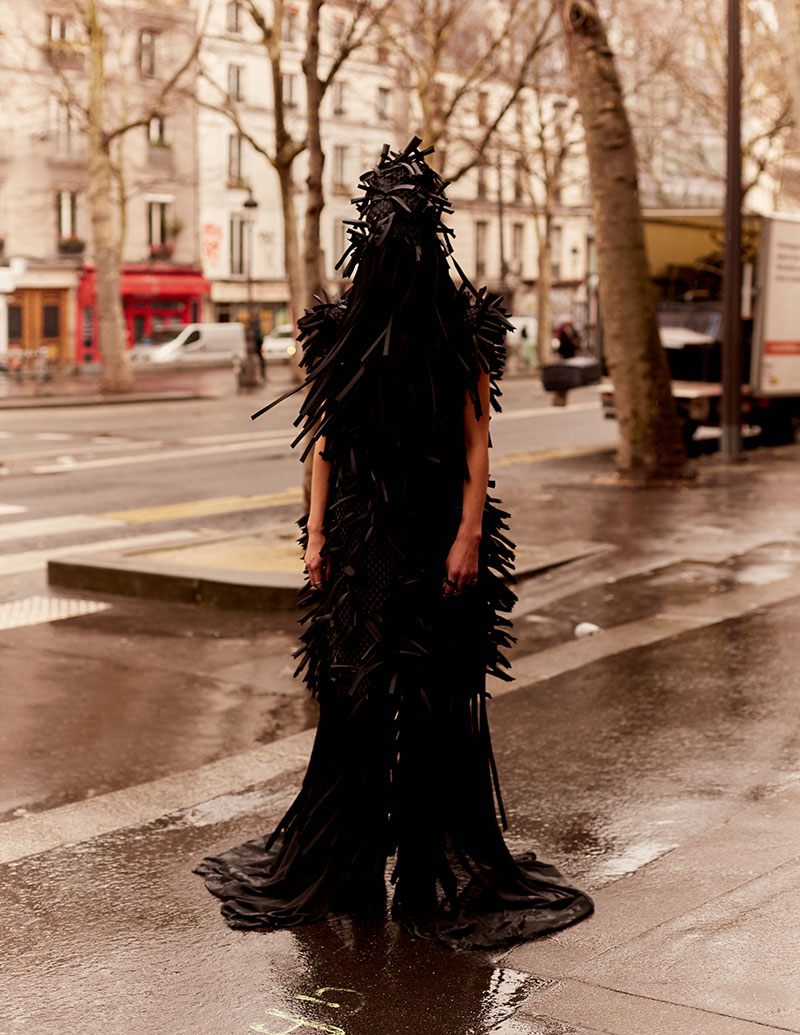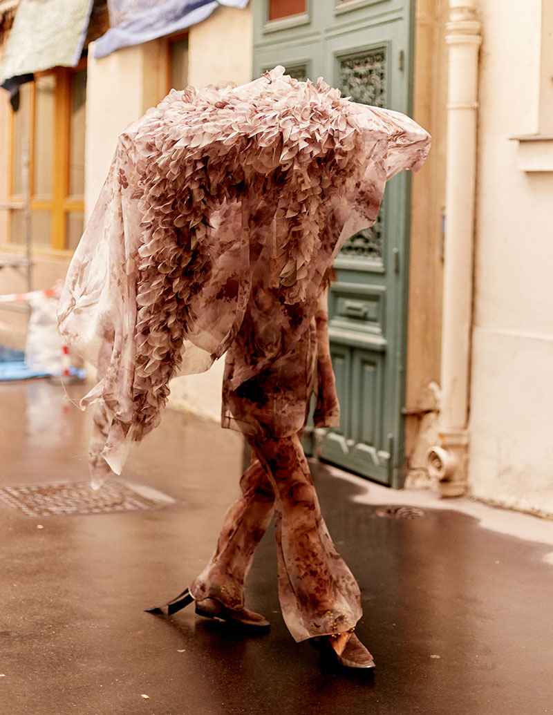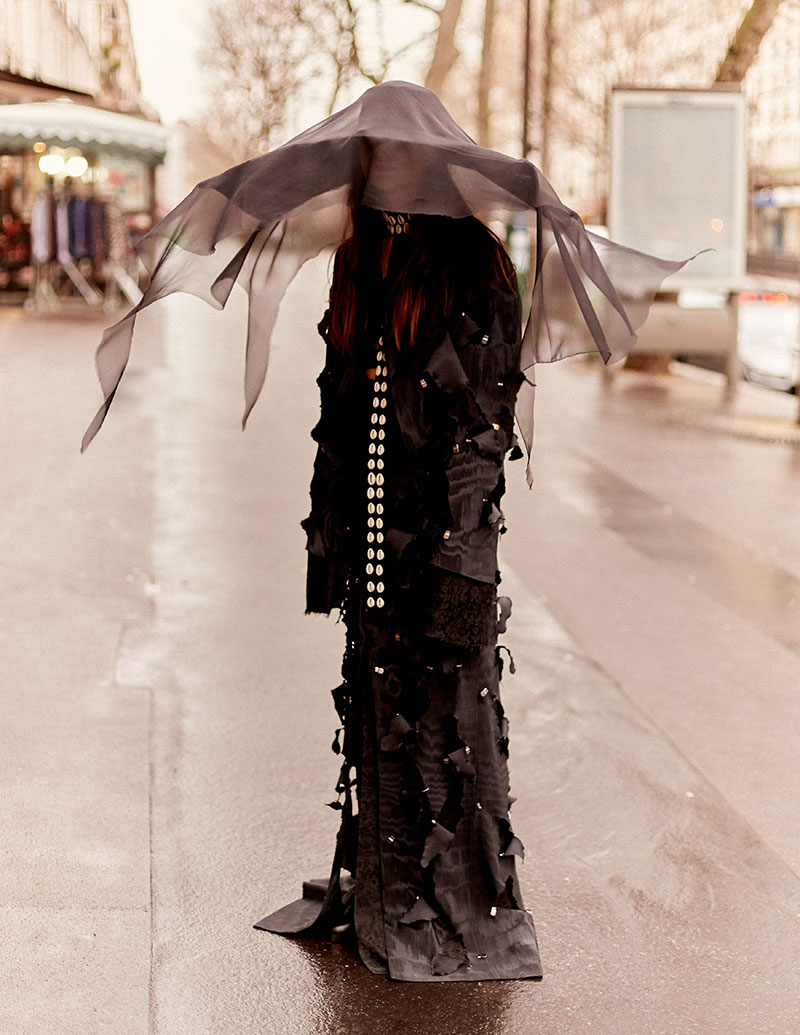 シルクプリントの広いトリムの帽子、レザーやデニムで目まで覆うハットには貝やメタル、リボンが装飾されている。パリのゴミ袋のような黒いプラスチックバッグやテントのように羽織るコートが印象的だ。混沌としたパリの街を感じさせる。強い服なのに、どこか儚げな余韻を感じさせるのが Hyun Mi Nielsen の魅力かもしれない。