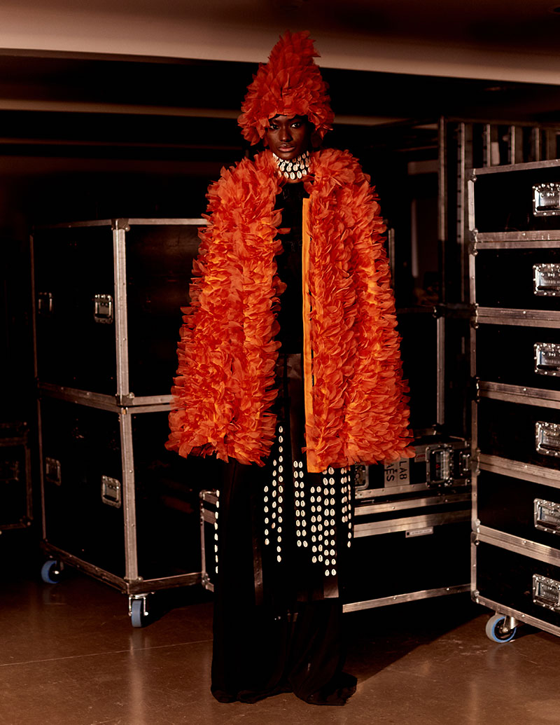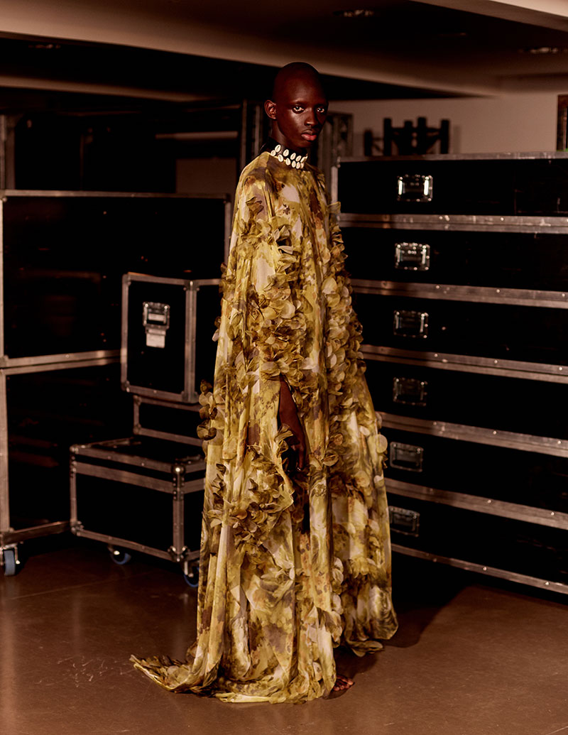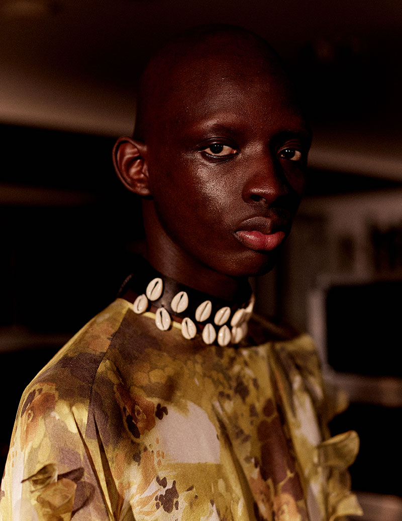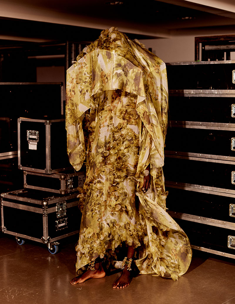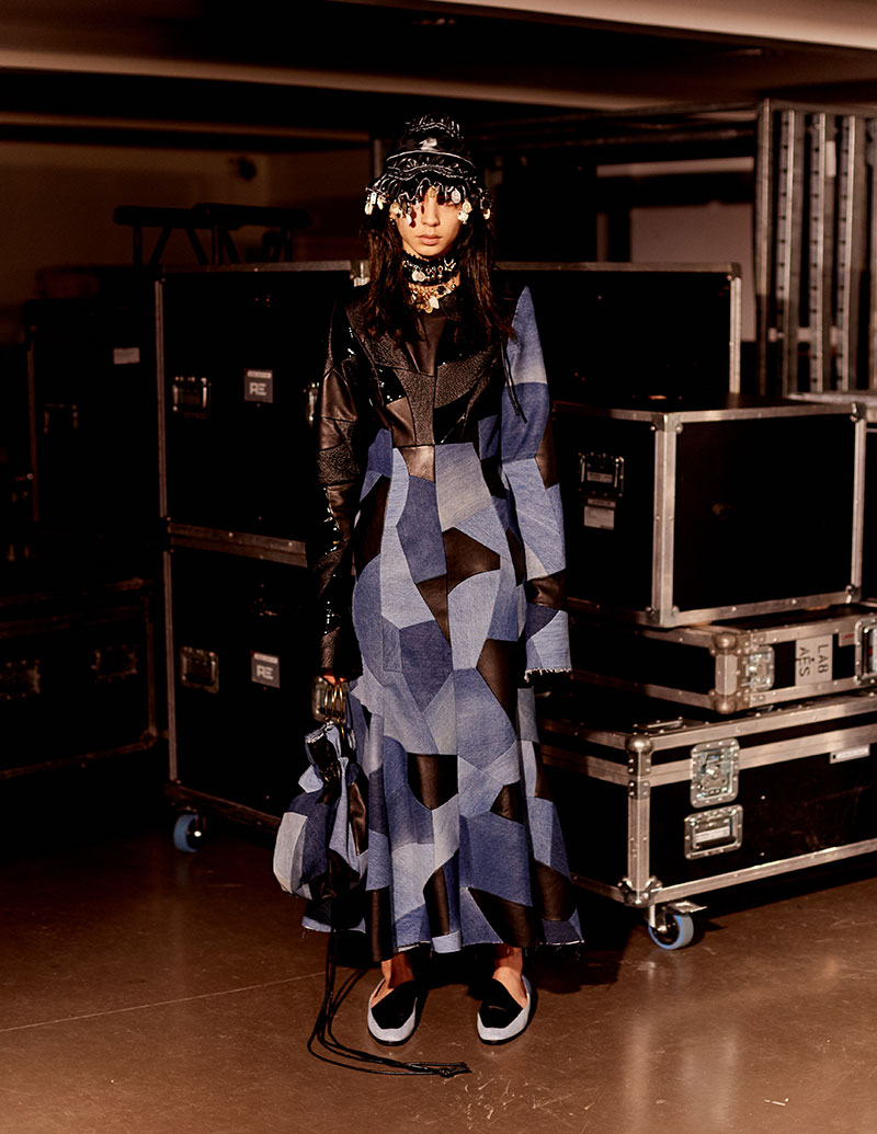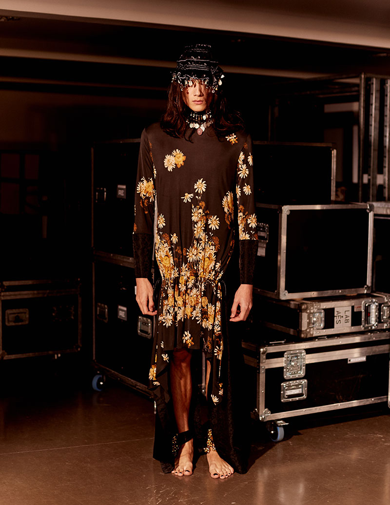PVC やレザーで丹念に作られたパーツをつなげるドレスには、シルバーメタルやスタッズでエッジを効かせている。ヴィンテージ布のパーツはパッチワークされ、ランダムな布端が飾られている。美しいプリントドレスには量感たっぷりのジャケットを合わせメンズモデルも登場した。シルクのジャケットや A ラインに広がるパンツは無駄のないカッティングでボディと寄り添いながら風になびいている。