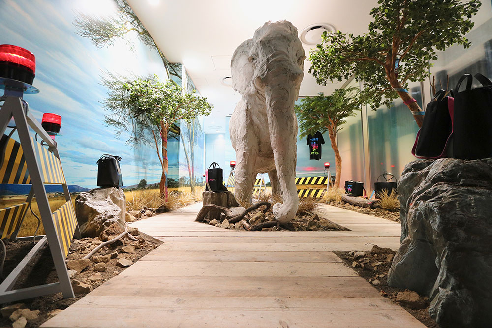 インスタレーションでは、タイトルの「Natural Habitat」が意味する「生息地」をコンセプトにイベントスペースの象の彫刻を活かして、サバンナを表現。石や木、草などを用いることで、サバンナの朝焼けや夕焼けを感じるようなインスタレーションに仕上げられている。