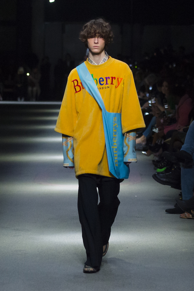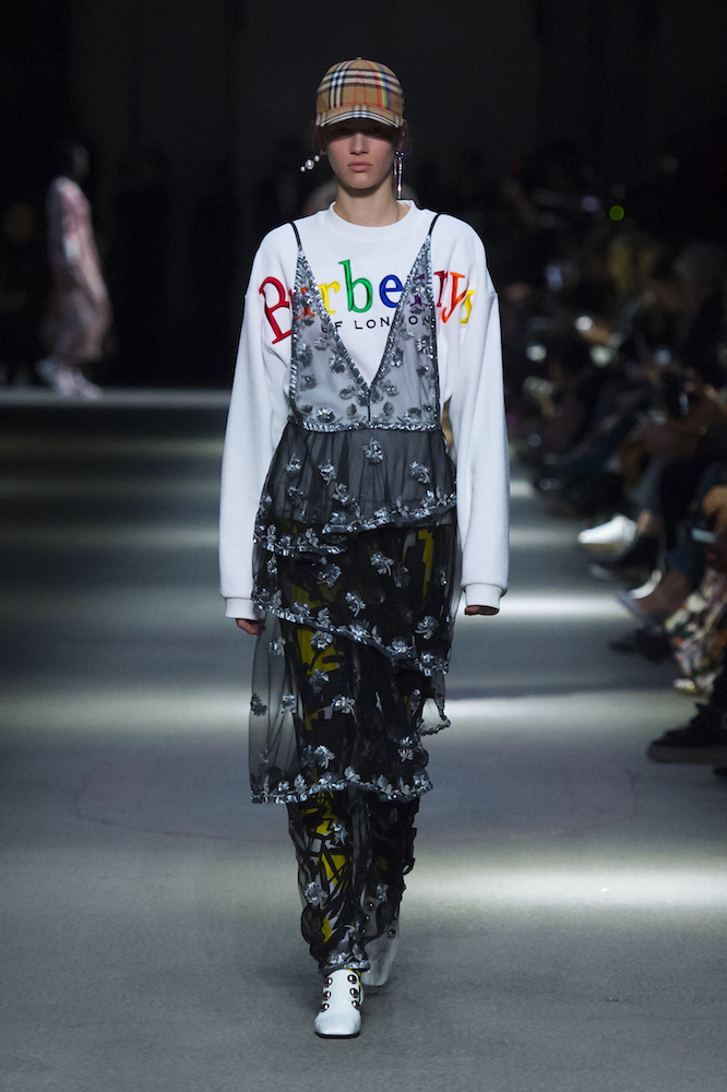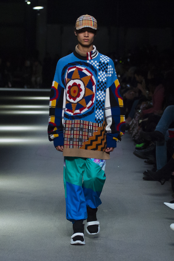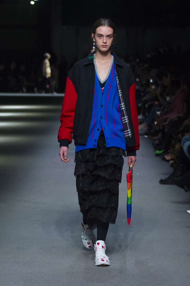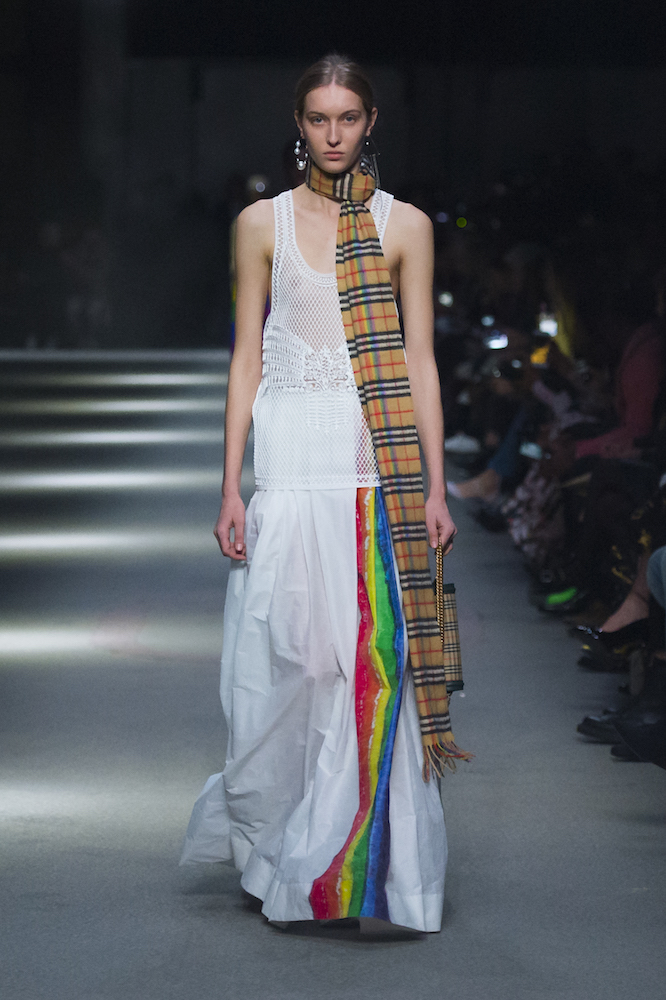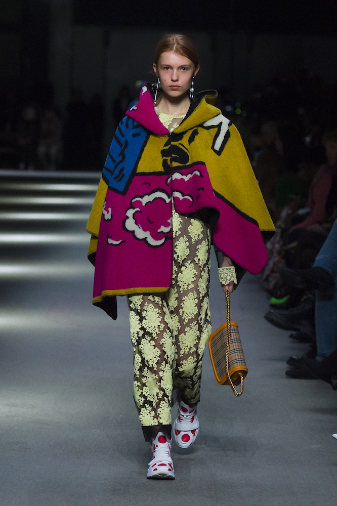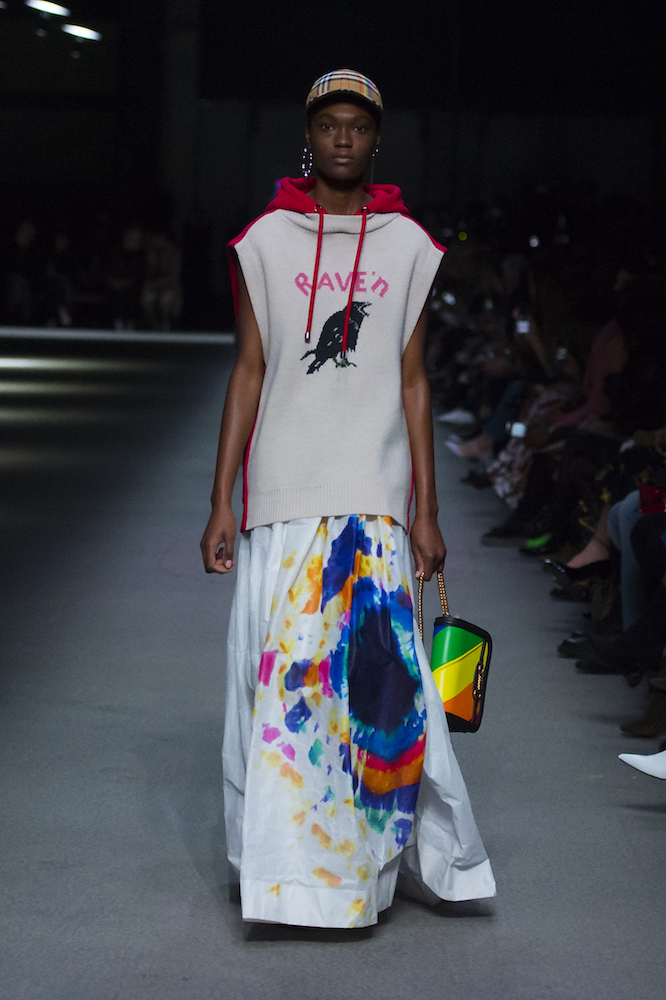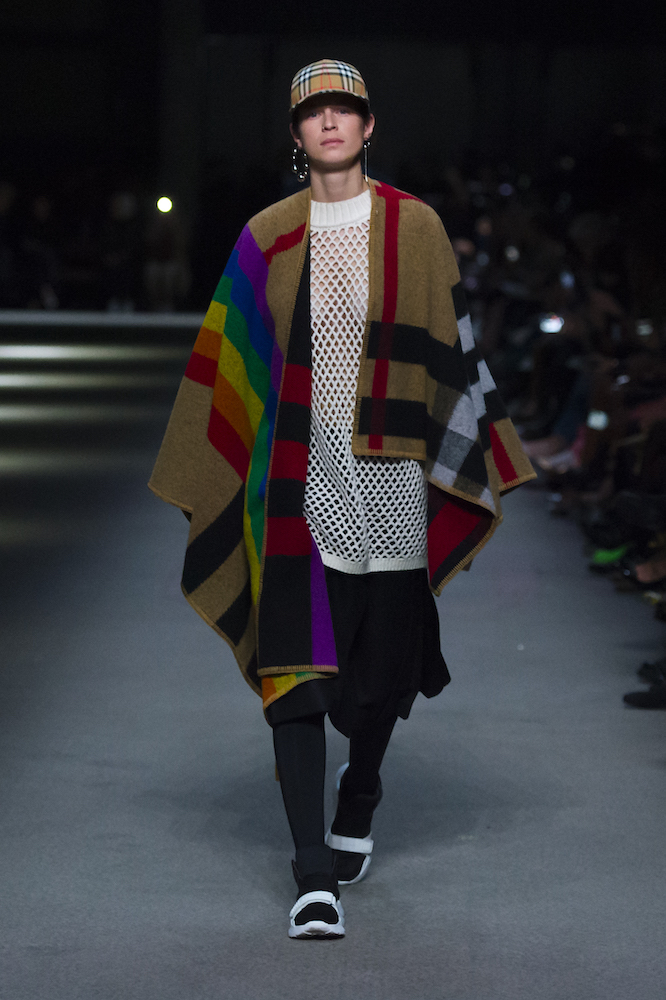 コレクションのテーマは「Time」。Burberry の過去、現在、未来をデザインした。昔のロゴやアーカイブアイテムが最新のテクニックでモダンに仕上げられている。シルクのプリントスカーフとバーバリーチェックをつなぎ合わせたコンビネゾンやブルゾン。ざっくりしたニットに重ねる刺しゅうドレスはビニールコーティングされポップな光沢がある。手の込んだ技だ。コートの重ね着や量感あるスタイリングにはスニーカーを合わせている。レインボーカラーを使ったチェック柄の大きなポンチョは一押しの