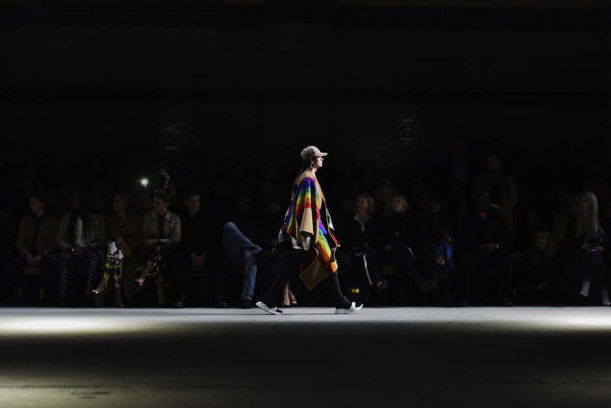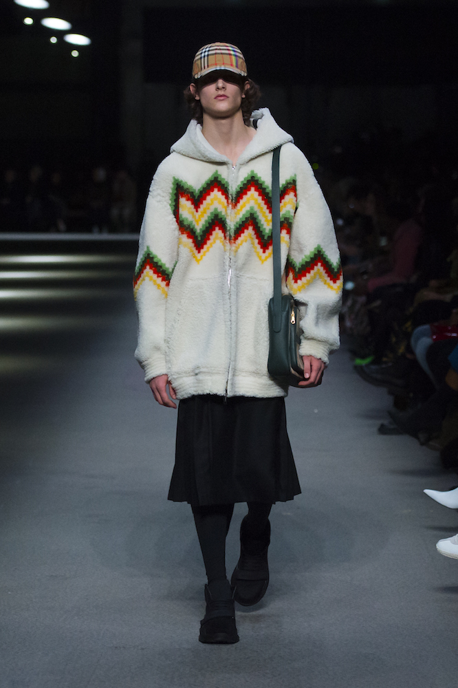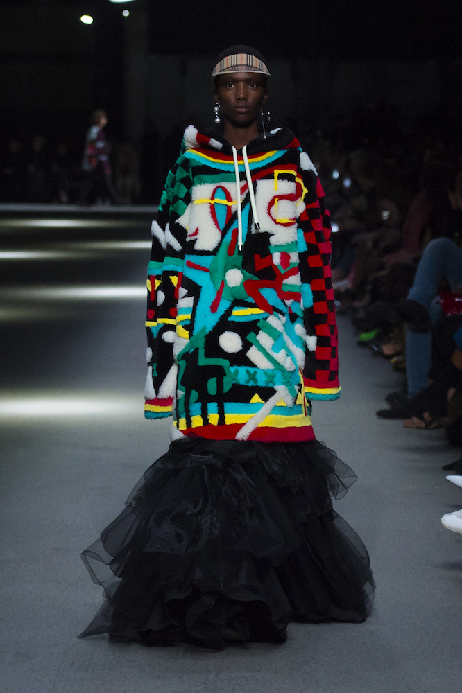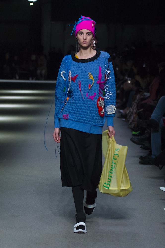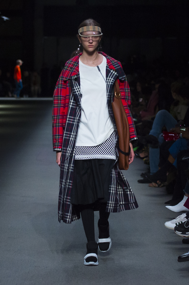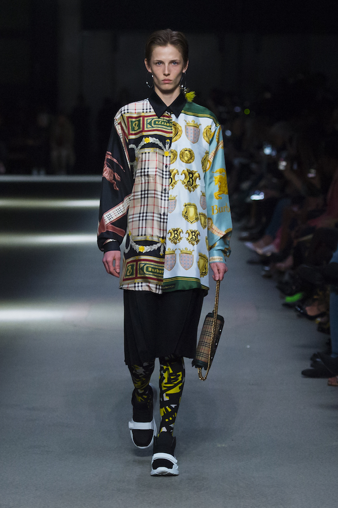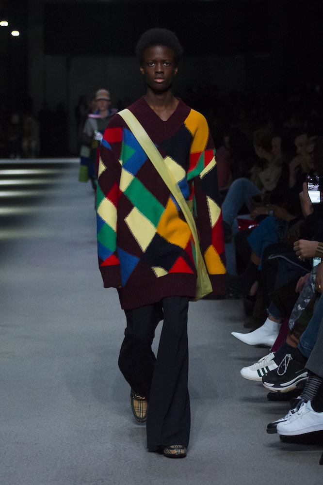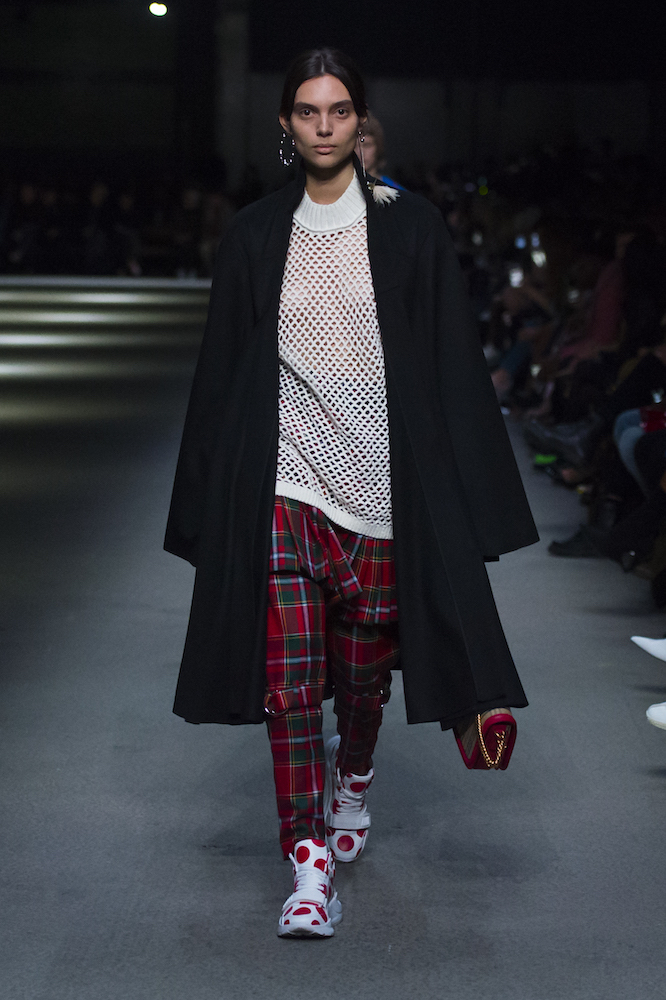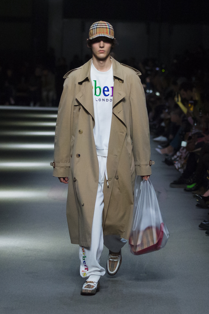 コレクションのテーマは「Time」。Burberry の過去、現在、未来をデザインした。昔のロゴやアーカイブアイテムが最新のテクニックでモダンに仕上げられている。シルクのプリントスカーフとバーバリーチェックをつなぎ合わせたコンビネゾンやブルゾン。ざっくりしたニットに重ねる刺しゅうドレスはビニールコーティングされポップな光沢がある。手の込んだ技だ。コートの重ね着や量感あるスタイリングにはスニーカーを合わせている。レインボーカラーを使ったチェック柄の大きなポンチョは一押しの