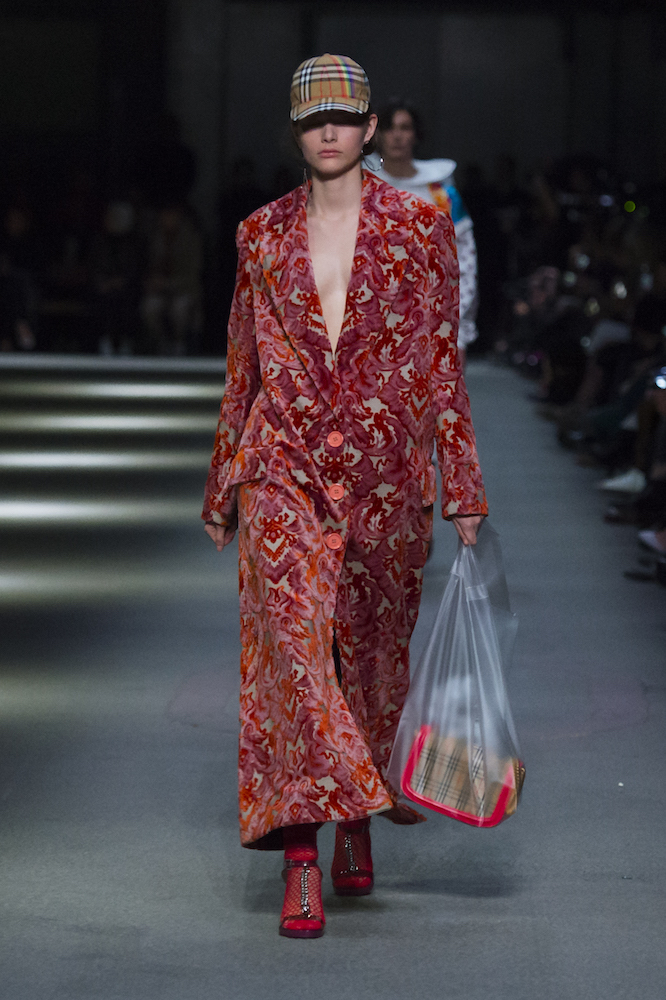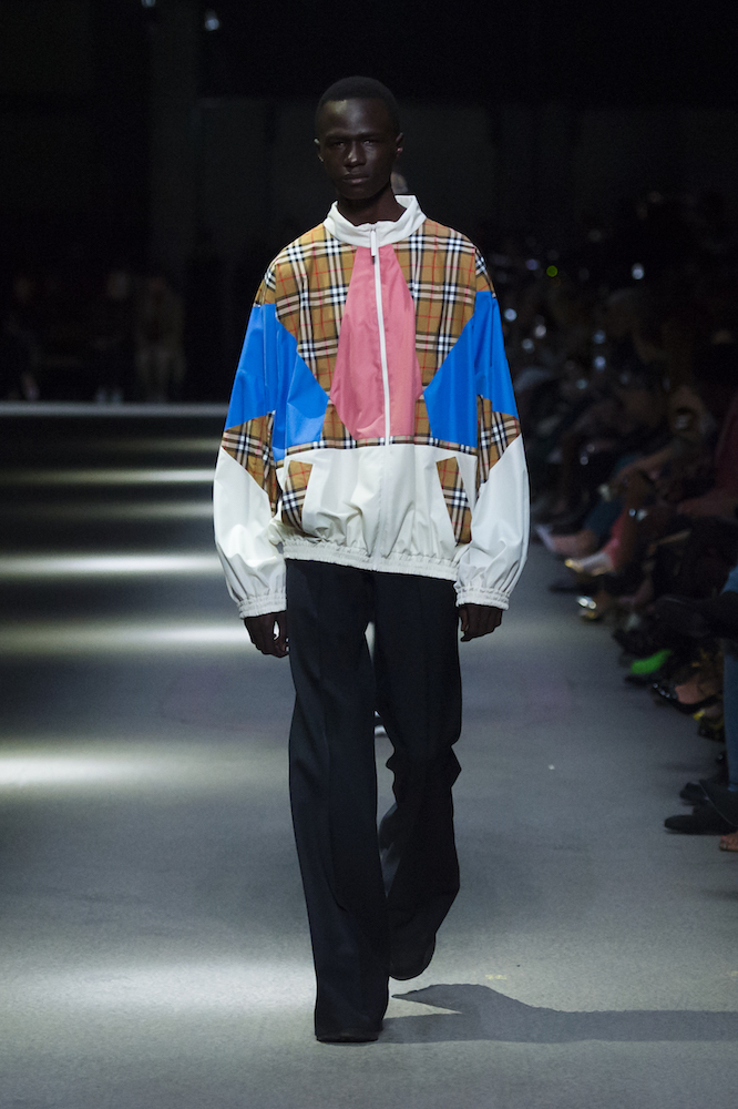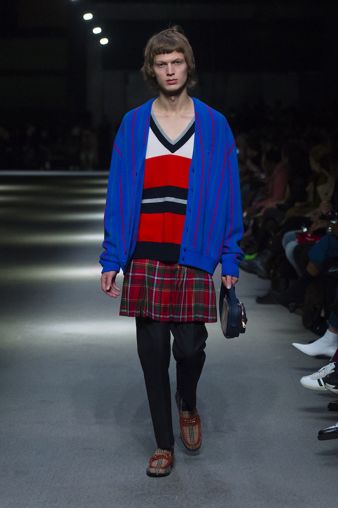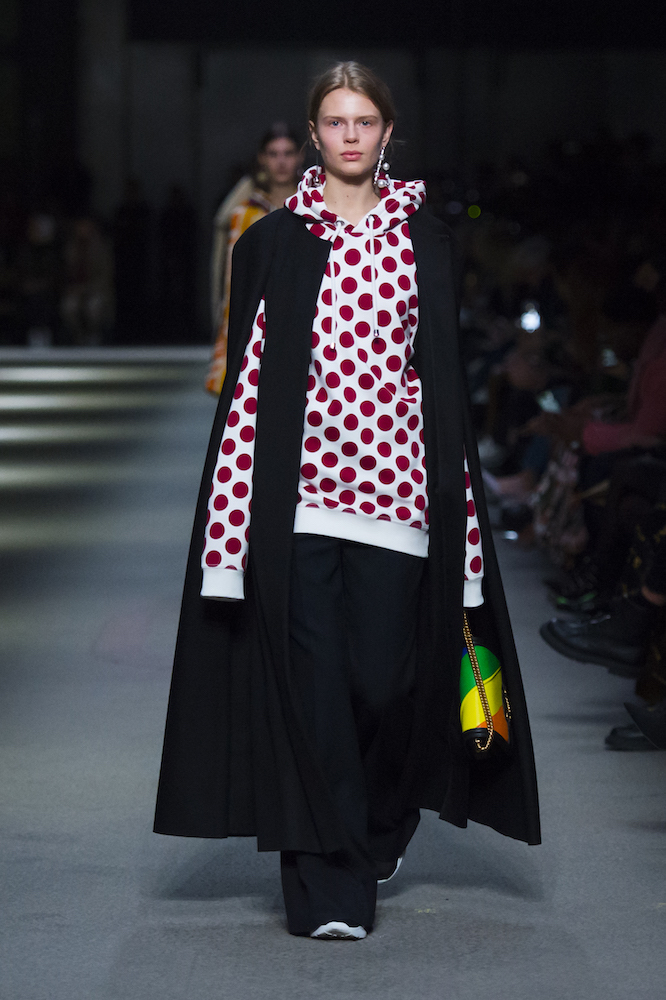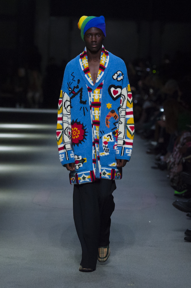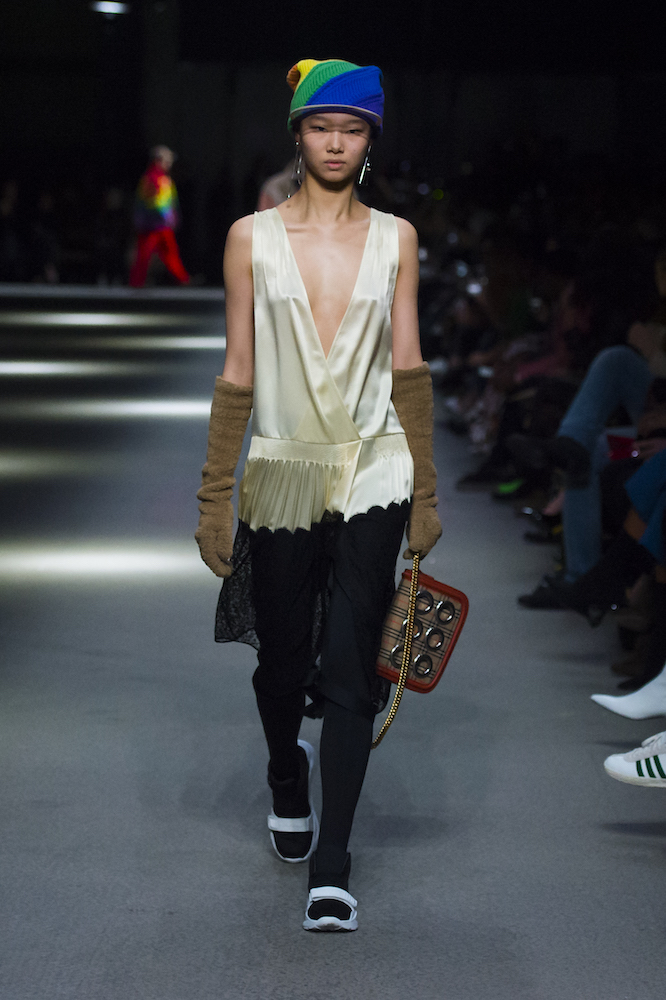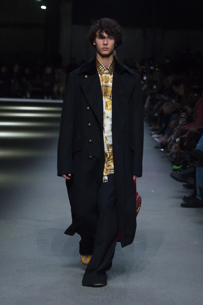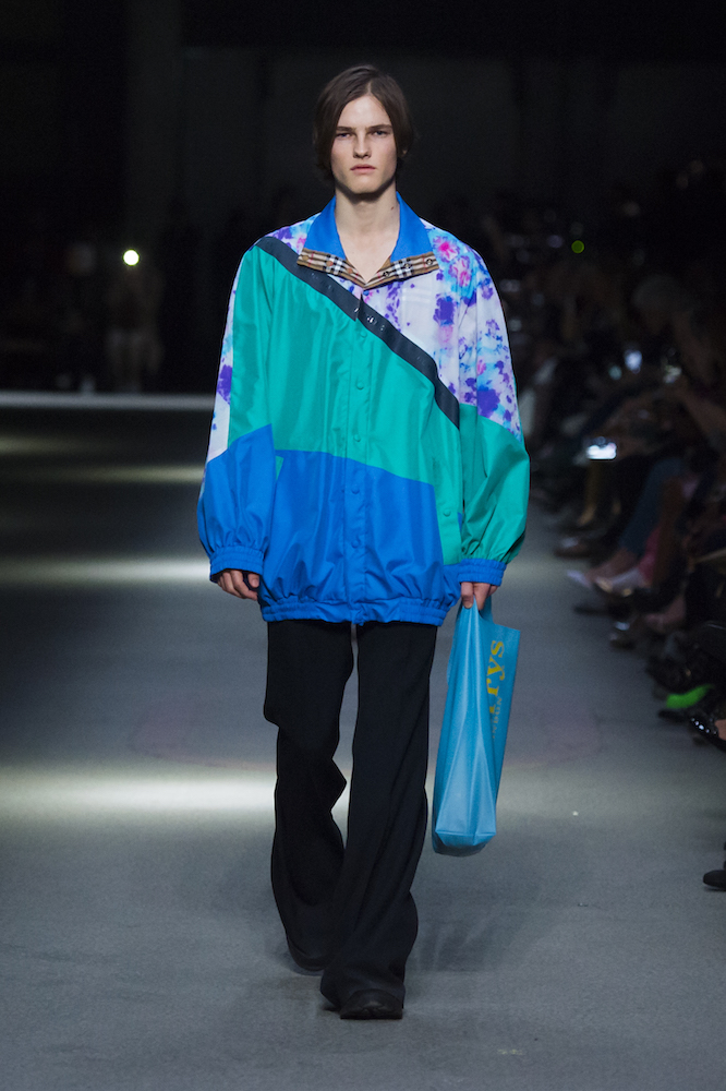 コレクションのテーマは「Time」。Burberry の過去、現在、未来をデザインした。昔のロゴやアーカイブアイテムが最新のテクニックでモダンに仕上げられている。シルクのプリントスカーフとバーバリーチェックをつなぎ合わせたコンビネゾンやブルゾン。ざっくりしたニットに重ねる刺しゅうドレスはビニールコーティングされポップな光沢がある。手の込んだ技だ。コートの重ね着や量感あるスタイリングにはスニーカーを合わせている。レインボーカラーを使ったチェック柄の大きなポンチョは一押しの