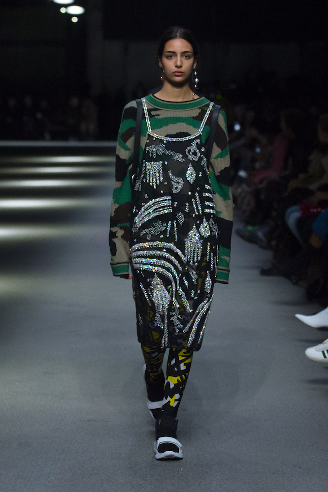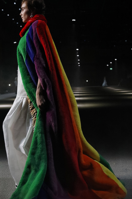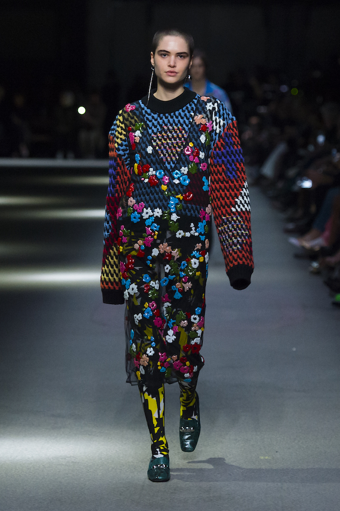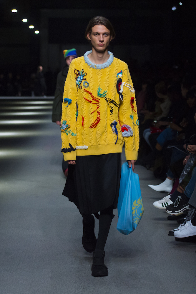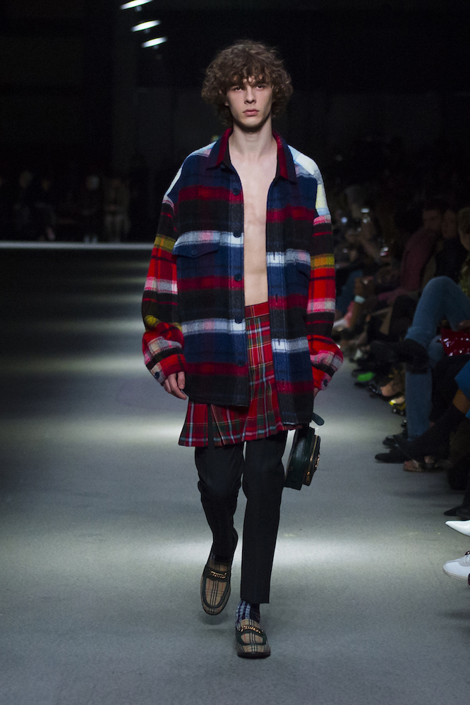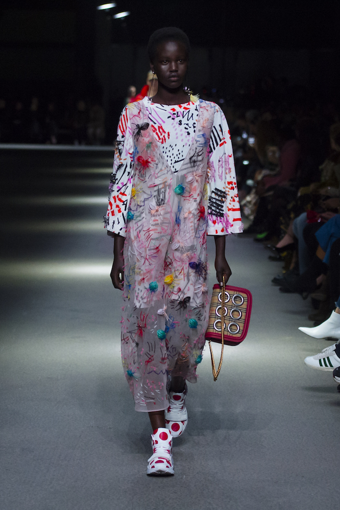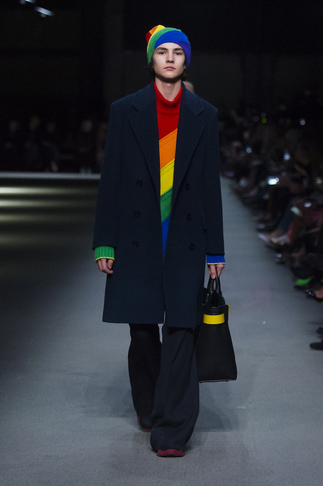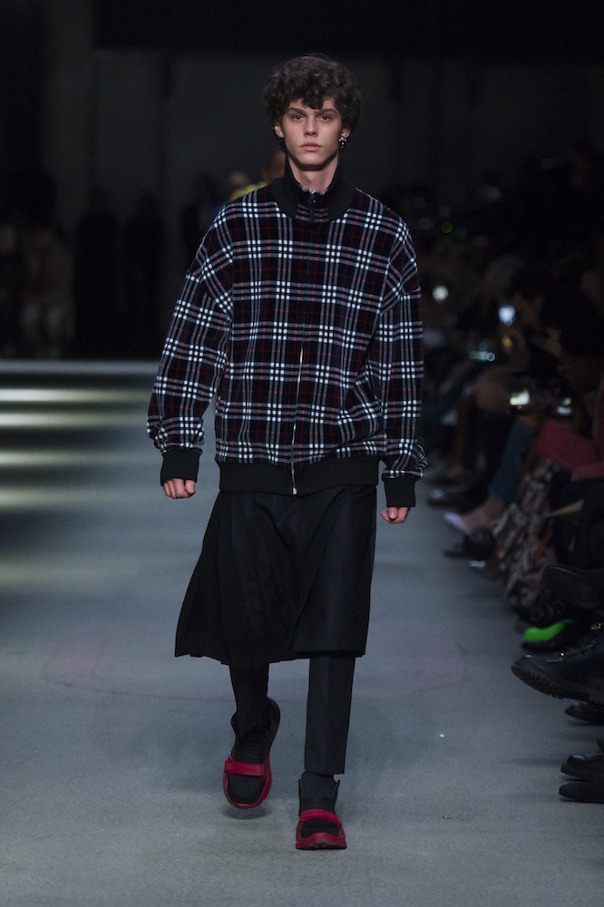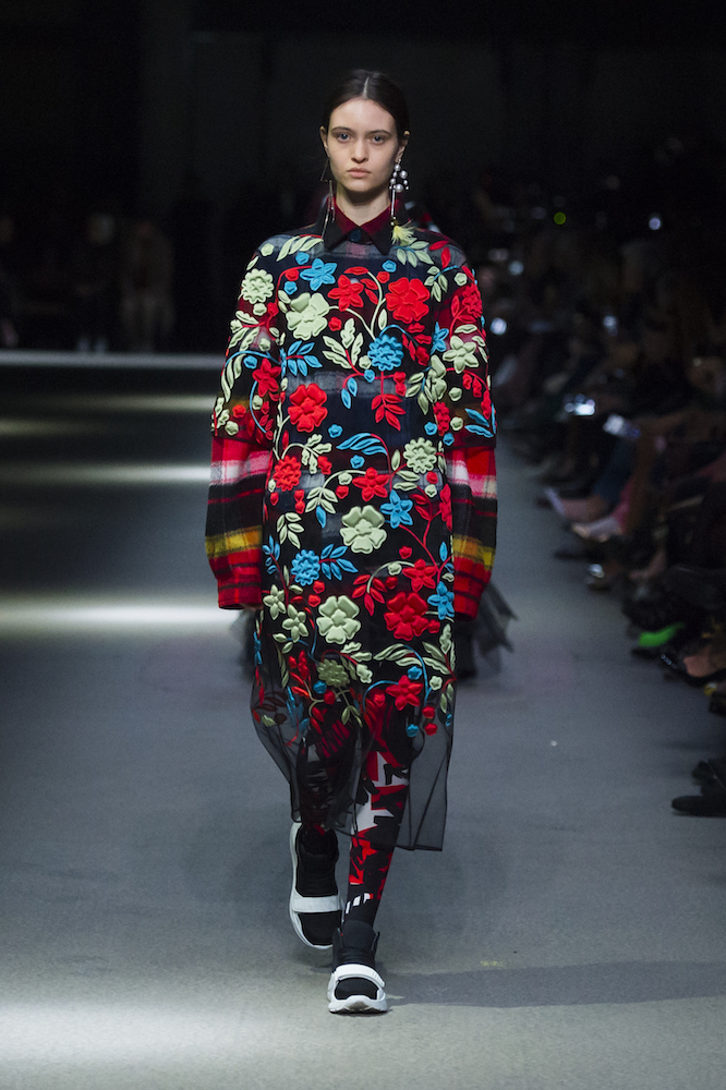 コレクションのテーマは「Time」。Burberry の過去、現在、未来をデザインした。昔のロゴやアーカイブアイテムが最新のテクニックでモダンに仕上げられている。シルクのプリントスカーフとバーバリーチェックをつなぎ合わせたコンビネゾンやブルゾン。ざっくりしたニットに重ねる刺しゅうドレスはビニールコーティングされポップな光沢がある。手の込んだ技だ。コートの重ね着や量感あるスタイリングにはスニーカーを合わせている。レインボーカラーを使ったチェック柄の大きなポンチョは一押しの