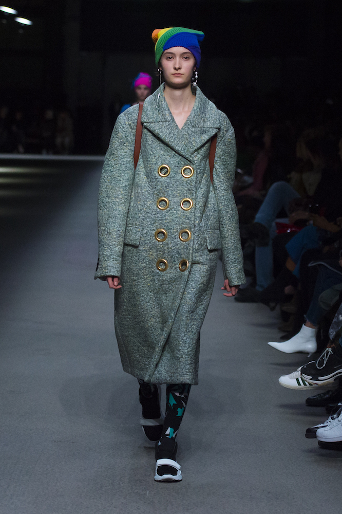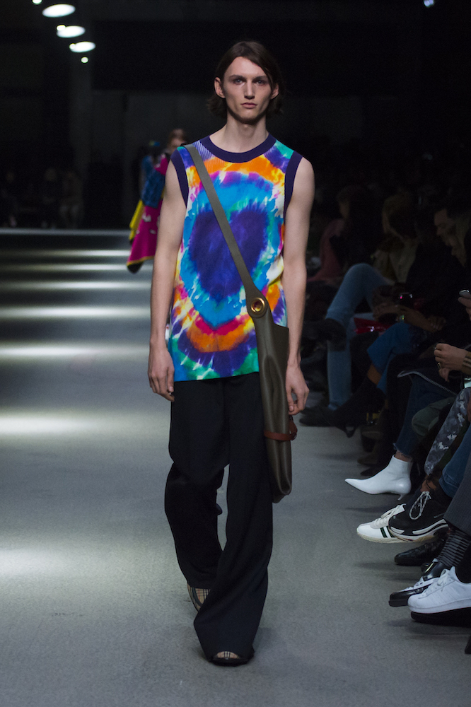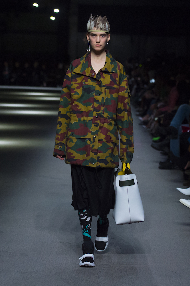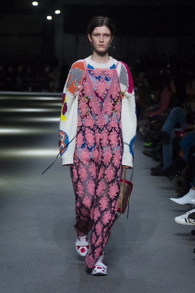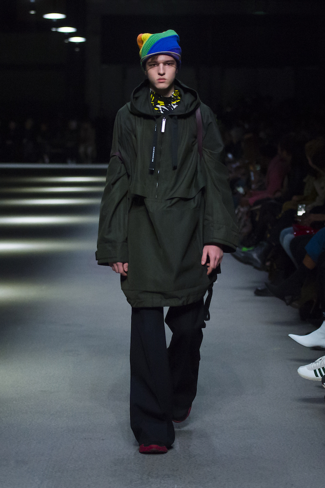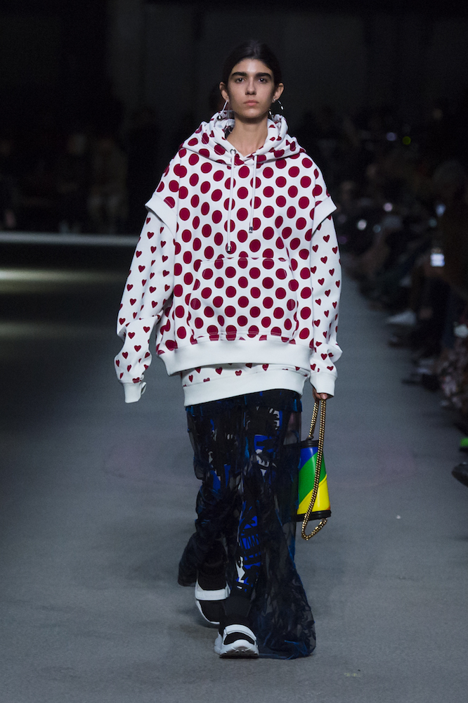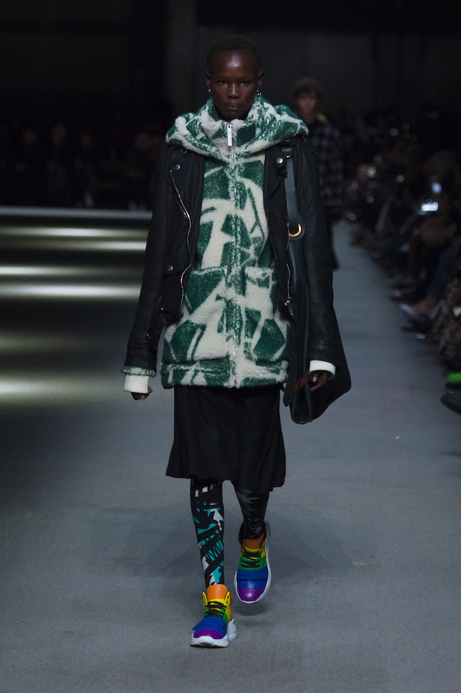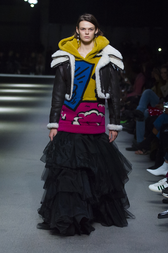 コレクションのテーマは「Time」。Burberry の過去、現在、未来をデザインした。昔のロゴやアーカイブアイテムが最新のテクニックでモダンに仕上げられている。シルクのプリントスカーフとバーバリーチェックをつなぎ合わせたコンビネゾンやブルゾン。ざっくりしたニットに重ねる刺しゅうドレスはビニールコーティングされポップな光沢がある。手の込んだ技だ。コートの重ね着や量感あるスタイリングにはスニーカーを合わせている。レインボーカラーを使ったチェック柄の大きなポンチョは一押しの