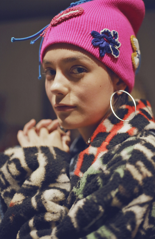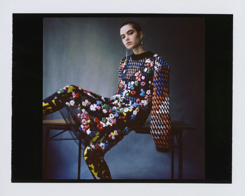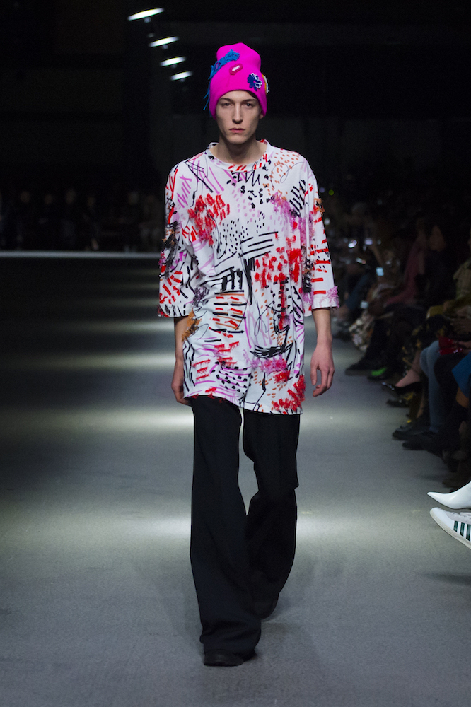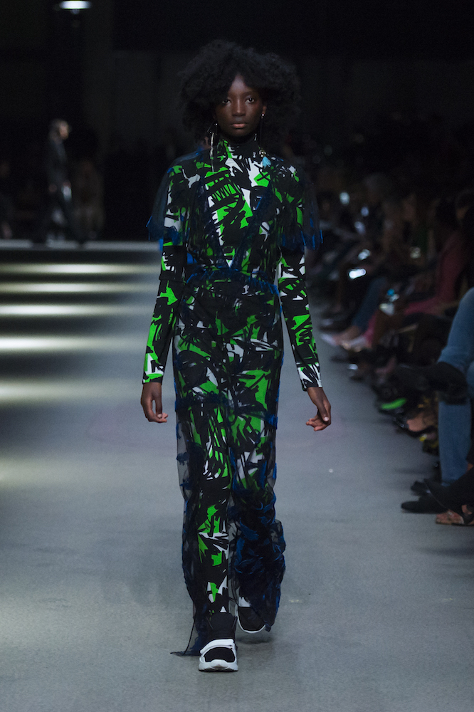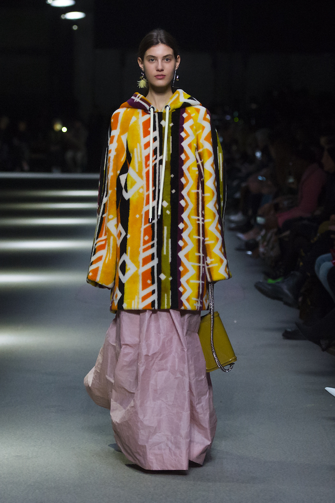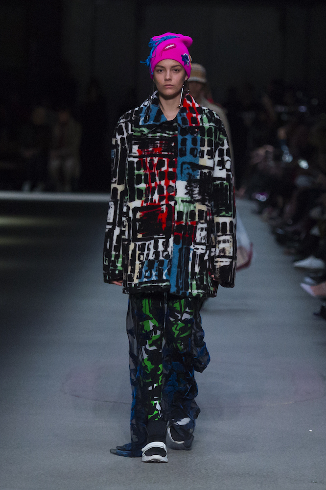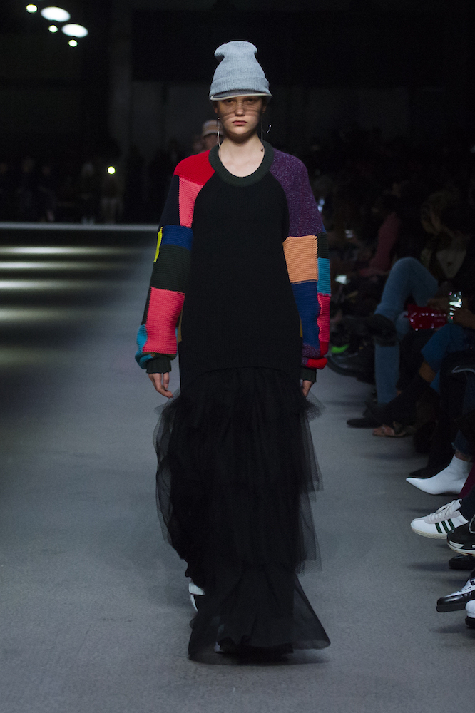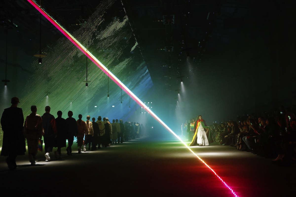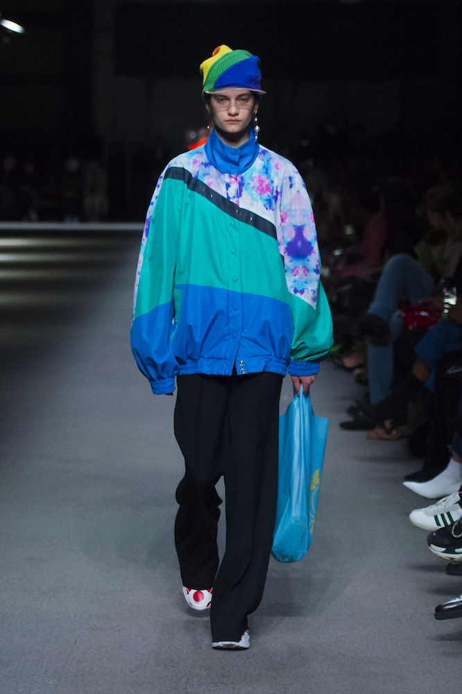 コレクションのテーマは「Time」。Burberry の過去、現在、未来をデザインした。昔のロゴやアーカイブアイテムが最新のテクニックでモダンに仕上げられている。シルクのプリントスカーフとバーバリーチェックをつなぎ合わせたコンビネゾンやブルゾン。ざっくりしたニットに重ねる刺しゅうドレスはビニールコーティングされポップな光沢がある。手の込んだ技だ。コートの重ね着や量感あるスタイリングにはスニーカーを合わせている。レインボーカラーを使ったチェック柄の大きなポンチョは一押しの
