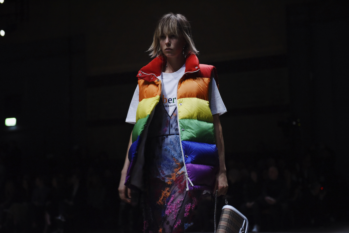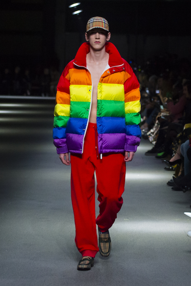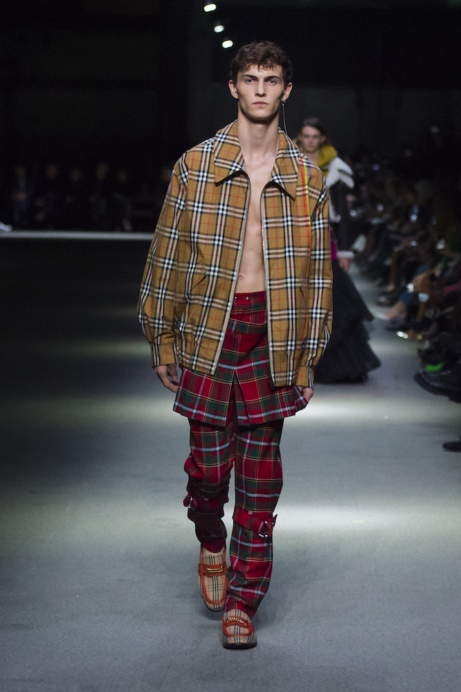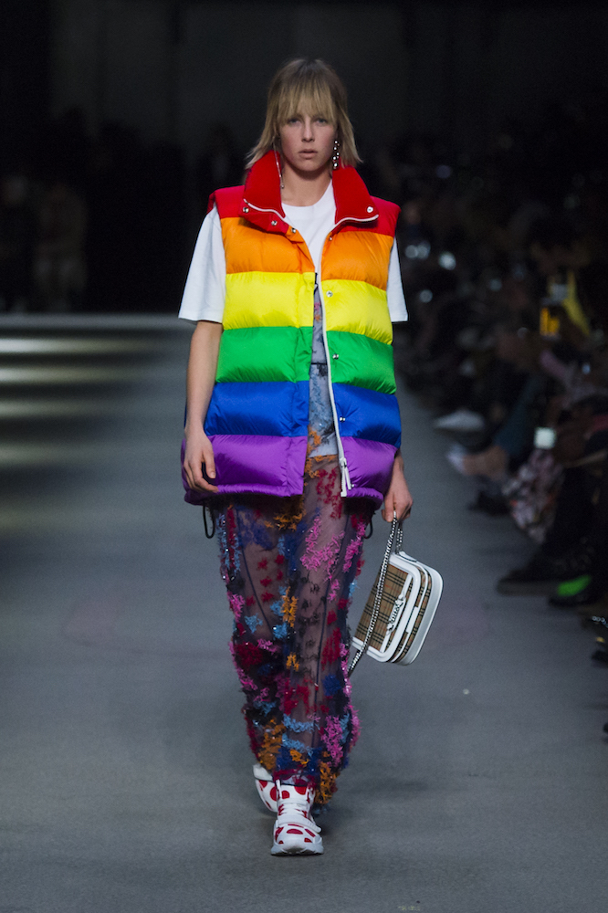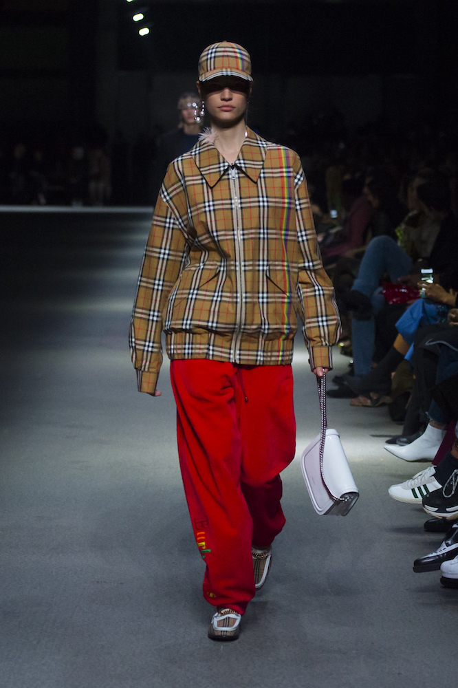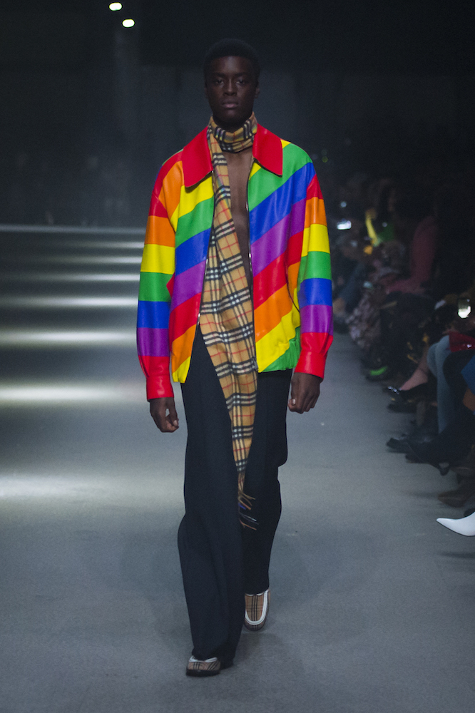 ファーストルックは量感あるフリースブルゾンにペーパークロスのガサガサっと音がするロングスカートだ。スカートにはレインボーカラーがペイントされている。レインボーは LGBTQ +への支援を意味した平和の象徴だ。クリストファーはこのレインボーを随所にちりばめた。インビテーションもバーバリーのヴィンテージチェックにレインボ