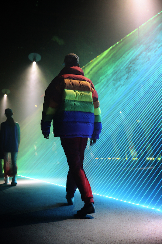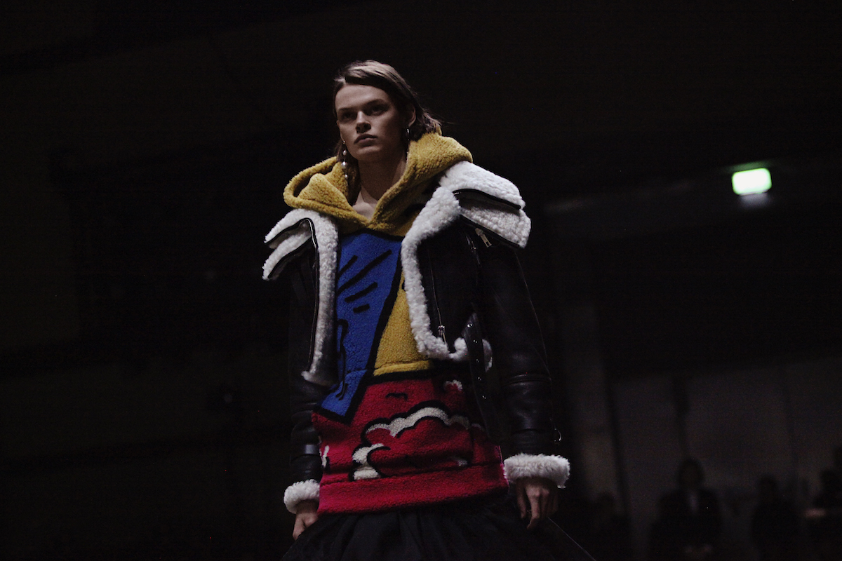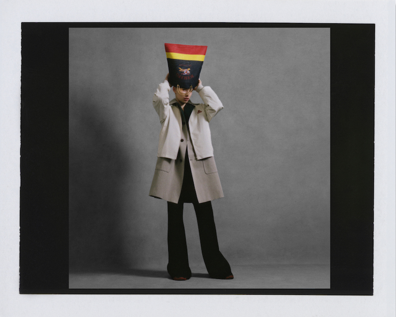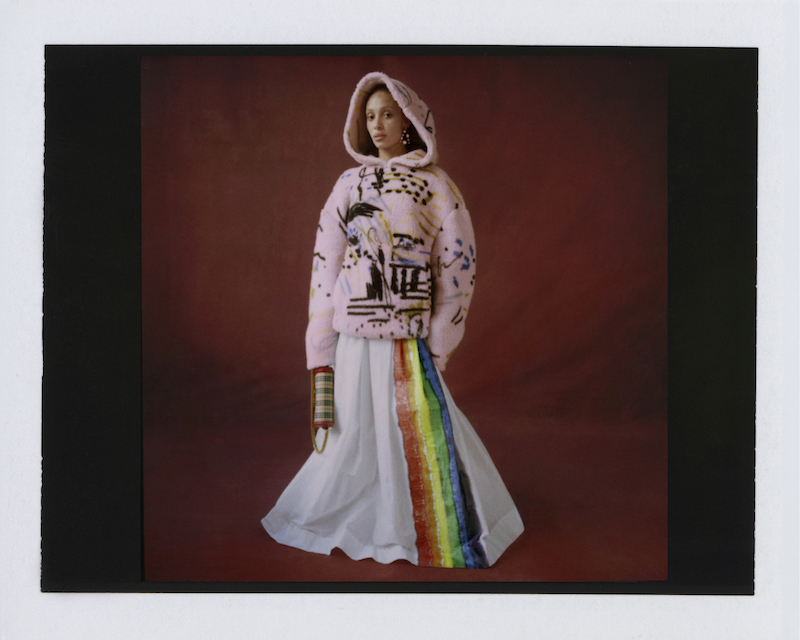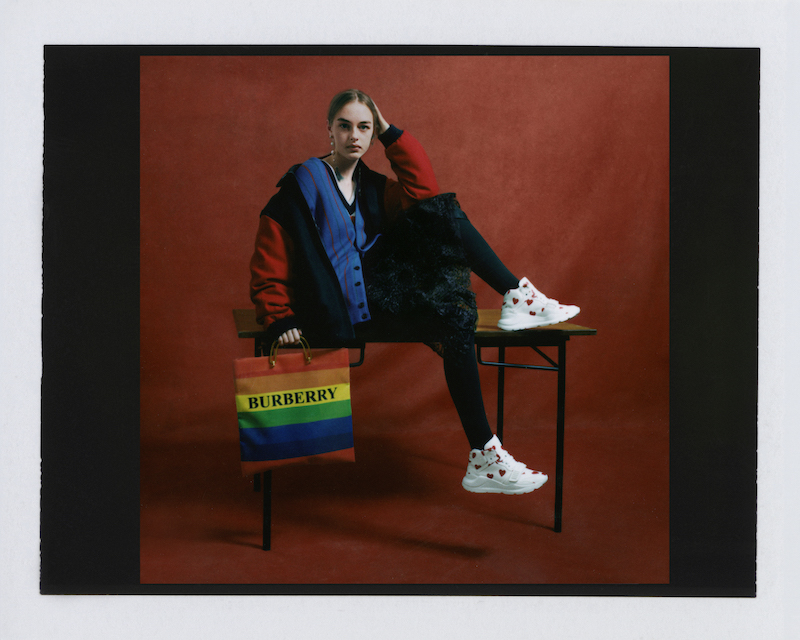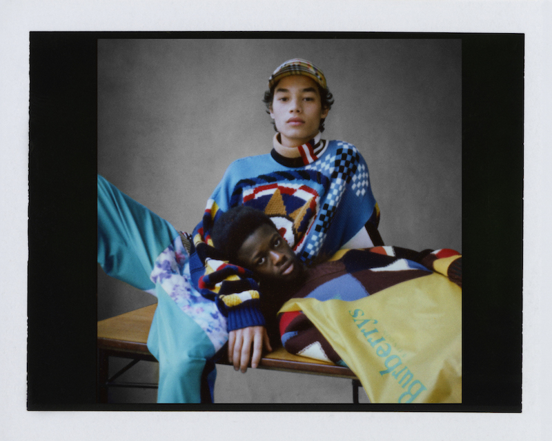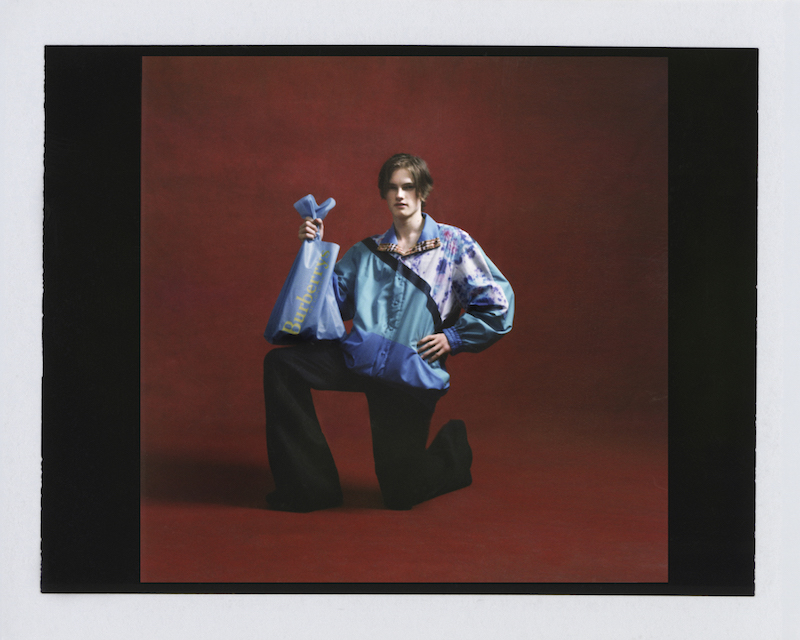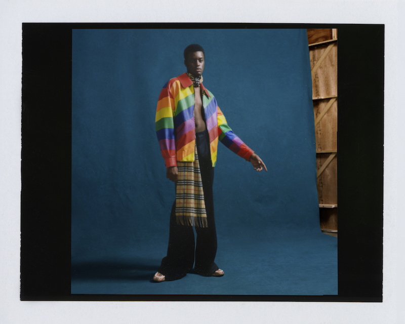ファーストルックは量感あるフリースブルゾンにペーパークロスのガサガサっと音がするロングスカートだ。スカートにはレインボーカラーがペイントされている。レインボーは LGBTQ +への支援を意味した平和の象徴だ。クリストファーはこのレインボーを随所にちりばめた。インビテーションもバーバリーのヴィンテージチェックにレインボ