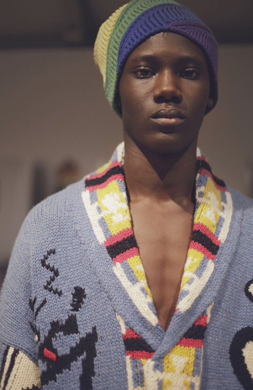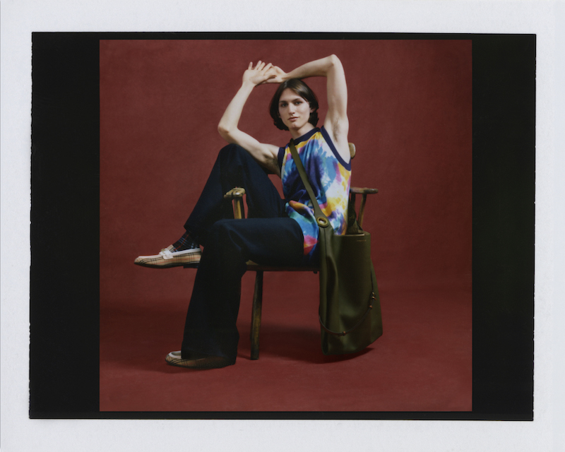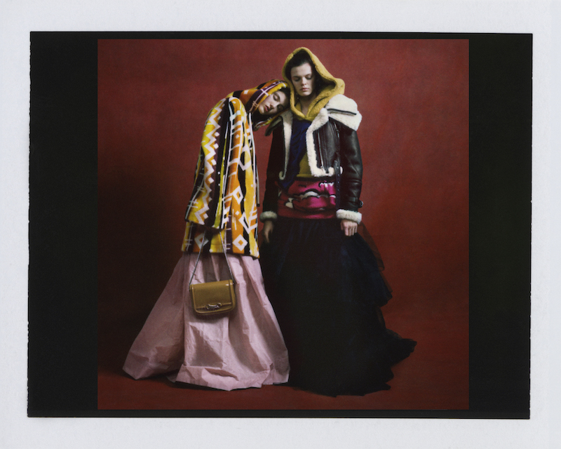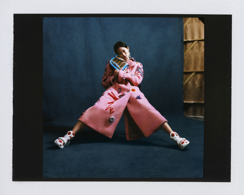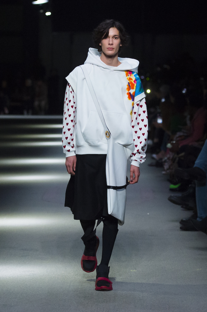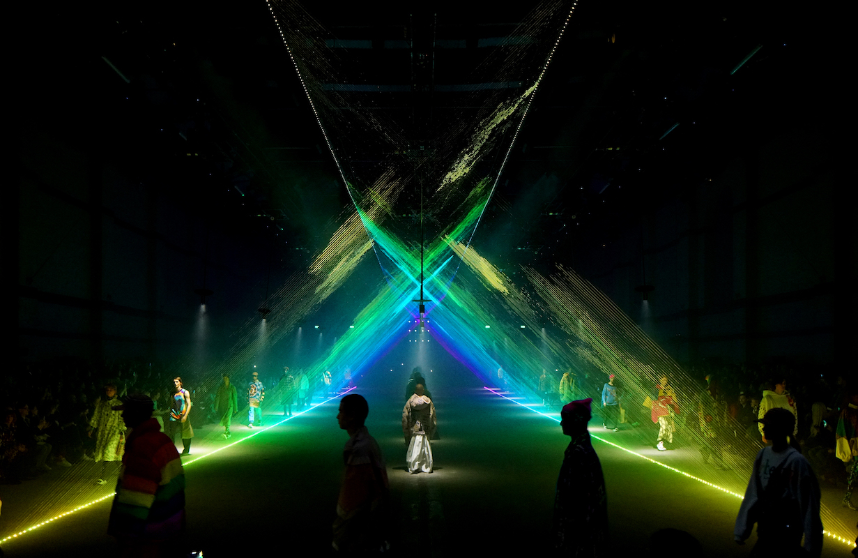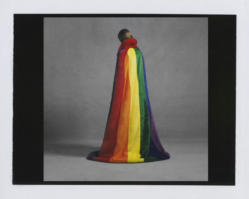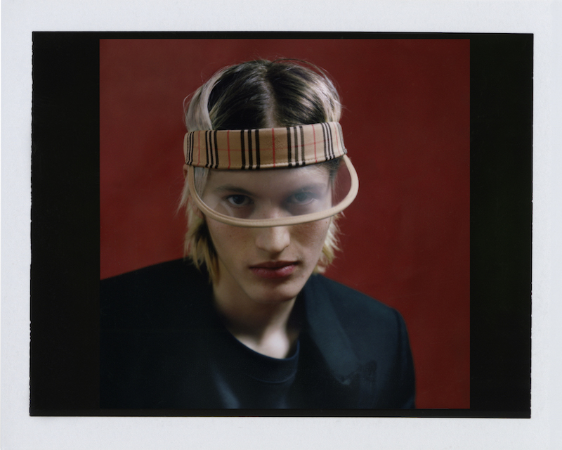 ファーストルックは量感あるフリースブルゾンにペーパークロスのガサガサっと音がするロングスカートだ。スカートにはレインボーカラーがペイントされている。レインボーは LGBTQ +への支援を意味した平和の象徴だ。クリストファーはこのレインボーを随所にちりばめた。インビテーションもバーバリーのヴィンテージチェックにレインボ