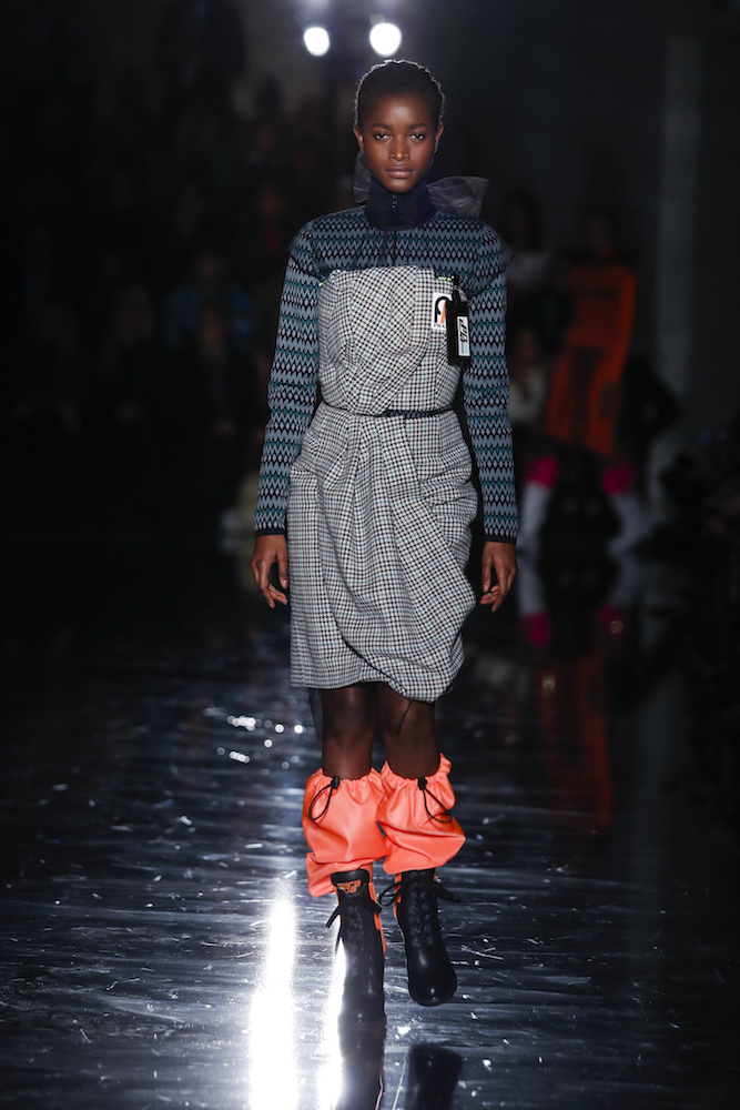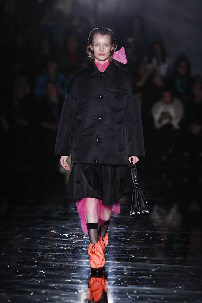 プラダの原点とも言える一斉を風靡したナイロンバッグ。そのパデッドナイロンのブラックドレスの下にグリーンやフューシャピンクのチュールドレスを重ねている。首元からボータイが、裾からスカートがランダムに覗く。手にはネオンカラーのバッグを重ねて持っている。ノースリーブドレスにチュールドレス、その上に量感あるコートドレスを重ねる。メルトンのざっくり感の下から繊細なディテールが女性らしさを強調する。