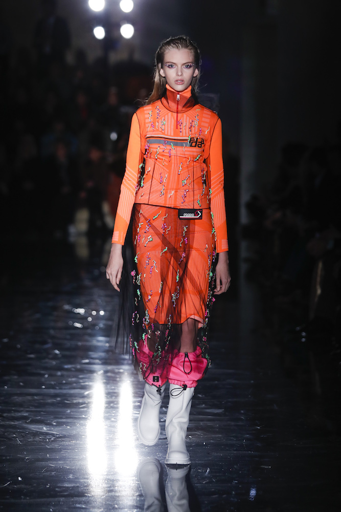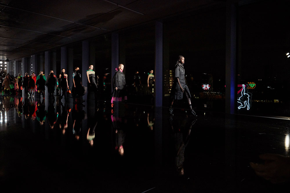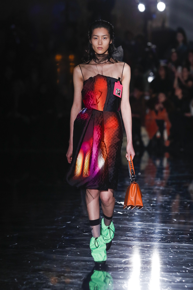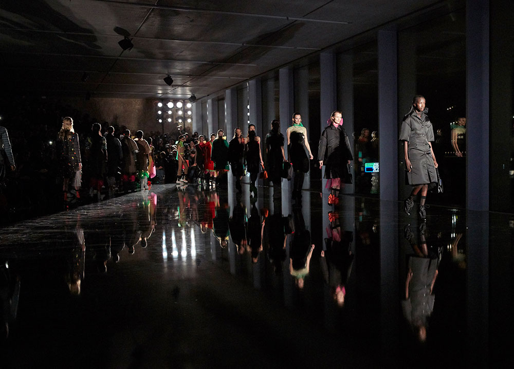 プラダの18-19AWコレクションはプラダ財団に建設中の新ビルディングで発表された。夜8時スタートのショー会場に着くと、周りの敷地にキッチュなネオンアートが飾られている。夜空まで巻き込む壮大なスケールだ。スケルトンエレベーターで5階まで上ると一面のガラス窓にネオンが反射している。今シーズンのコレクションテーマは、このタワーから見下ろしたネオンだ。リネアロッサ(プラダスポーツ)を取り入れたレイヤードスタイルで新しいフェミニティを打ち出した。