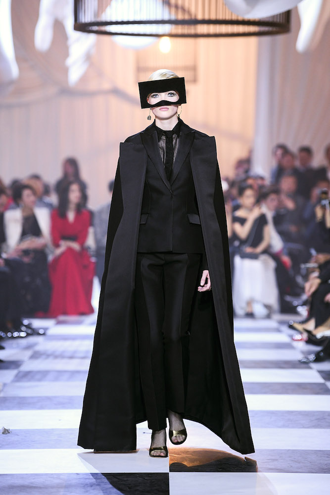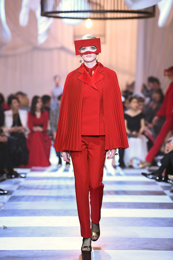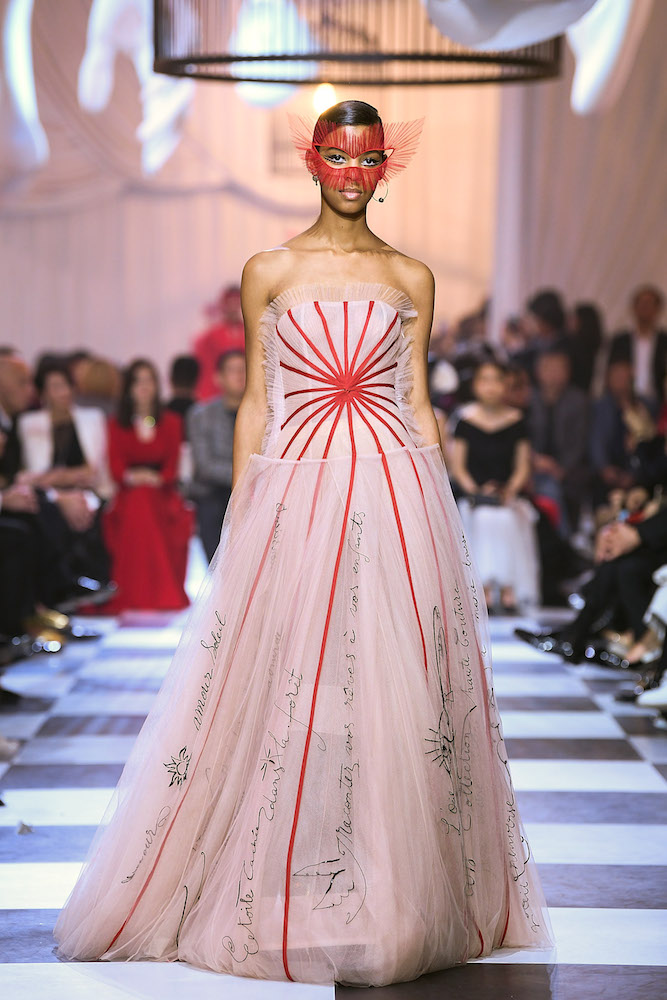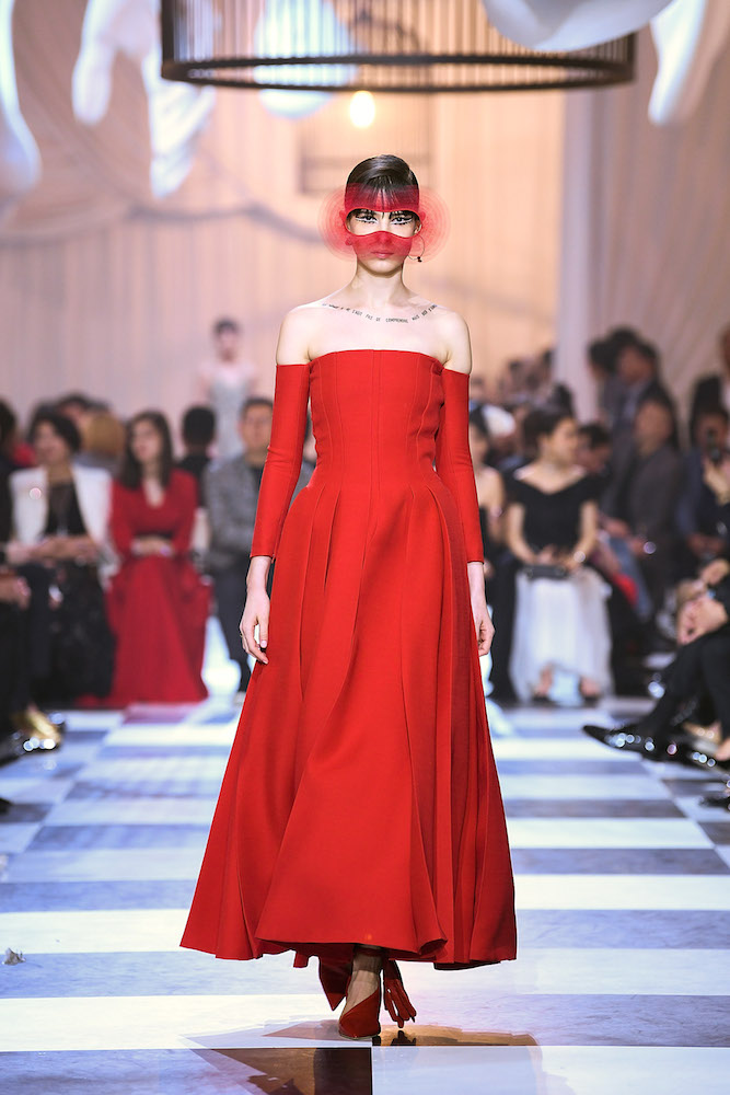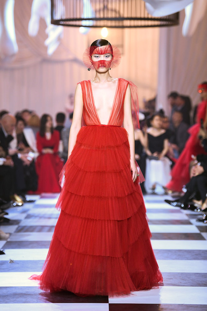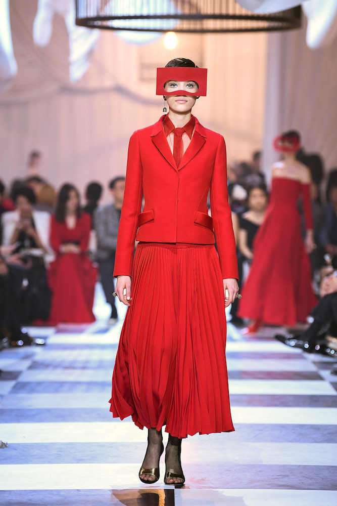 Maria Grazia Chiuri (マリア・グラツィア・キウリ) は、シュルレアリスム運動から着想を得たコレクションを2018年1月にパリのロダン美術館にて発表したが、今回新たに扇子からヒントを得た12ルックを披露。洗練を極めるオブジェとして扇子を採用しただけでなく、中国へのオマージュとしていくつかのルックでは「赤」を効果的に取り入れている。幸福と幸運のシンボルであり、ムッシュ ディオールが自著『The Little Dictionary of Fashion』の中で「The color of life」と表現したというこの「赤」は、ガウンドレスやプリーツのケープと組み合わせたタキシードなどに用いられている。