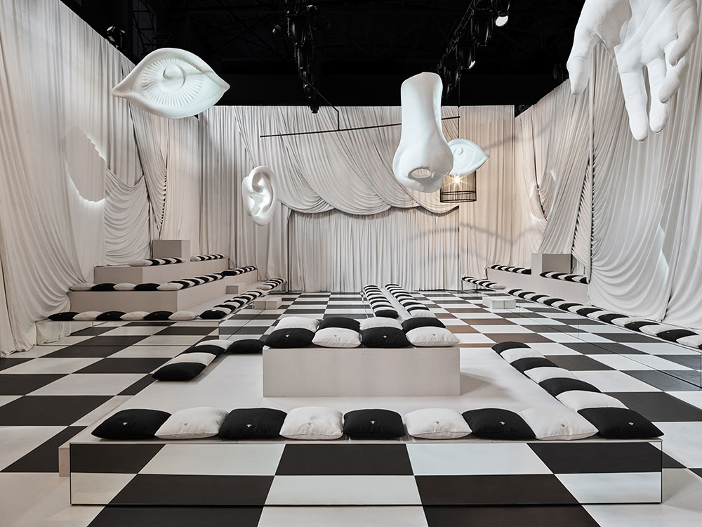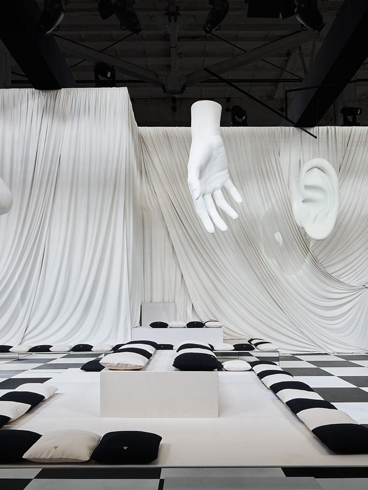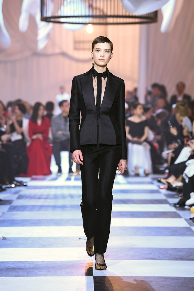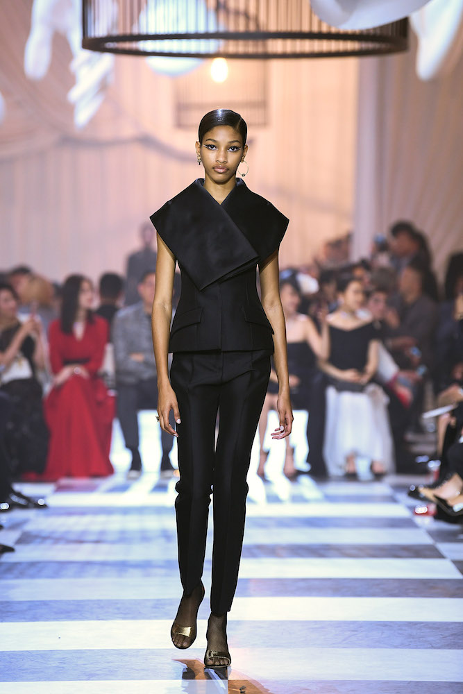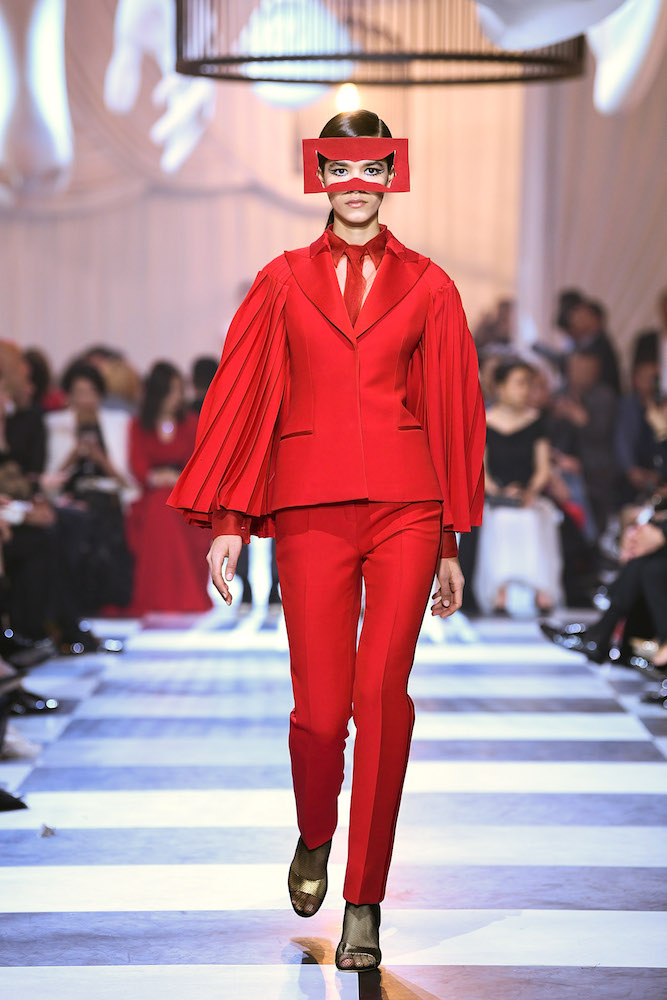 Maria Grazia Chiuri (マリア・グラツィア・キウリ) は、シュルレアリスム運動から着想を得たコレクションを2018年1月にパリのロダン美術館にて発表したが、今回新たに扇子からヒントを得た12ルックを披露。洗練を極めるオブジェとして扇子を採用しただけでなく、中国へのオマージュとしていくつかのルックでは「赤」を効果的に取り入れている。幸福と幸運のシンボルであり、ムッシュ ディオールが自著『The Little Dictionary of Fashion』の中で「The color of life」と表現したというこの「赤」は、ガウンドレスやプリーツのケープと組み合わせたタキシードなどに用いられている。