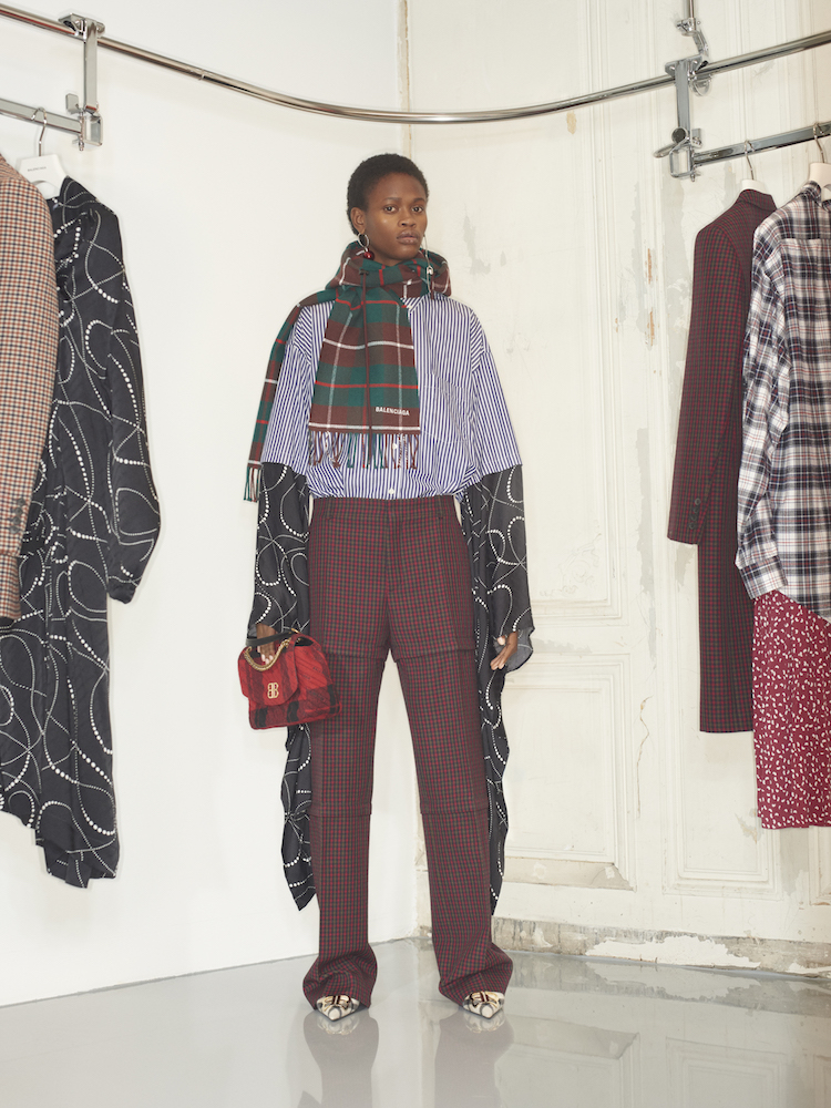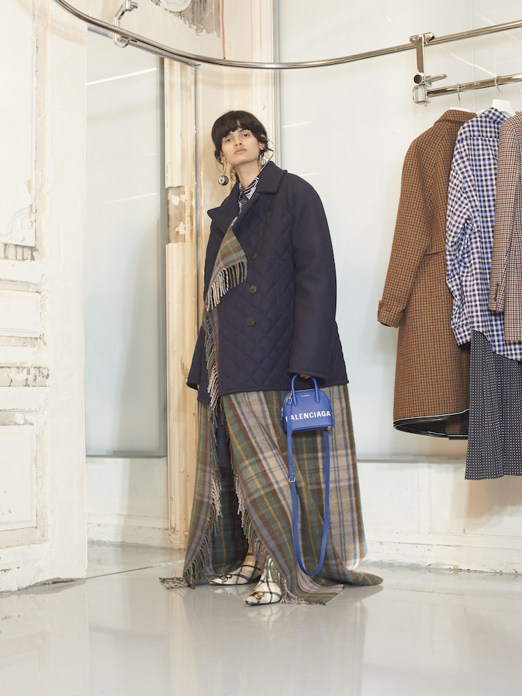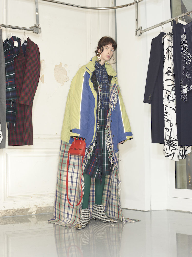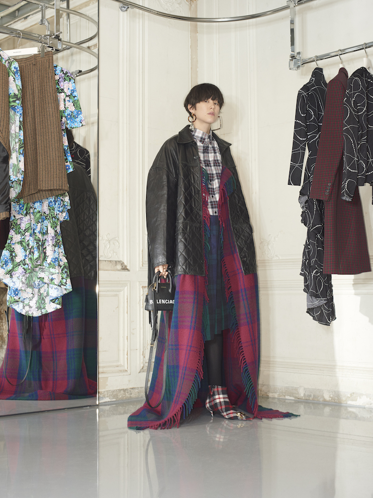 18年春夏ランウェイショーに引き続き Balenciaga が提案するのは、他とは一線を画するユニークなレイヤードスタイル。タータンブランケットとキルトジャケットが一枚になったアイテムや、モーターサイクルウェアのモチーフを取り入れたチェックのツイードコートなど一癖も二癖もあるアイテムが多数登場。誇張されたボリュームや収縮したシルエットなどが独特のバランス感を体現している。他にも、アウトドアのハイキング装備から取り入れられた3重の水平なジッパーや着物から着想を得た流れるような袖のデザインなどが新たにお目見え。Balenciaga のロゴバッグやゴールドの BB ロゴが冠されたローヒールのスティレットブーツ、クッキーの型抜きやスーパーヒーローのフィギュアからインスパイアされたイヤリングなど話題をさらうこと間違いなしの存在感抜群なアクセサリーも目白押しだ。全ルックを今すぐチェックして、これからのシーズンに向けたウィッシュリストの参考にしてみてはいかがだろうか。