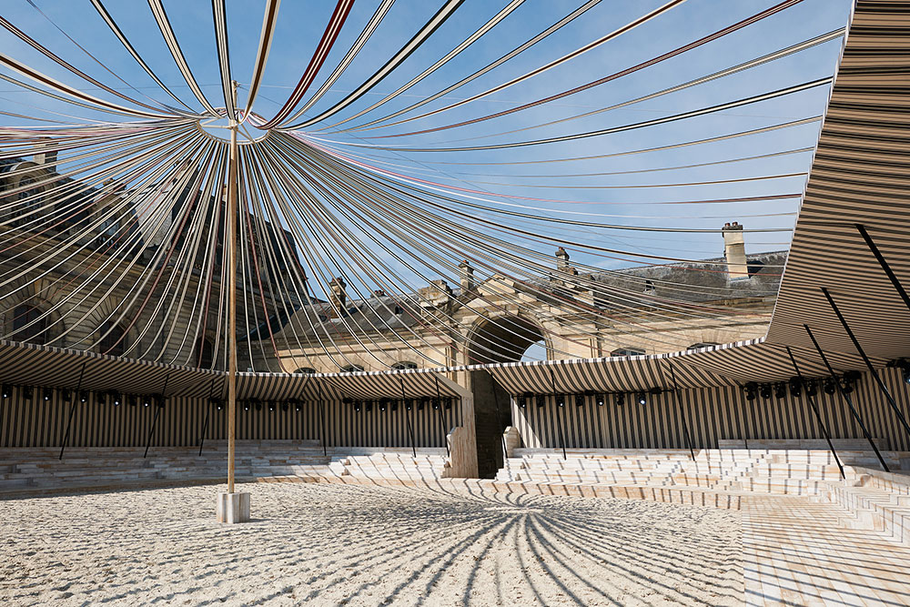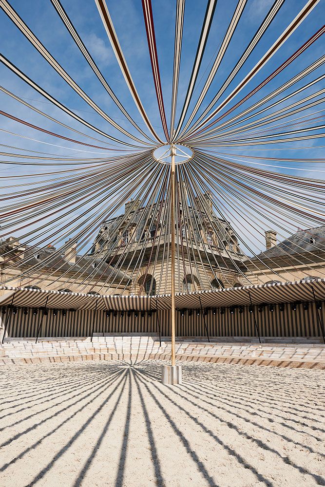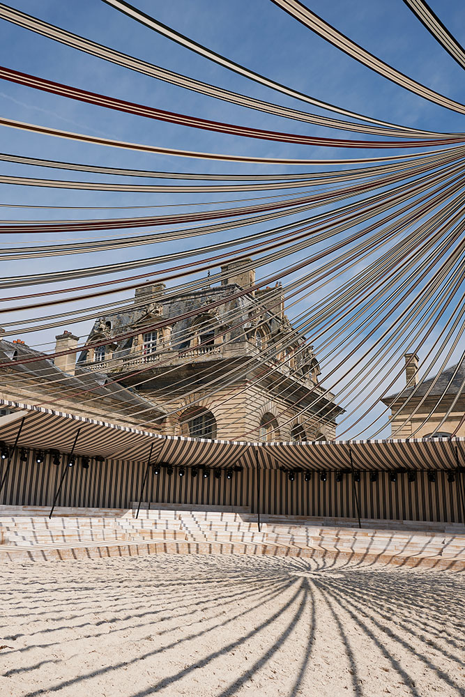 パリから40kmほど北に位置するコミューン、シャンティイの代名詞でもあるこのシャンティイ城は、16世紀に建てられた歴史ある建造物。閑静な森と湖に囲まれた美しい景観で広く親しまれているが、世界的にも著名なシャンティイ競馬場が隣接しており、シャンティイ城の大厩舎は馬の博物館として開放されている。今回、Dior はそんなフランスの由緒ある古城を舞台に、競馬場のような空間を演出した。