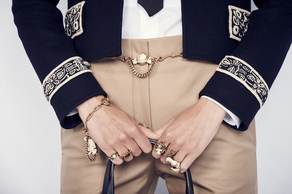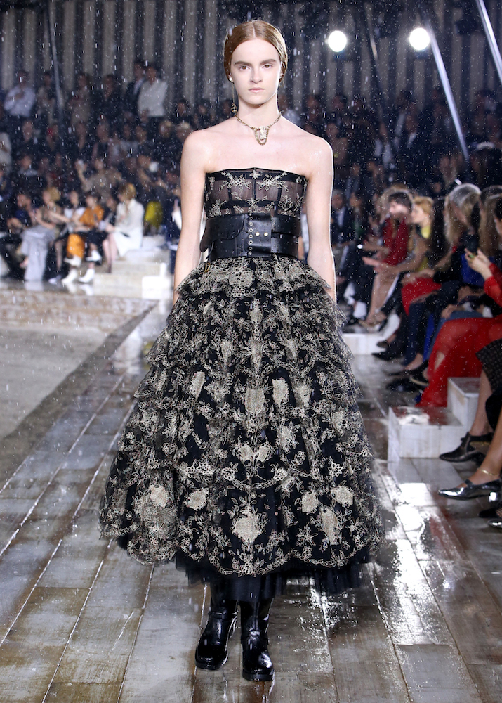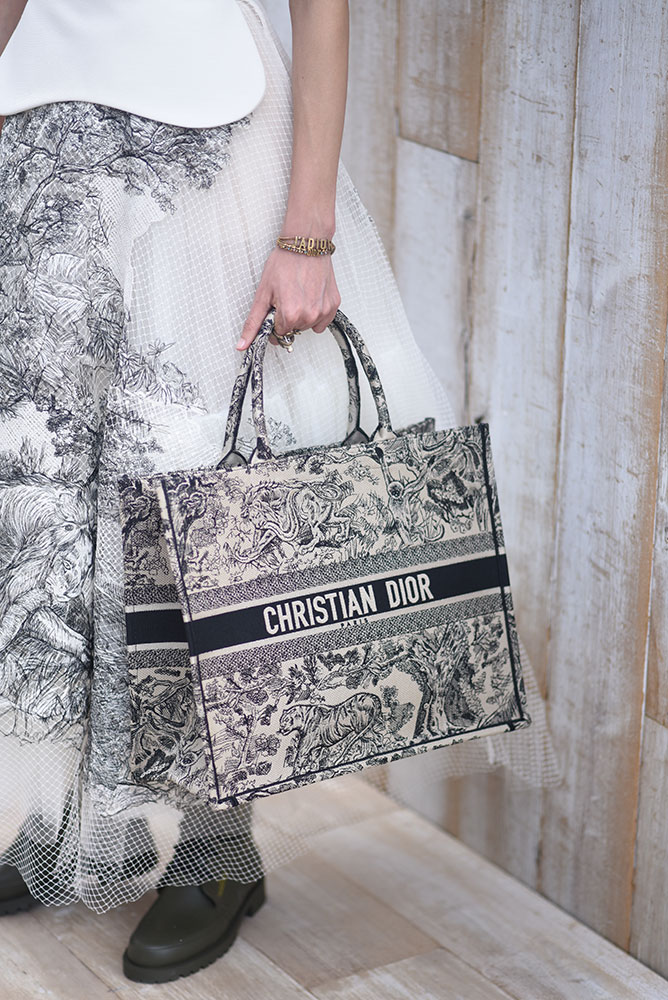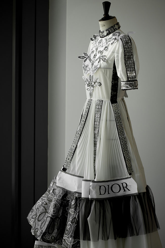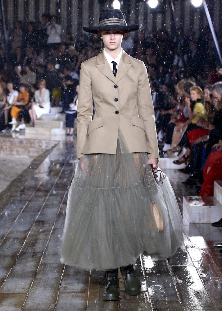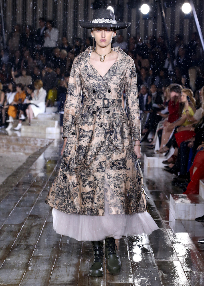 コレクションでは、ボリュームのあるスカートや刺繍、大きなハットといった女性騎手のコスチュームを現代的に解釈。チュールのアンダースカートやフリルとして重ねられたレースなど軽やかでありながら豪奢な印象を与えるスカートは、「バー」ジャケットやハイベルト、ブラックラバーブーツなどを合わせることで、コントラストの効いたモダンな仕上がりに。フランスの伝統的なテキスタイルのひとつ、トワルド ジュイには虎や蛇といった野生動物の姿が描かれ、コレクションに効果的に登場している。