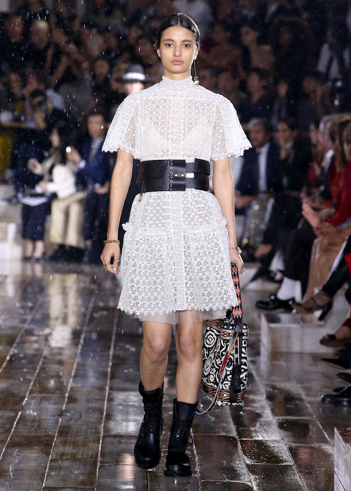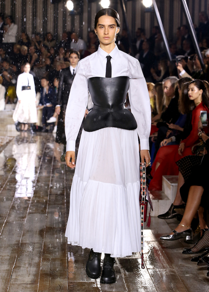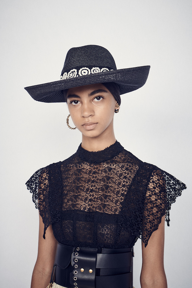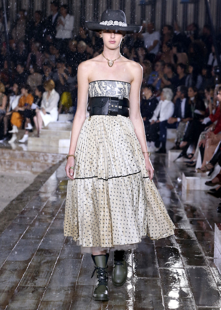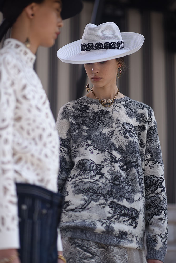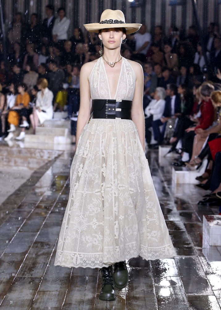 団結した女性たちの強さという観点から Maria Grazia Chiuri は、ギリシア神話に登場する女性のみの狩猟部隊、アマゾネスにも想いを馳せ、スポーツスタイルをジェンダーに囚われることのないデザインで表現。日本産のコットンを用いたジャケットやパンツ、キュロットスカート、ムッシュ ディオールが生みだしたアフタヌーンドレス「Drags」を彷彿とさせるプリーツスカートなどデザイン性と機能性の両方を兼ね備えたワードローブが登場した。また、チリの女性作家 Isabel Allende (イザベル・アジェンデ) のデビュー作である『精霊たちの家』に触れながら、彼女の描いた自立した女性の人物像も表現。Stephen Jones (スティーブン・ジョーンズ) のデザインしたつば広のストローハットにエンブロイダリーが施されたホワイトドレスを組み合わせるなど、アイコニックなルックが続いた。