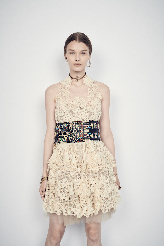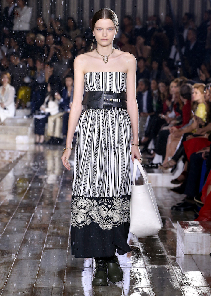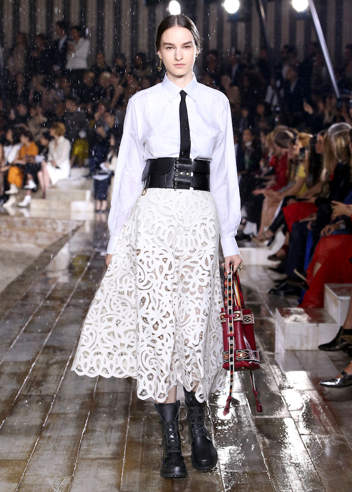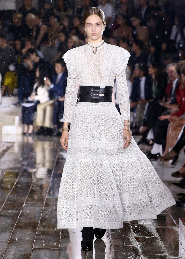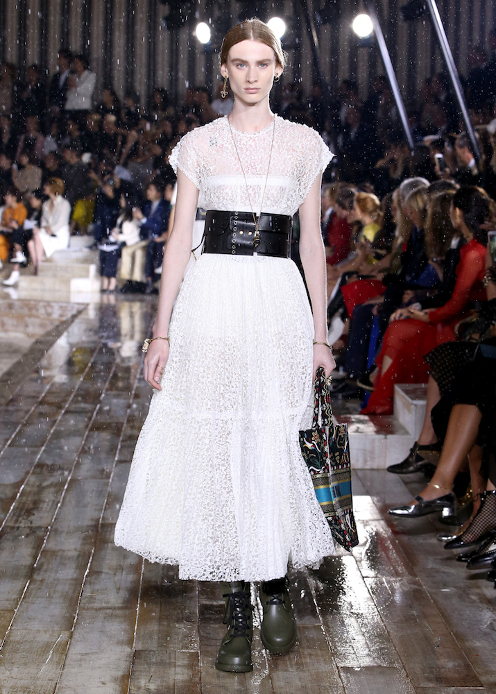 団結した女性たちの強さという観点から Maria Grazia Chiuri は、ギリシア神話に登場する女性のみの狩猟部隊、アマゾネスにも想いを馳せ、スポーツスタイルをジェンダーに囚われることのないデザインで表現。日本産のコットンを用いたジャケットやパンツ、キュロットスカート、ムッシュ ディオールが生みだしたアフタヌーンドレス「Drags」を彷彿とさせるプリーツスカートなどデザイン性と機能性の両方を兼ね備えたワードローブが登場した。また、チリの女性作家 Isabel Allende (イザベル・アジェンデ) のデビュー作である『精霊たちの家』に触れながら、彼女の描いた自立した女性の人物像も表現。Stephen Jones (スティーブン・ジョーンズ) のデザインしたつば広のストローハットにエンブロイダリーが施されたホワイトドレスを組み合わせるなど、アイコニックなルックが続いた。