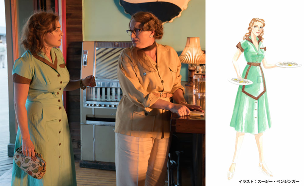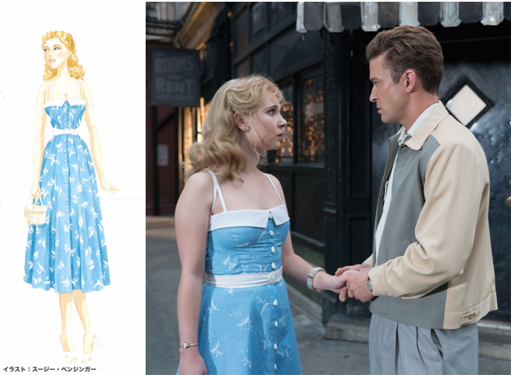 50年代アメリカのファッションといえば、ウエストとヒップのサイズ差が大きく、一般的な現代人の体型ではなかなか再現が難しいところ。実際、Juno Temple (ジュノ・テンプル) のフィッティングにはよりオーバーに当時のスタイリングを再現するために十分細いウエストに補正具をつけて臨んだそう。ただし、主演の Kate Winslet (ケイト・ウィンスレット) だけは補正具が必要なかったと Suzy Benzinger は振り返り、「彼女自身が、「私の体型を見て。当時のままよ。まるで現代的とは言えないわ。」と言う通りだった。」とコメントを残している。ヒロインたちだけでなく、海岸の監視員として魅力的な青年ミッキーを演じる Justin Timberlake (ジャスティン・ティンバーレイク) ら、メンズの衣装までもこだわりが詰まっているのでぜひ楽しみにしていてほしい。