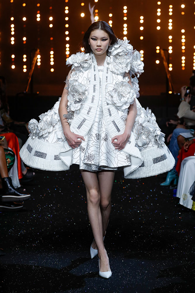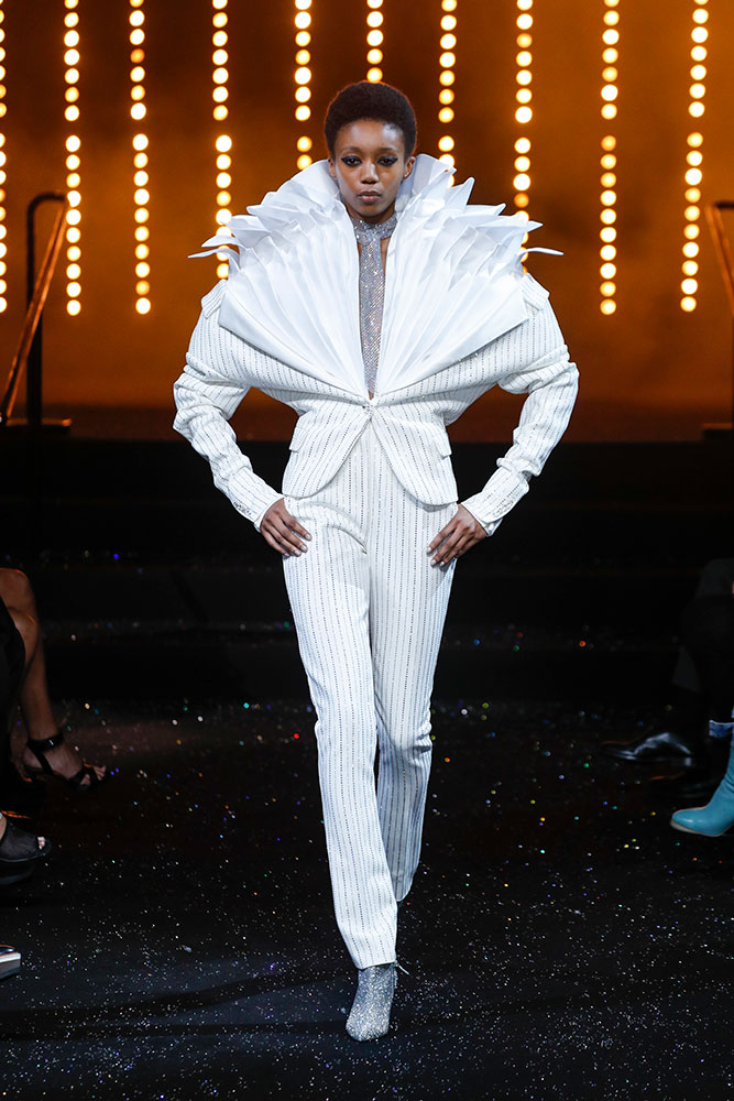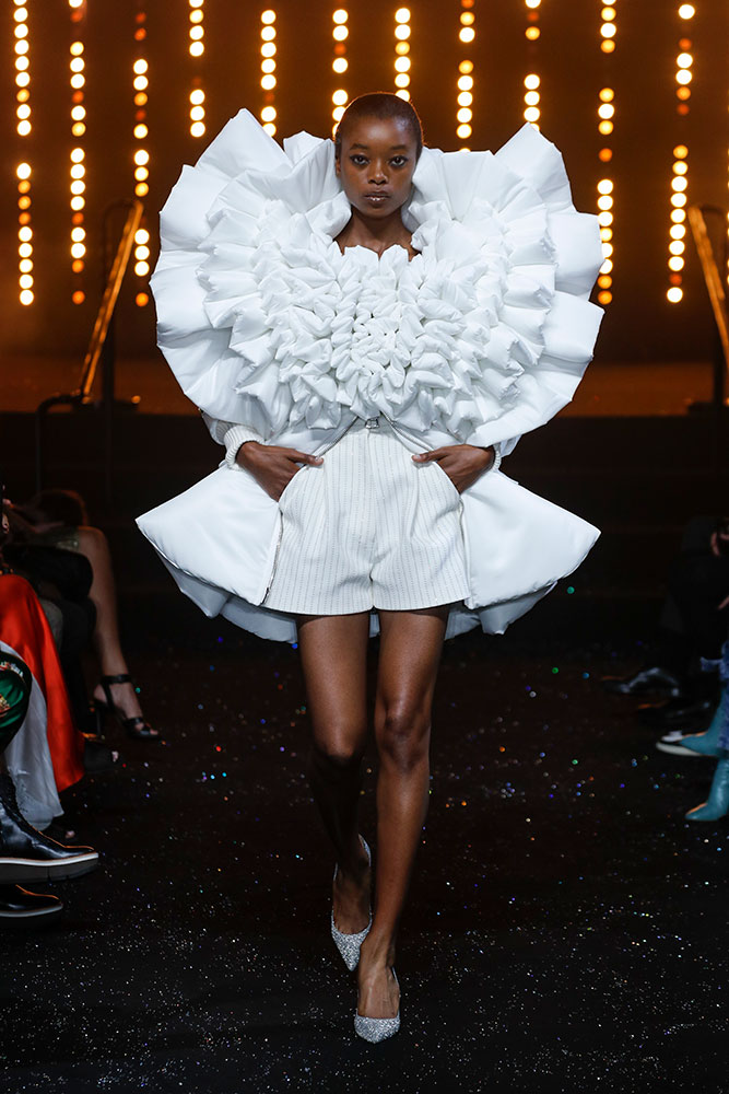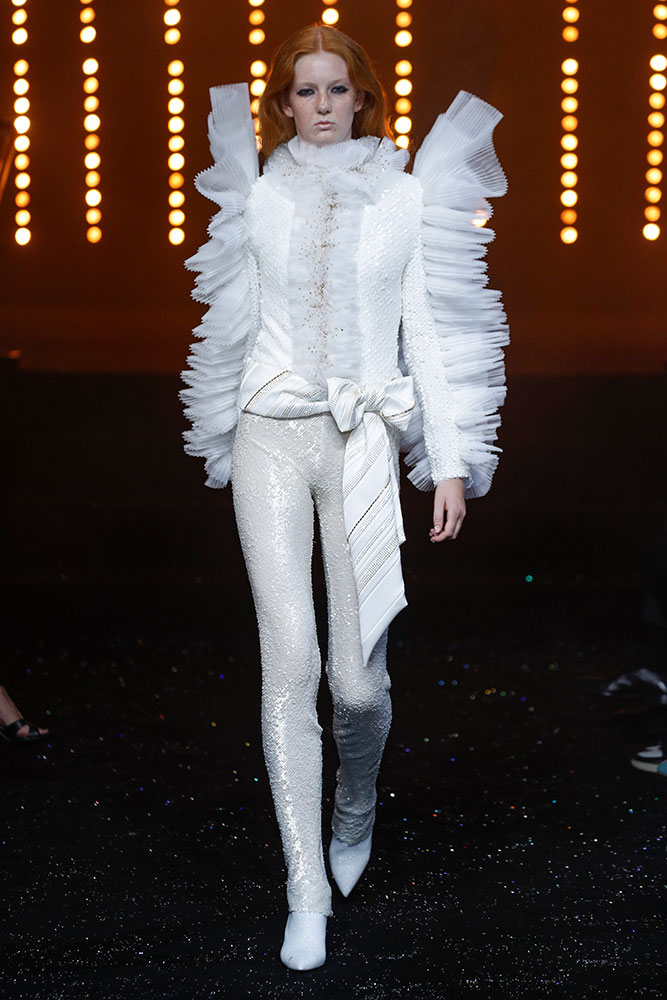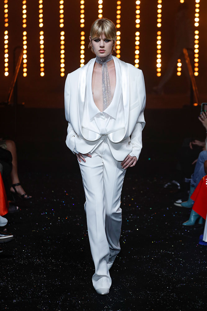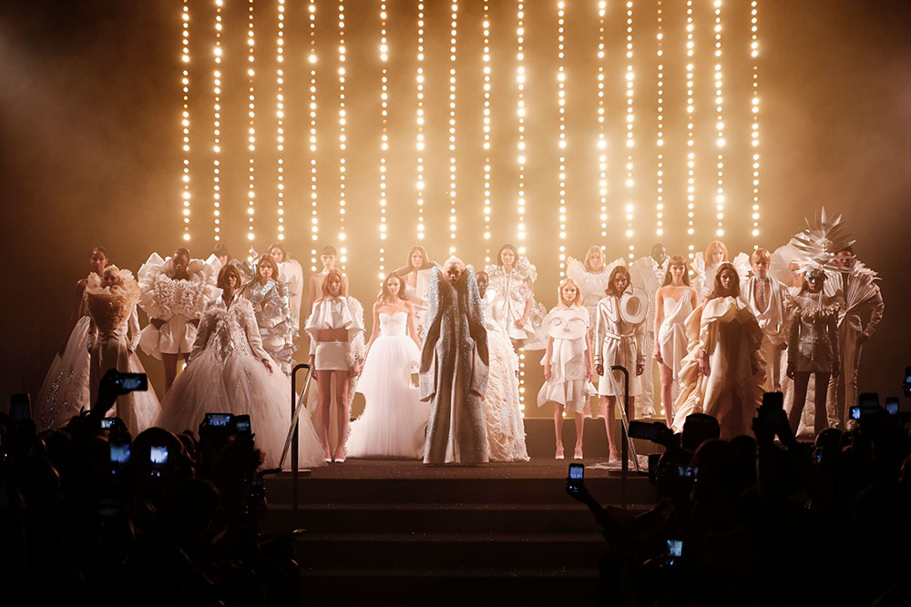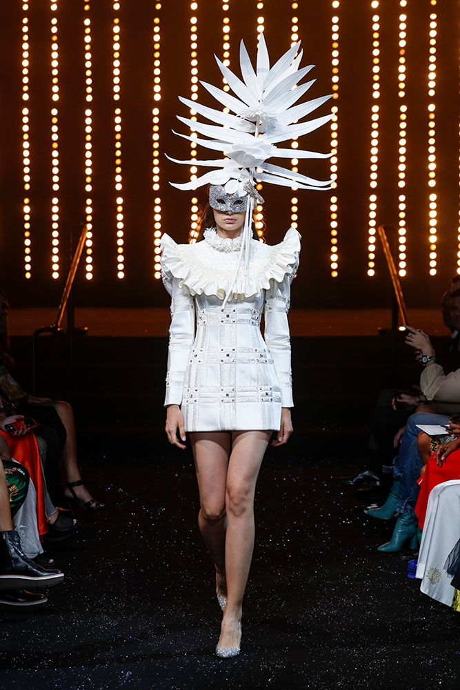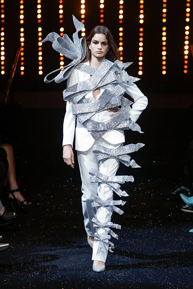 会場は90年代によくショーで使われたピガール(パリの下町)にあるトリアノンという劇場だ。ショーは「セレブレーション」という音楽で始まり、全ルック白にスワロスキーを散りばめた光り輝く作品を並べた。今まで発表してきたアイコンをリデザインして25作品に収めたコレクションだ。