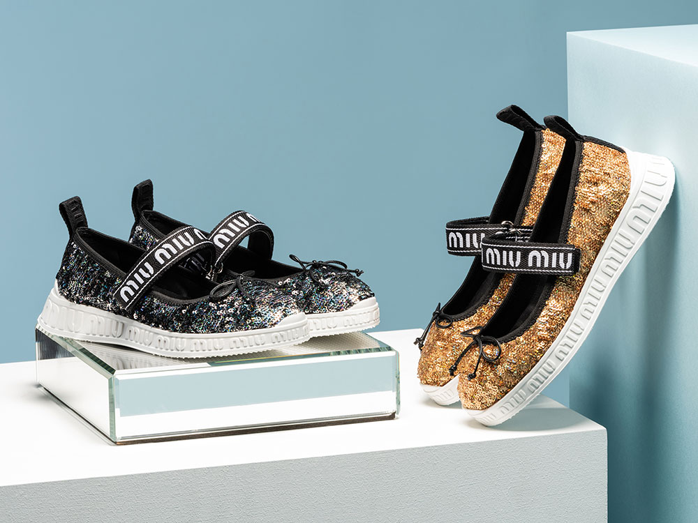 MIU MIU (ミュウミュウ) が、2018年8月8日(水)から21日(火)までの期間、限定のシューズショップを伊勢丹新宿店にオープンする。バレリーナタイプのスニーカーをはじめ、ベーシックなクロスサンダルやフラットサンダルが、MIU MIU らしいグリッターやスパンコール、秋冬シーズンに向けベルベット素材を取り入れたバリエーション豊富なデザインで一堂に並ぶ。その中でも特に注目のアイテムは、世界に先がけて発売となるラバーソールに大胆な MIU MIU のロゴを配したスポーティなシリーズ「MIU RUN(ミュウラン)」の新作や、煌めくビジューを施したスニーカーたち。昨今のスポーティーなムードを MIU MIU らしく解釈したフットウェアをぜひチェックして。