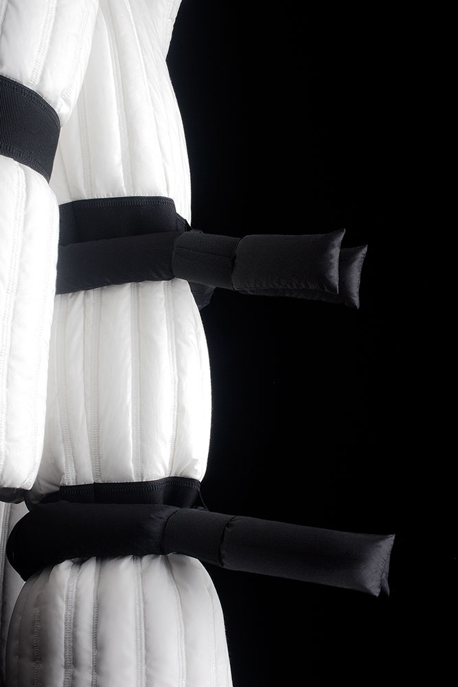 Craig Green が生み出したのはマットナイロンやコットンダウンを用いて、機能性を軸にしながらもまるで彫刻のようなアートピース。ライフジャケットや救命ボートを彷彿とさせるディテールを取り入れ、その巨大なシルエットからは想像もつかないほど軽量なウェアは、厳しい環境下でも最高のパフォーマンスを実現してくれる。スタイリッシュでありながら肌触りも快適なフードはフェイスまでカバーしてくれ、防御性も抜群。ホワイトやブラック、ミッドナイトブルーというカラーパレットにブラックのステッチのピンストライプがグラフィカルな印象のデザインには、一分の隙もない。この冬のウィンタースポーツには、是非 Craig Green の画期的なウェアで挑んでみたらいかがだろうか。