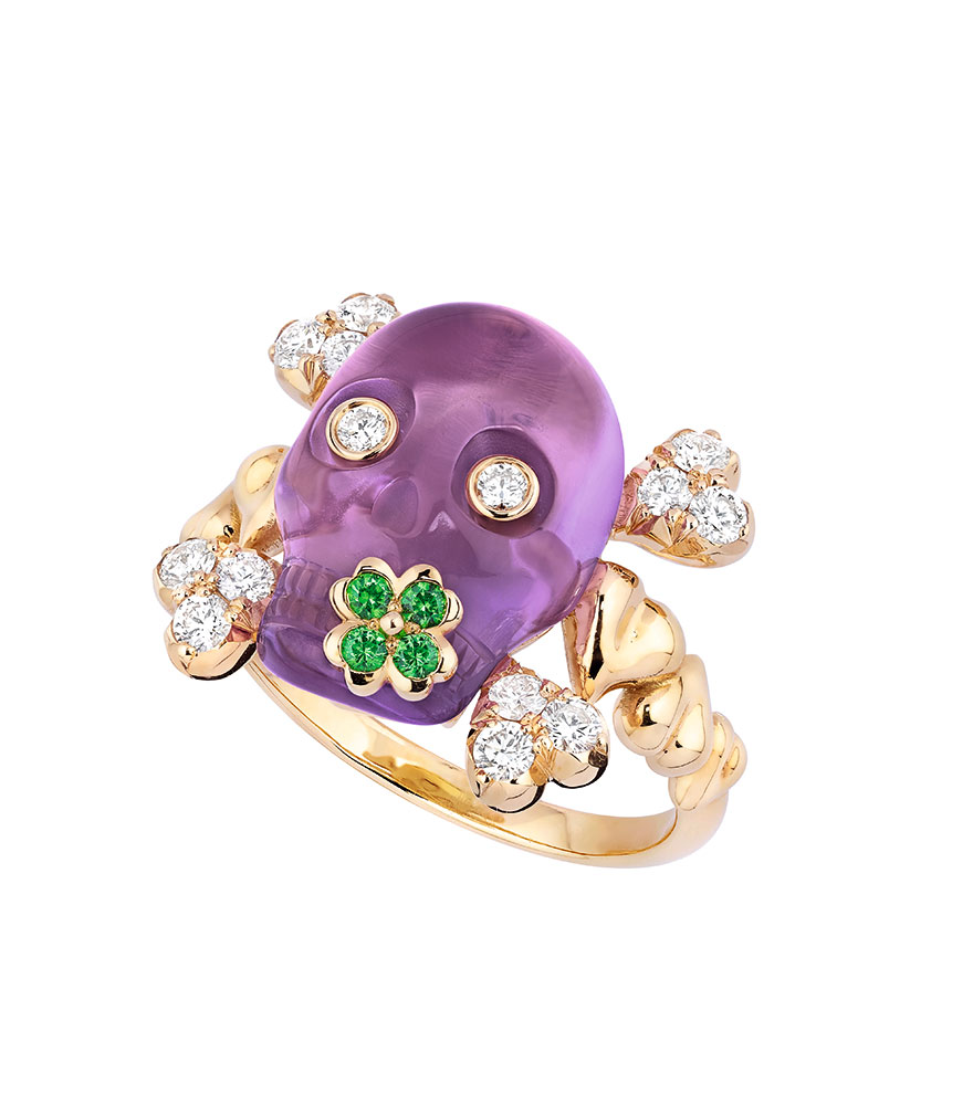 生涯を通して情熱を持った生き方を大切にしたメゾンの創業者 Christian Dior (クリスチャン・エィオール) の精神を受け継ぎ、Victoire de Castellane (ヴィクトワール・ドゥ・カステラーヌ) が生み出したのは、人生を大いに楽しむ、今という時を大切に生きるという意味を持つラテン語「メメント・モリ」や「カルペ・ディエム」を再解釈したコレクション。これまでに人間の存在の儚さを永遠不変のジュエリーに解釈した「Reines et Rois (レヌ ゼロワ)」や今までの固定概念を覆す「Tête de Mort (テト ドゥ モール)」といったコレクションを手がけてきた彼女は今回、リングとネックレスからなるスカルをモチーフにしたコレクションを生み出した。メゾンの誇る職人たちの卓越したノウハウを駆使した本コレクションは、イエローゴールドとアメジスト、ホワイトゴールドとブルーカルセドニー、ピンクゴールドとピンククオーツという Dior らしい組み合わせが魅力的だ。スカルには Christian Dior のラッキーモチーフであるクローバーの葉や彼がこよなく愛したすずらんの花の冠があしらわれるなど、それぞれに秘められたメッセージが込められており、謎に満ち溢れたコレクションに仕上げられている。