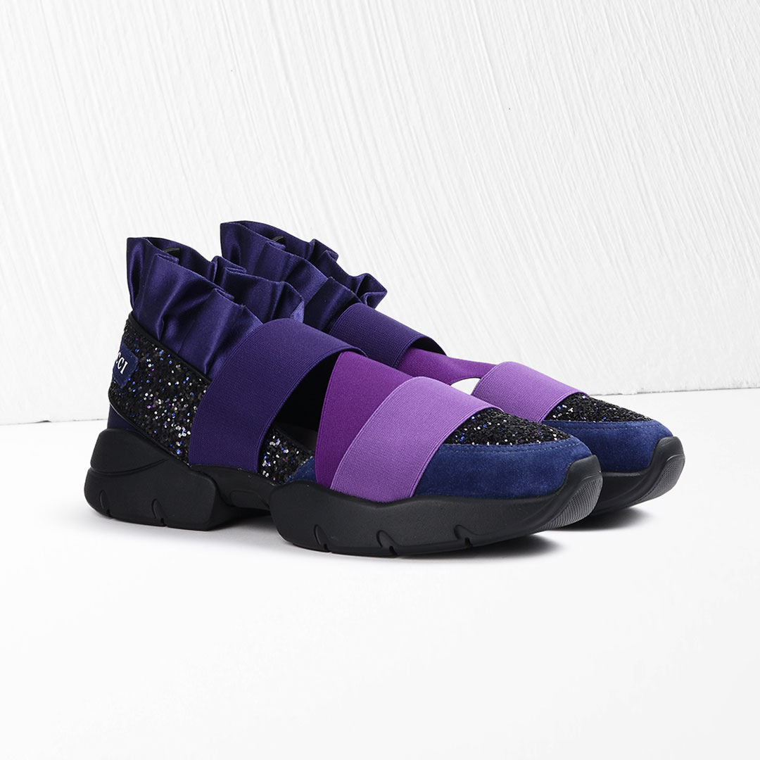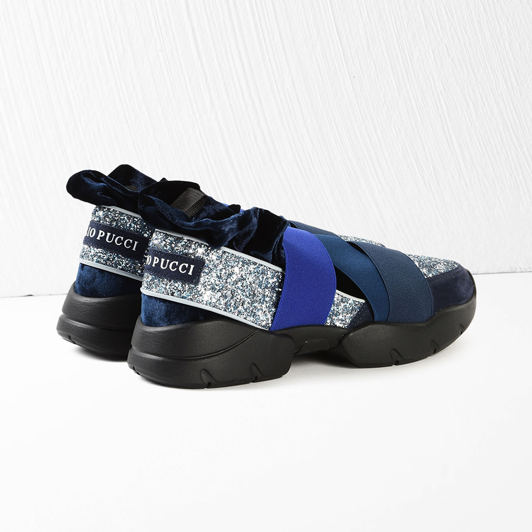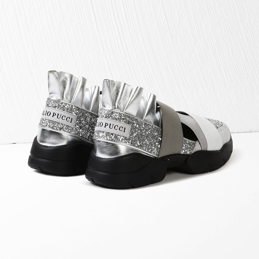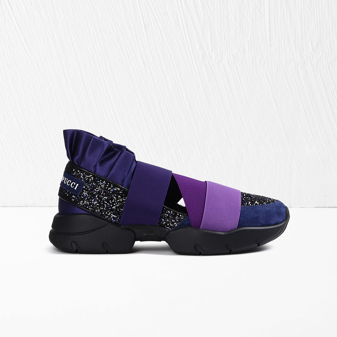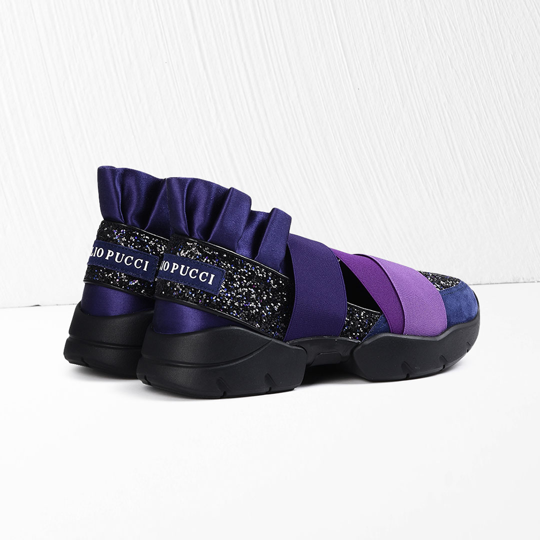 Emilio Pucci (エミリオ・プッチ) のアイコンスニーカー「City Up」が、煌めくグリッターを纏った限定エディションで登場する。テーマは “PUCCI NIGHT”。ブルー、シルバー、ゴールド、ブラック、ホワイト、そしてパープルといった6色のカラー展開で、クラシックなラバーのストラップと、異なる素材で作られたフリルのトリムが魅力的なデザインとなっている。