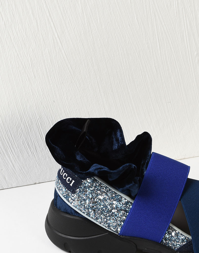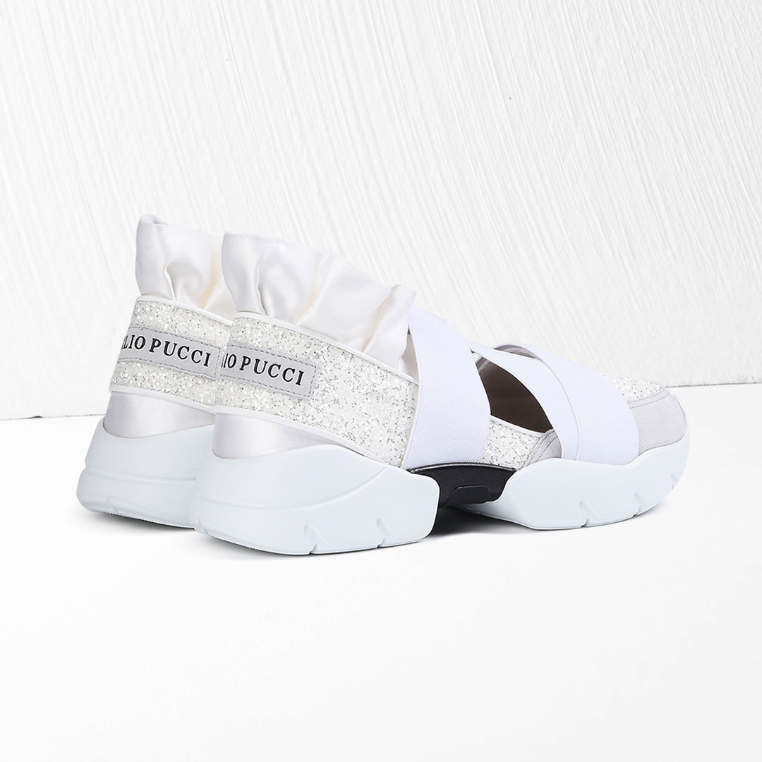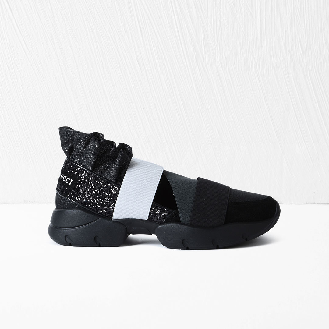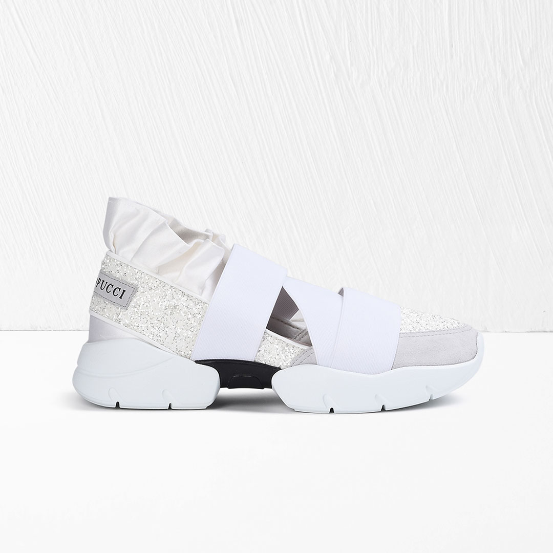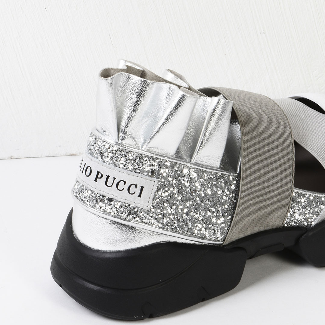Emilio Pucci (エミリオ・プッチ) のアイコンスニーカー「City Up」が、煌めくグリッターを纏った限定エディションで登場する。テーマは “PUCCI NIGHT”。ブルー、シルバー、ゴールド、ブラック、ホワイト、そしてパープルといった6色のカラー展開で、クラシックなラバーのストラップと、異なる素材で作られたフリルのトリムが魅力的なデザインとなっている。