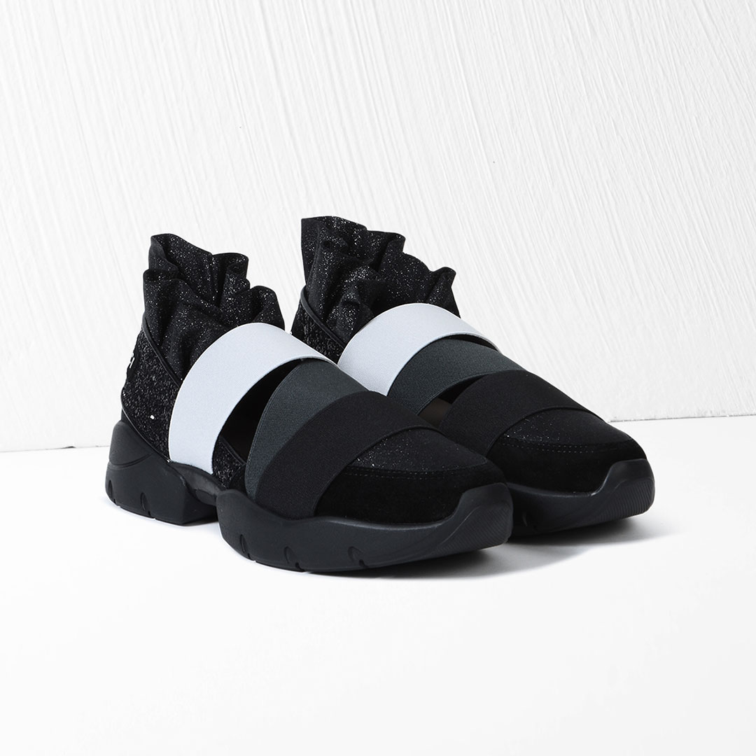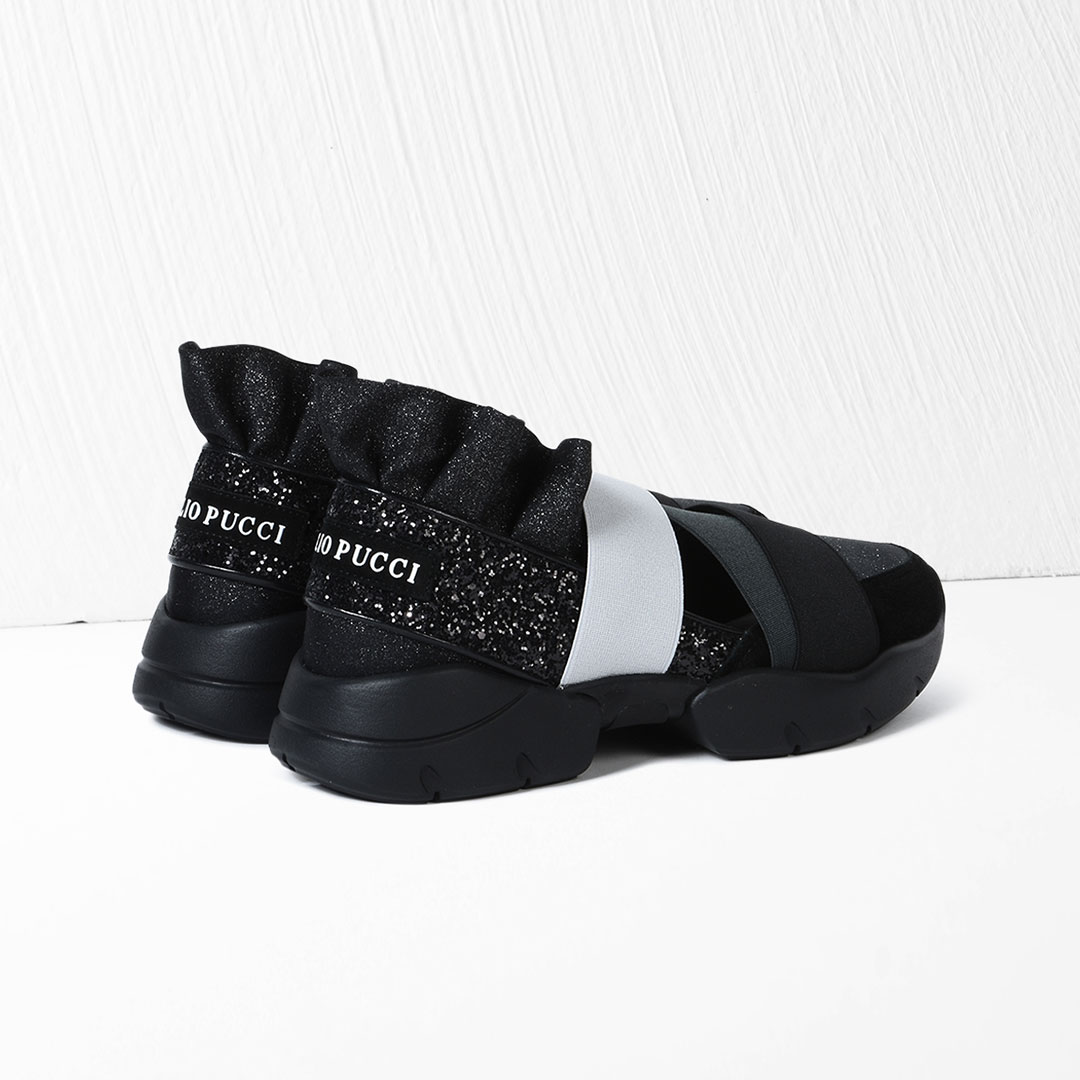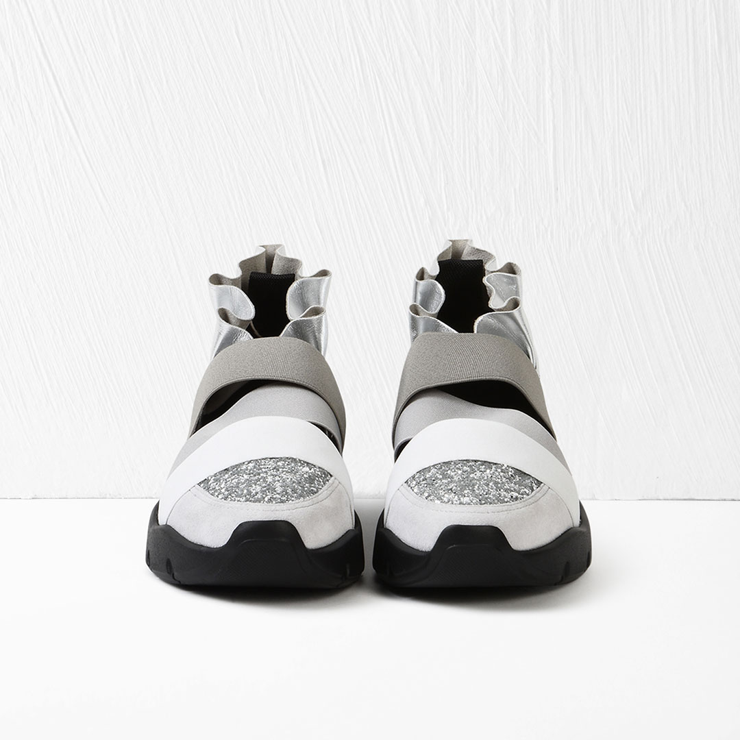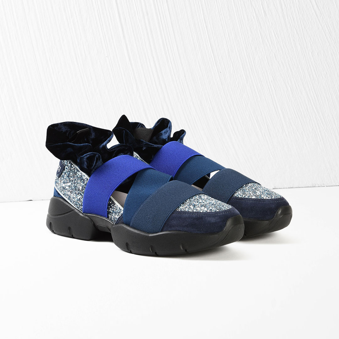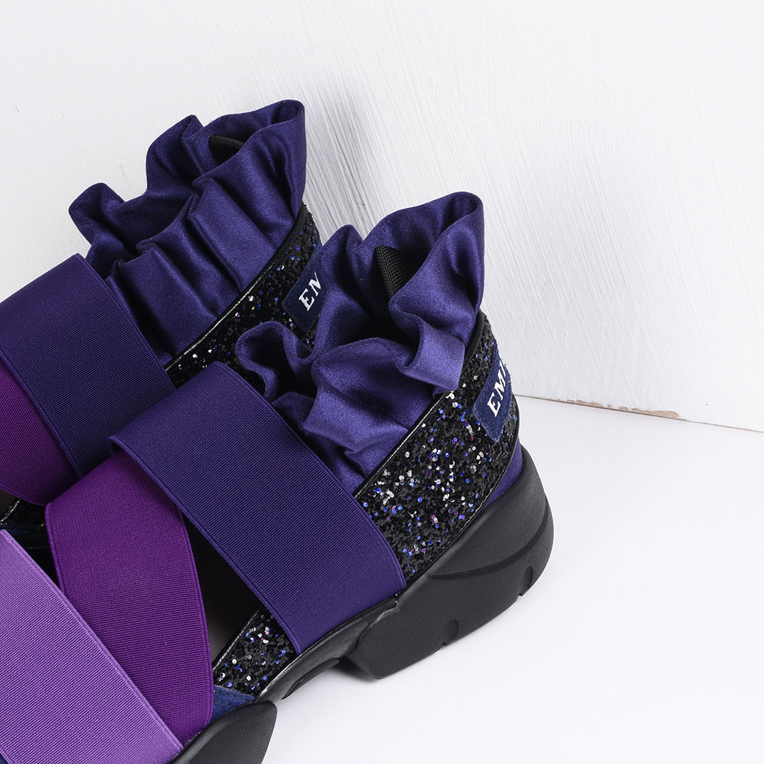 Emilio Pucci (エミリオ・プッチ) のアイコンスニーカー「City Up」が、煌めくグリッターを纏った限定エディションで登場する。テーマは “PUCCI NIGHT”。ブルー、シルバー、ゴールド、ブラック、ホワイト、そしてパープルといった6色のカラー展開で、クラシックなラバーのストラップと、異なる素材で作られたフリルのトリムが魅力的なデザインとなっている。