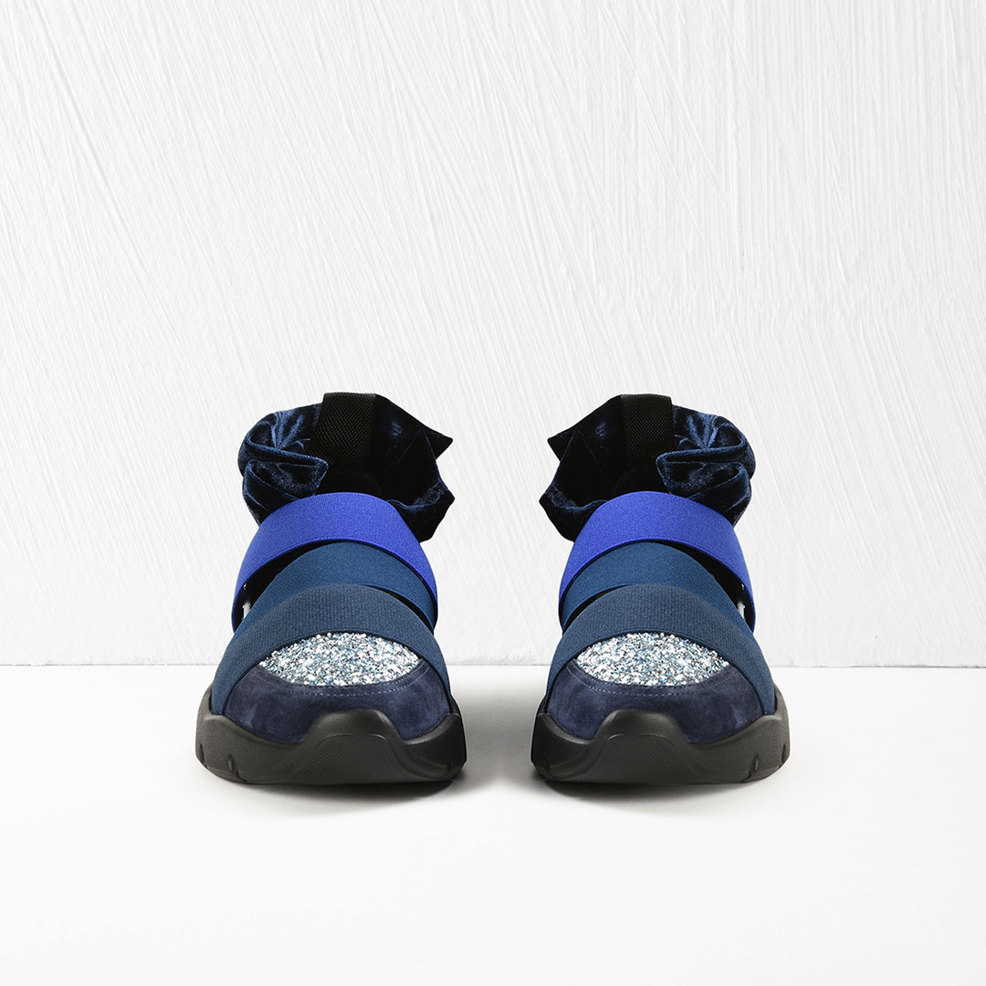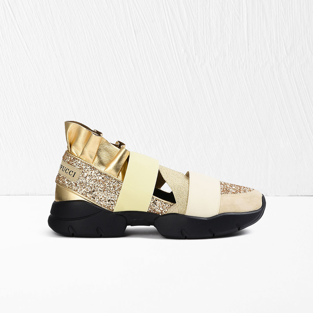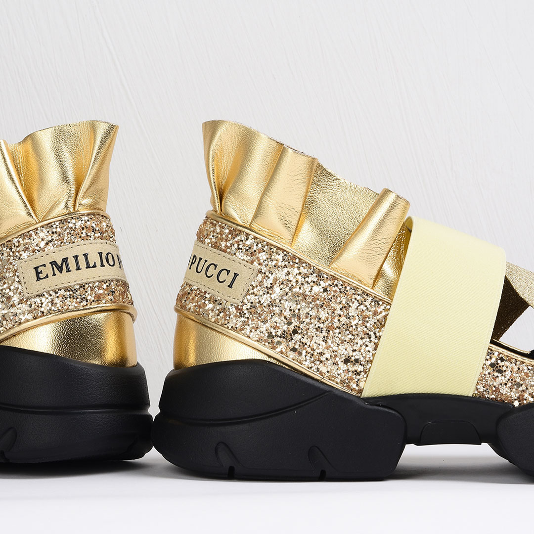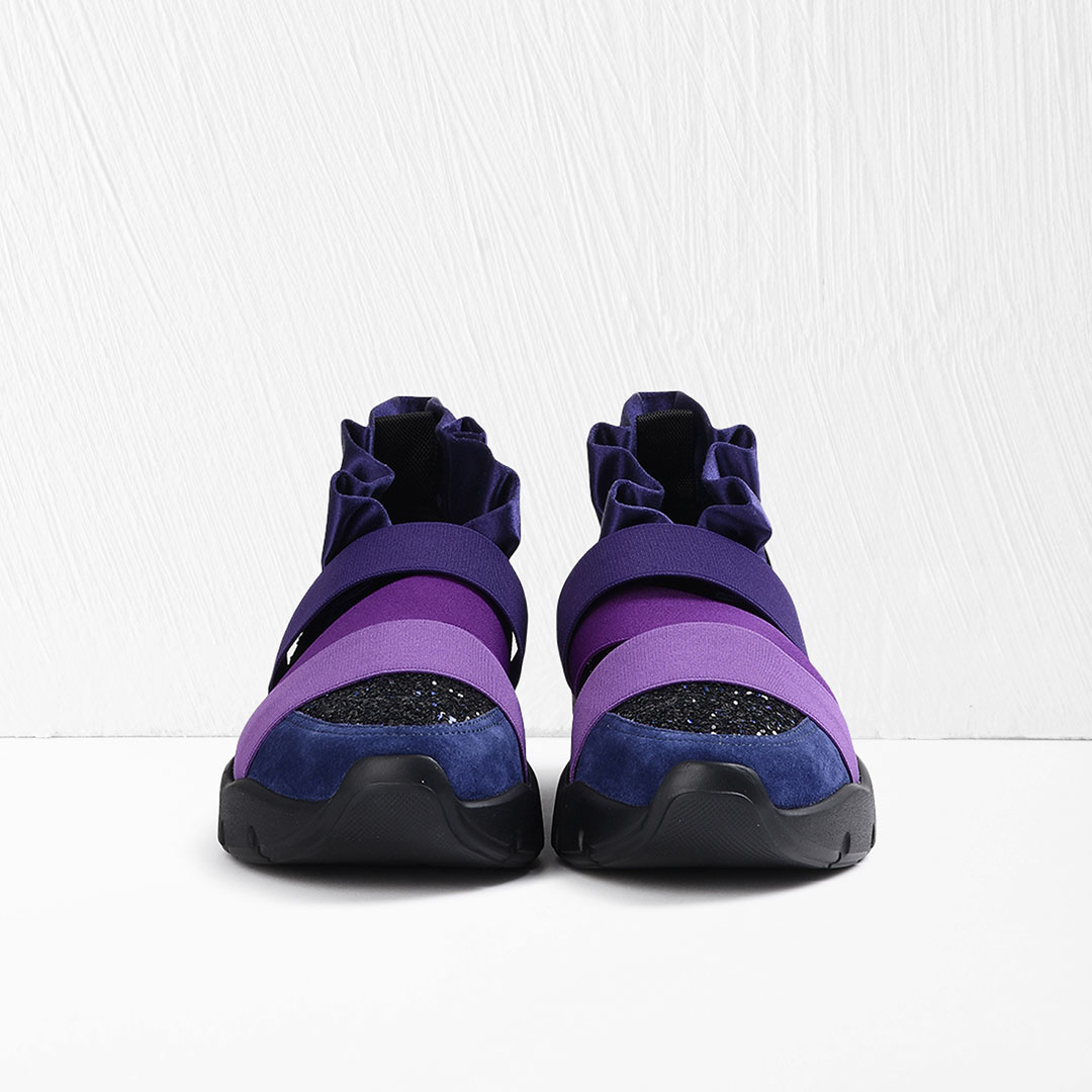Emilio Pucci (エミリオ・プッチ) のアイコンスニーカー「City Up」が、煌めくグリッターを纏った限定エディションで登場する。テーマは “PUCCI NIGHT”。ブルー、シルバー、ゴールド、ブラック、ホワイト、そしてパープルといった6色のカラー展開で、クラシックなラバーのストラップと、異なる素材で作られたフリルのトリムが魅力的なデザインとなっている。