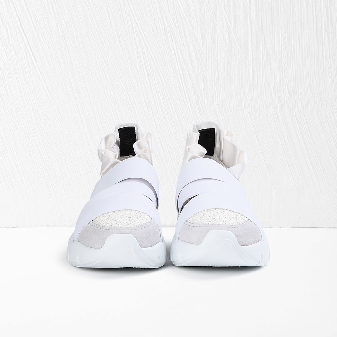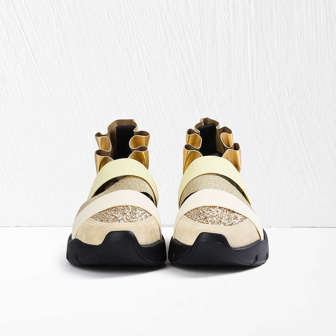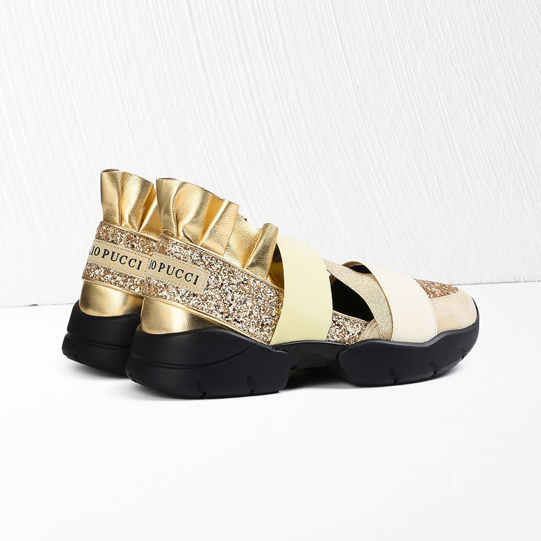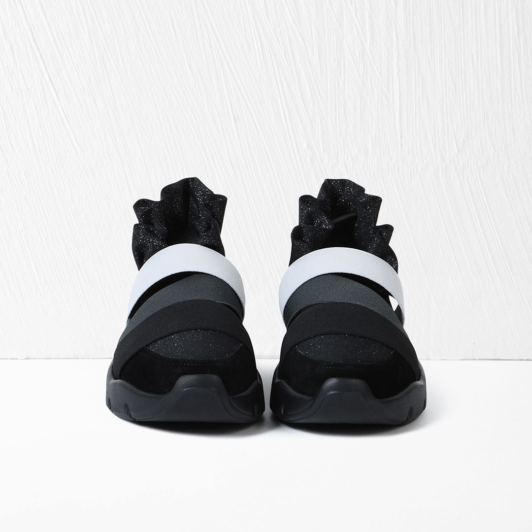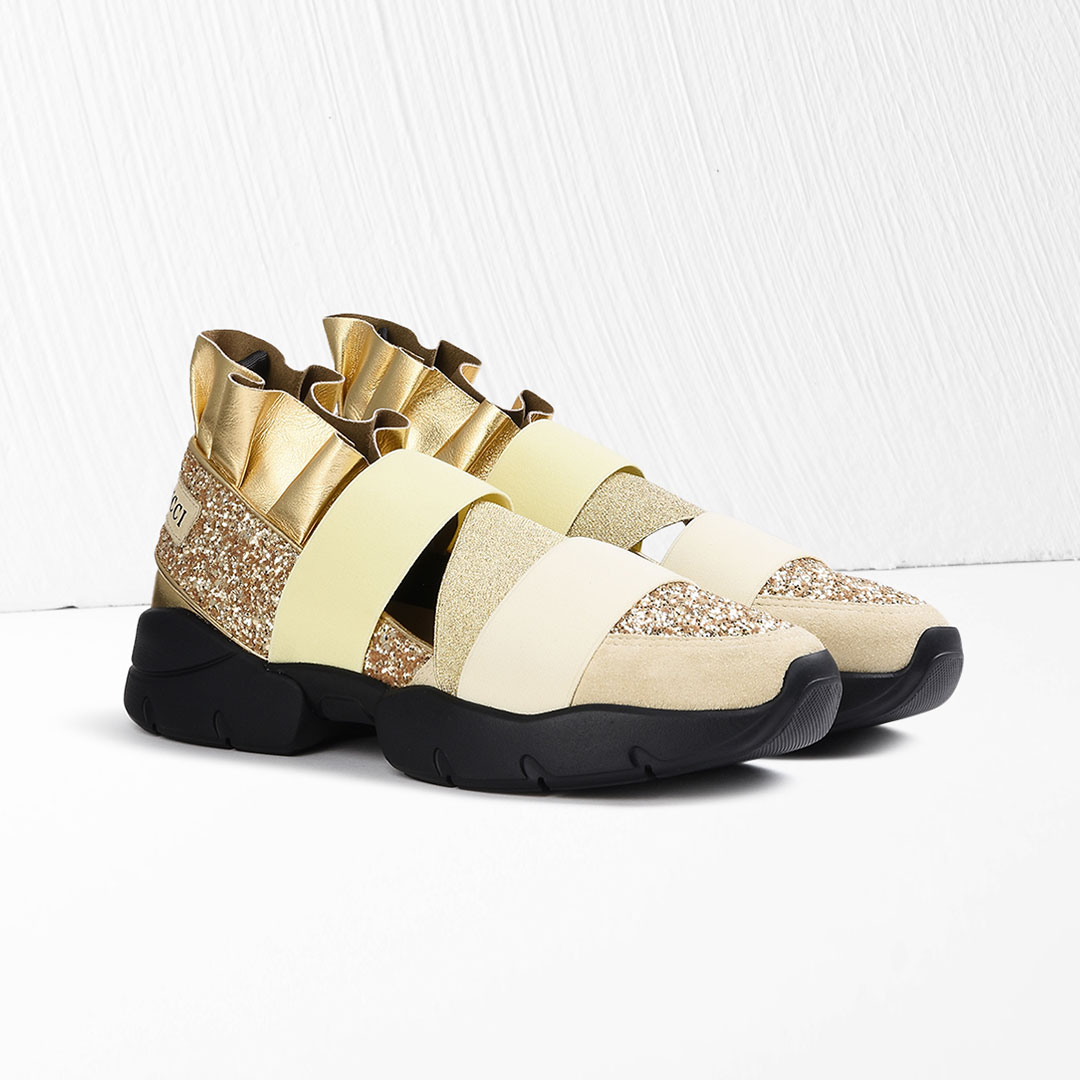 Emilio Pucci (エミリオ・プッチ) のアイコンスニーカー「City Up」が、煌めくグリッターを纏った限定エディションで登場する。テーマは “PUCCI NIGHT”。ブルー、シルバー、ゴールド、ブラック、ホワイト、そしてパープルといった6色のカラー展開で、クラシックなラバーのストラップと、異なる素材で作られたフリルのトリムが魅力的なデザインとなっている。