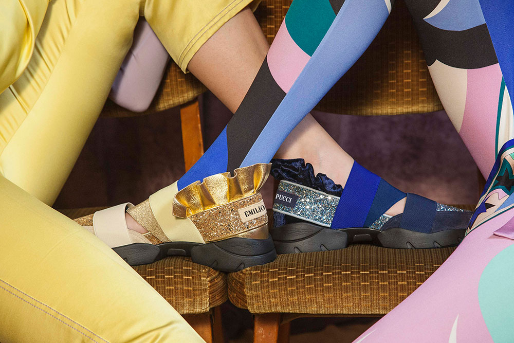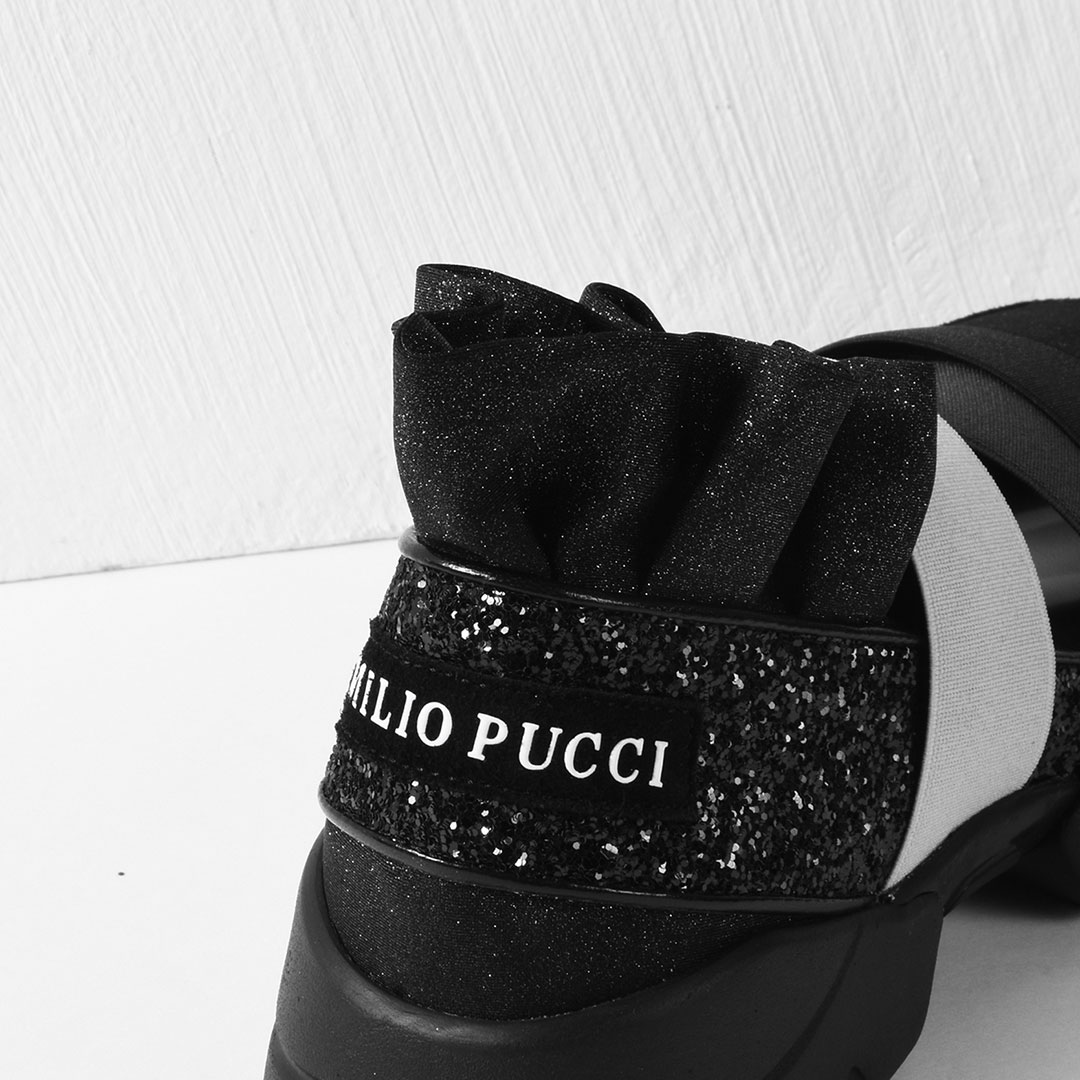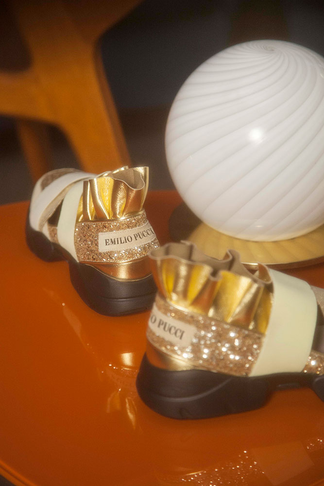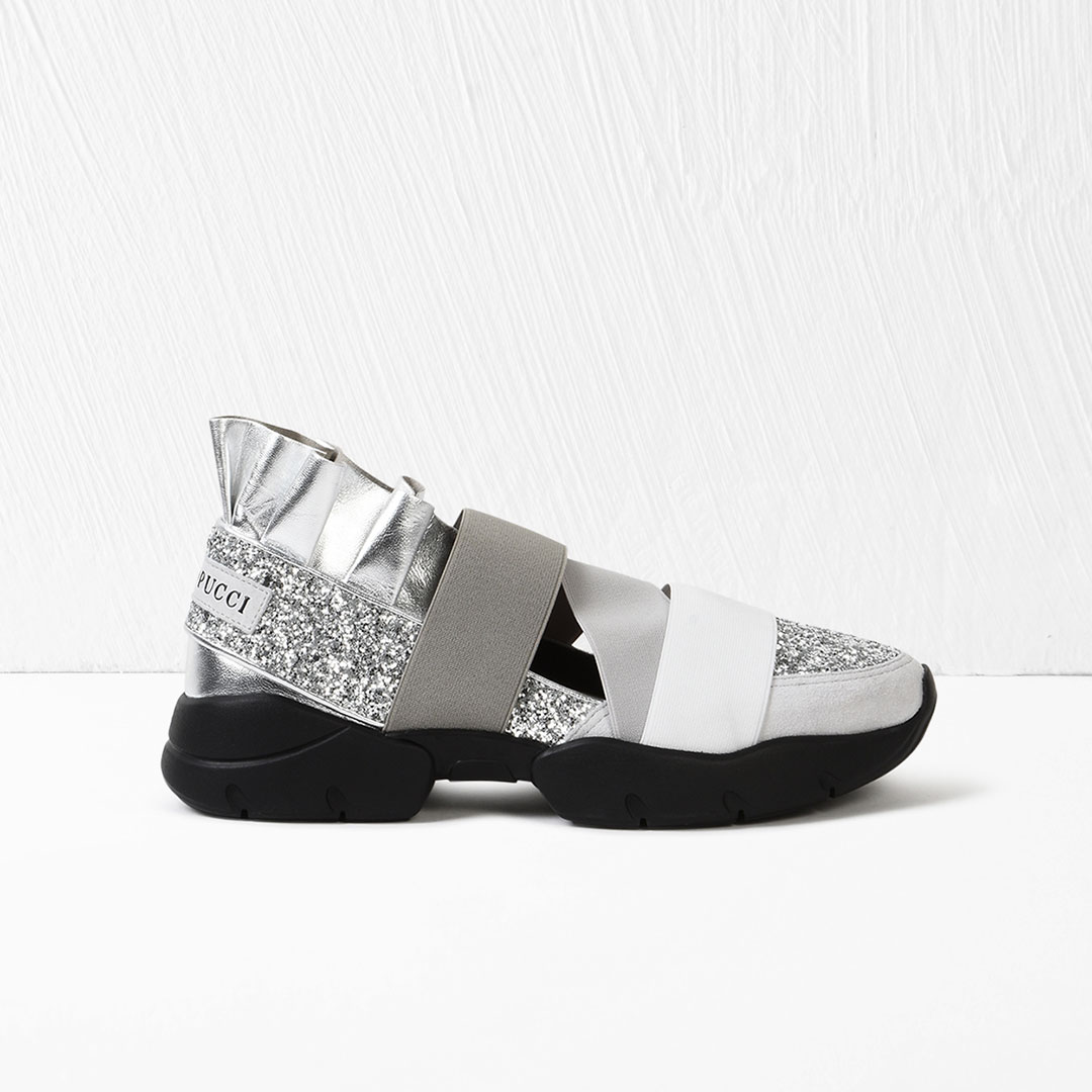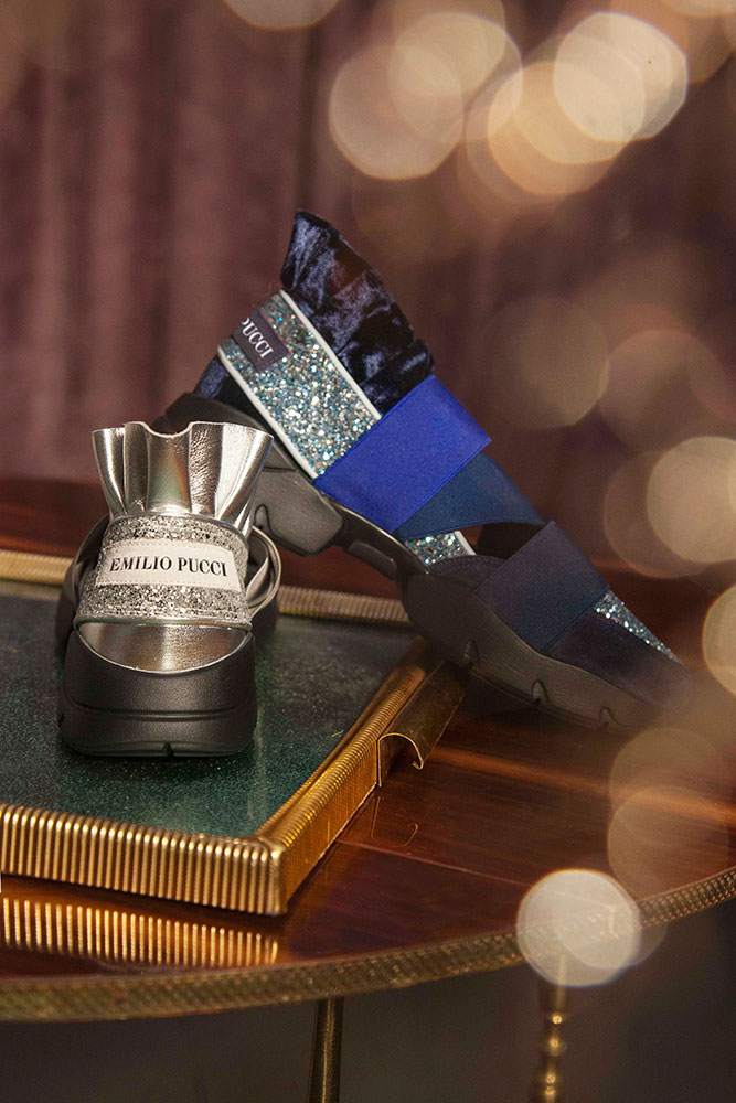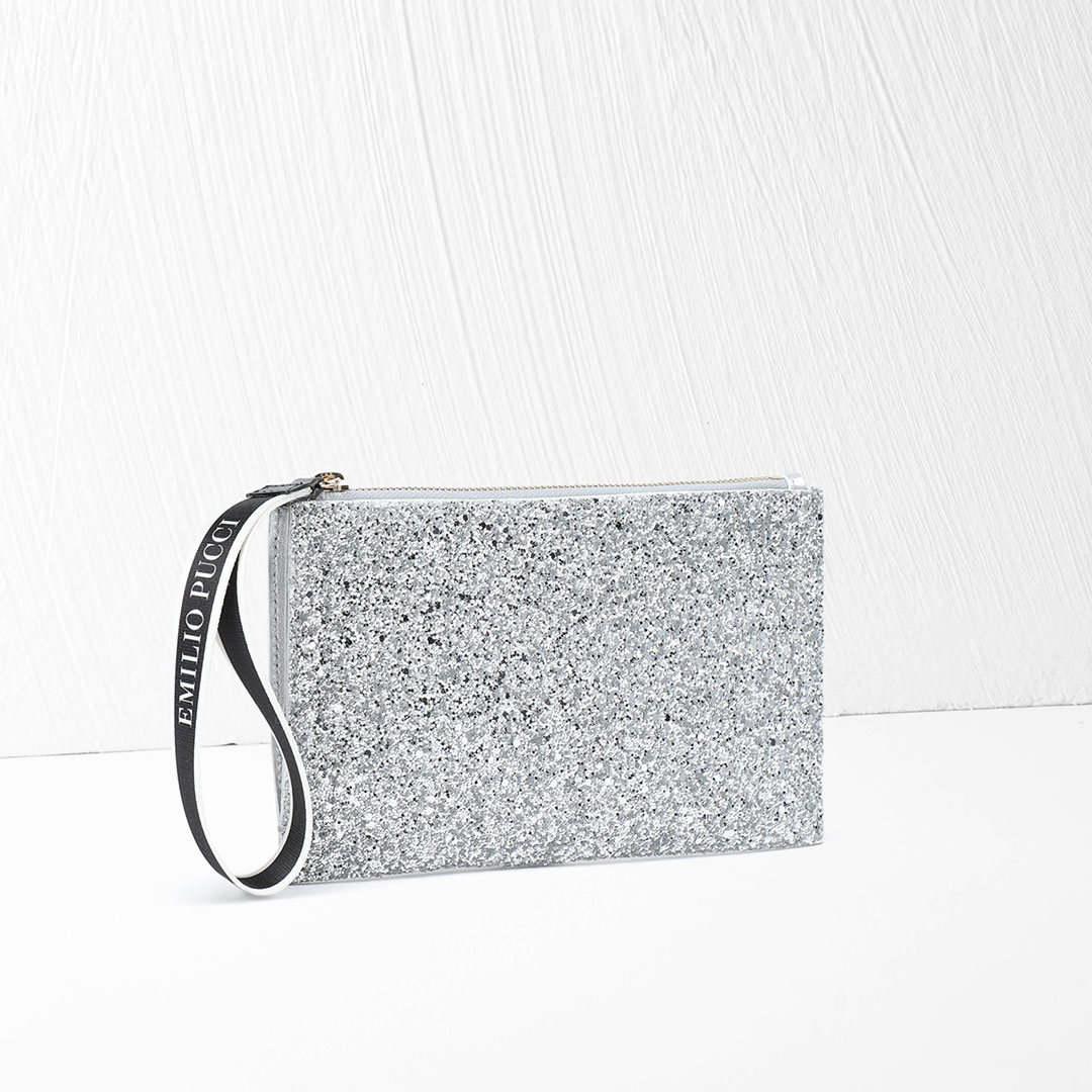 スニーカーとのコーディネートにもぴったりな、クラッチバッグも合わせてローンチ。同じく光り輝くグリッター施し、リストストラップには Emilio Pucci のブランドロゴが。ナイトアウトをよりグラマラスに仕上げてくれる、マストハブ アイテムを是非チェックして。