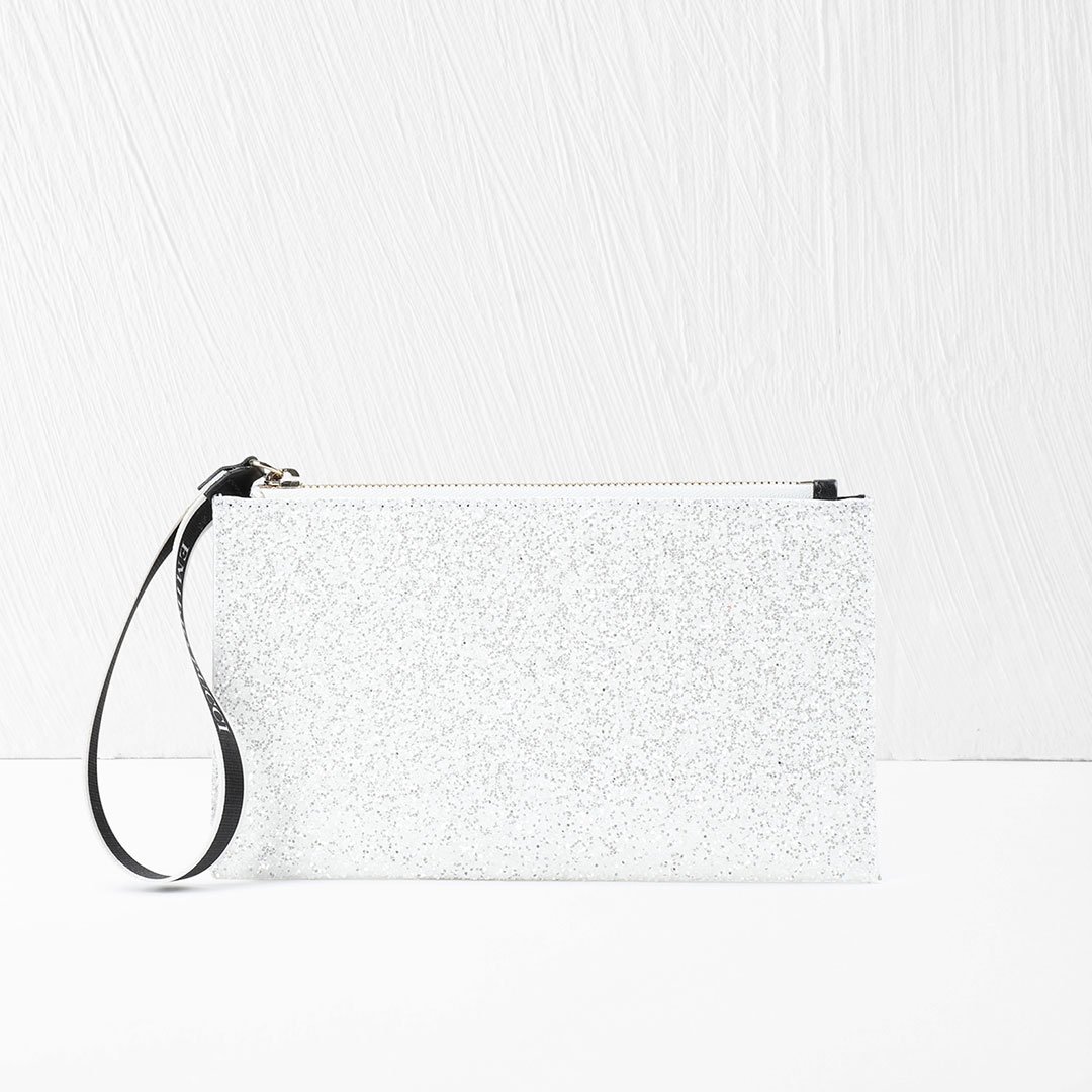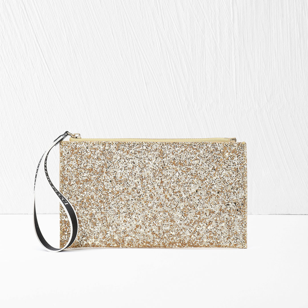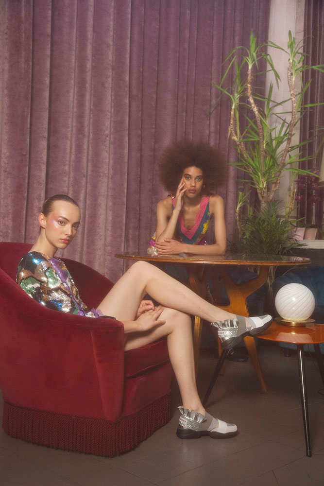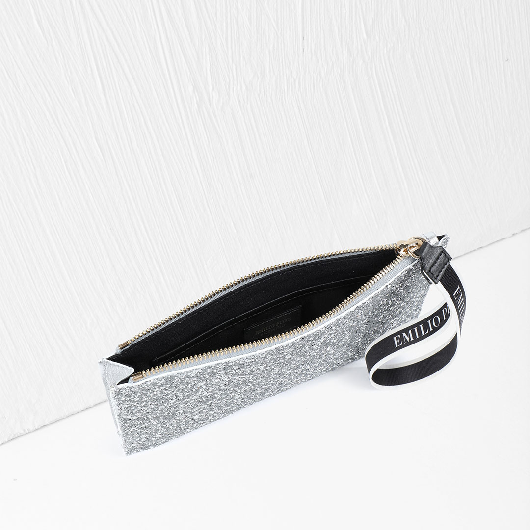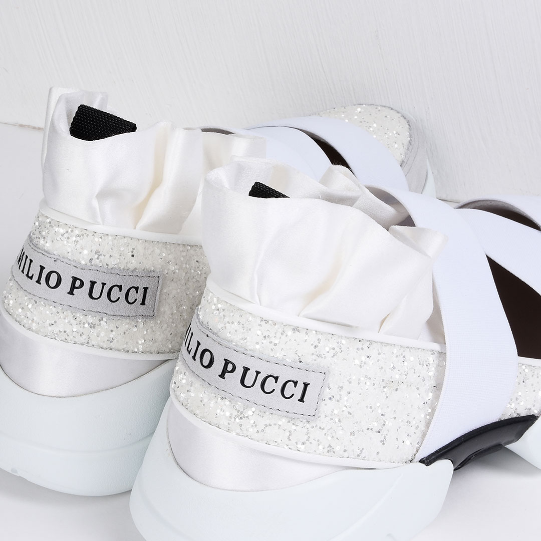 スニーカーとのコーディネートにもぴったりな、クラッチバッグも合わせてローンチ。同じく光り輝くグリッター施し、リストストラップには Emilio Pucci のブランドロゴが。ナイトアウトをよりグラマラスに仕上げてくれる、マストハブ アイテムを是非チェックして。