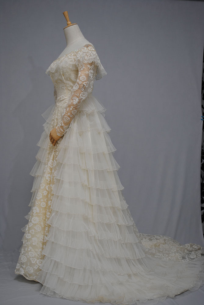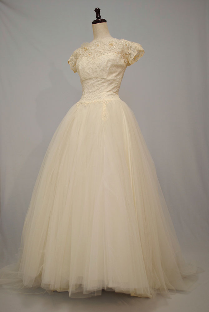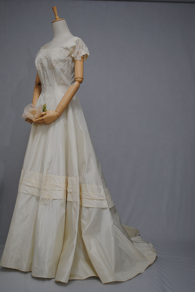 長きに渡った世界大戦も集結し平和ムードがアメリカ全土に広がった1950年代。「アメリカNo. 1」を声高に叫ぶムーブメントに呼応するように質の良いものや、明るいイメージのデザインが多い傾向に。時代を象徴するアイコンとして世の女性たちが憧れたのはハリウッド黄金期を代表する大女優 Audrey Hepburn (オードリー ヘップバーン)。『ローマの休日』(1953) や『麗しのサブリナ』(1954) といった作品の劇中で彼女が着用していたようなウエストがきゅーっと細く、デコルテが綺麗に出ている華やかなドレスが流行となり、そのデザインの DNA は現代にまで受け継がれている。また、白い手袋に床までの長さのドレスなど、伝統的な花嫁スタイルが生まれたのもこの時代だ。