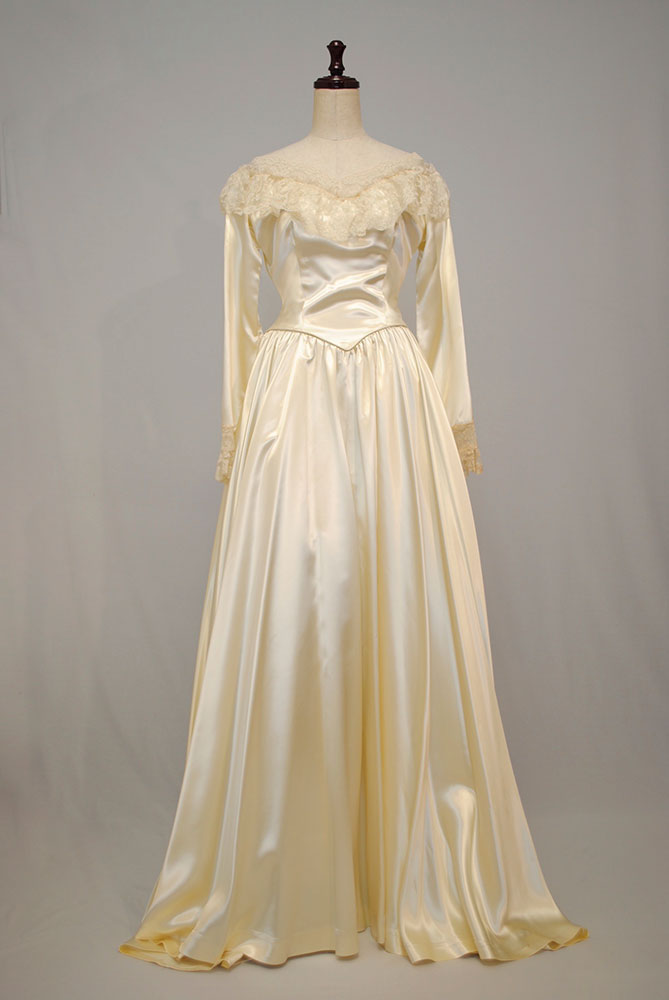 1940年代を取り入れたデザインがリバイバル。ファッション業界全体で、肩幅が広く大きな肩パットも主流になったこの時代。一斉を風靡した英国のダイアナ元王妃の着用したドレスのように、大きくふくらんだパフスリーブやサテンをたっぷりと使ったプリンセススタイルのドレスが人気に。ビーズの刺繍など大げさと思われる程華やかなものが多く登場した。
