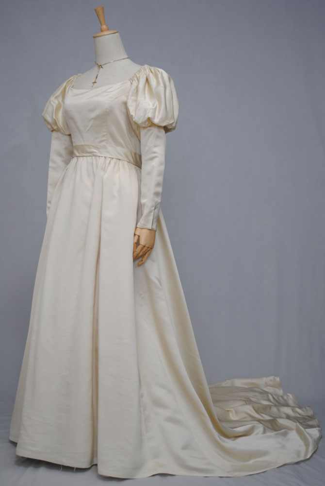 シフォンやチュールにレースをふんだんに重ねたヴィクトリア朝デザインのウェディングドレスがまたもやトレンドに浮上。襟元はハイネックで清楚に。背中に続く並んだくるみボタンや胸元や肩、袖に透けるチュールやヴィンテージレースが一周回って女性たちの憧れとしてカムバック。素材は化繊が主流になり、パールビーズやスパンコールなどを使いアンティーク感いっぱいのディテールでありながらモダンな印象を与えている。