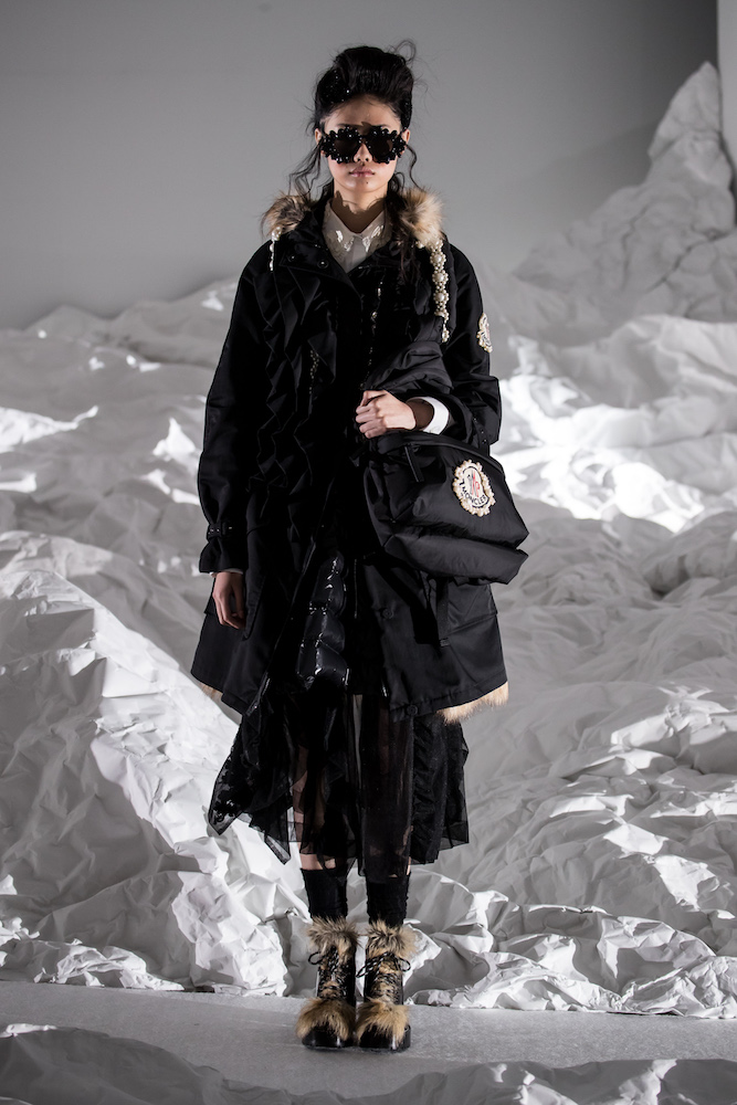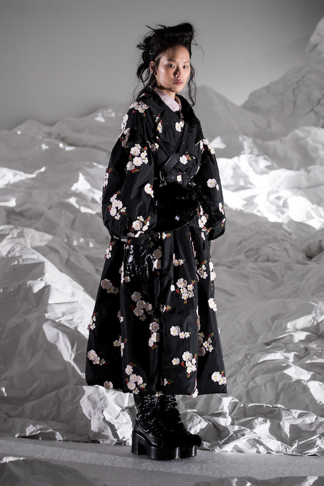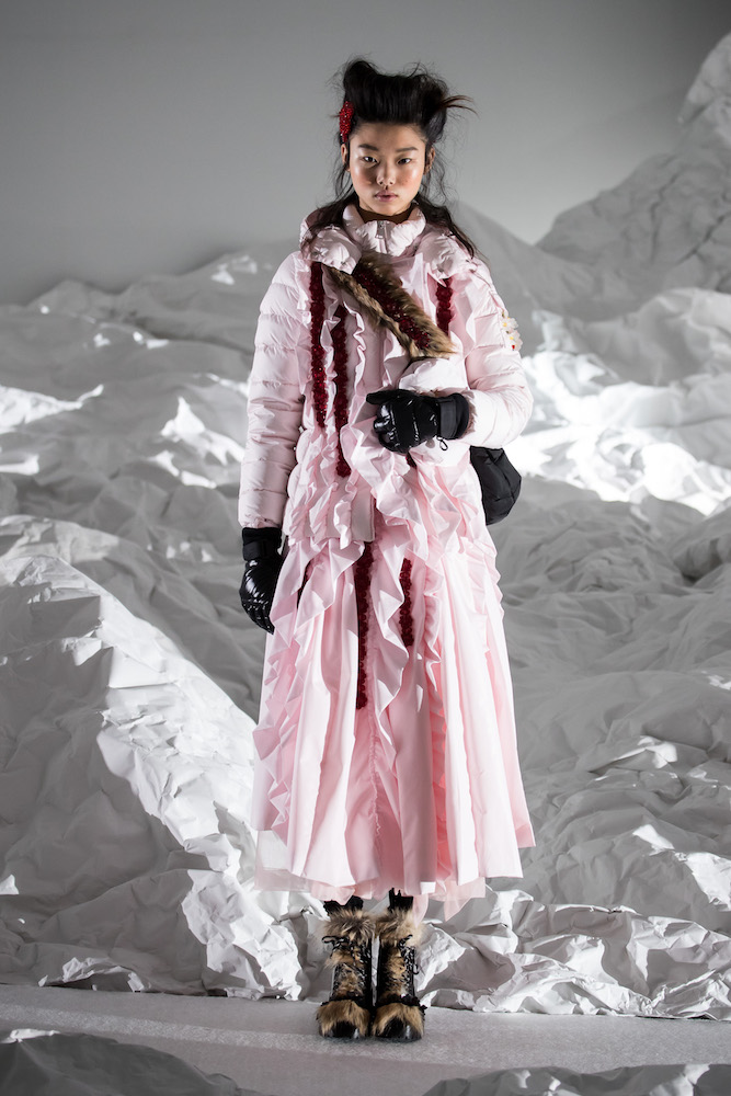19世紀の女性登山家からインスピレーションを受けたという彼女は、自身のシグネチャーとも言うべきスタイルと MONCLER の高度なテクニックを融合。レッドやピンク、アイボリー、ブラックといった彼女らしいパレットにパールやフローラルビジュー、刺繍、フリルといったフェミニンなディテールを取り入れることで、ロマンティックなコレクションが仕上げられた。また、今回のコレクションではウェアだけでなく、バッグやシューズ、アクセサリーといったトータルコーディネートを提案。その確固たるヴィジョンを見事に表現した彼女に盛大な拍手を送りたい。