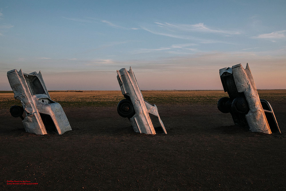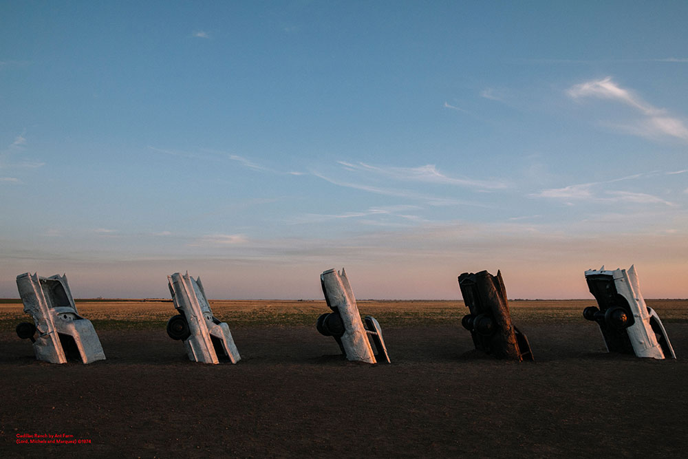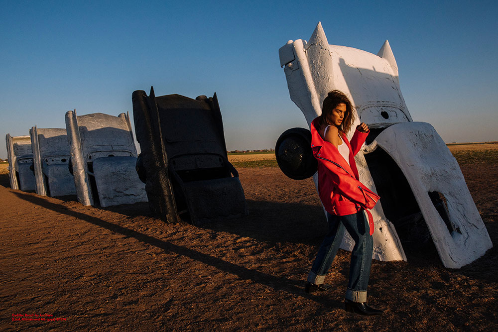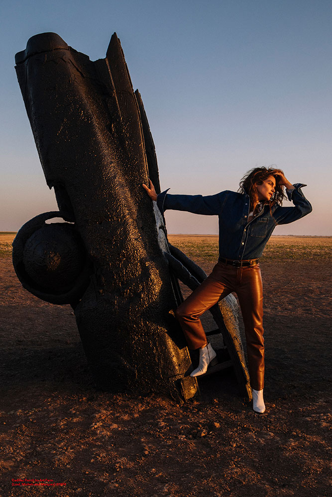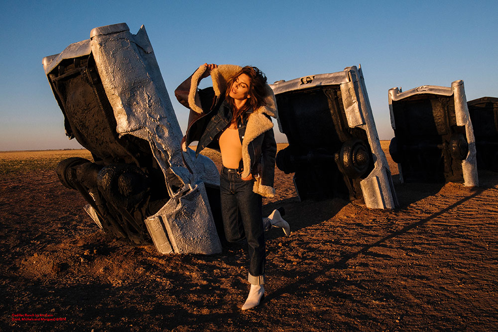 舞台は、アーティスト集団 Ant Farm (アント・ファーム) によるランド・アート作品「キャディラック・ランチ」。サンフランシスコで Chip Lord (チップ・ロード) と Doug Michels (ダグ・マイケルズ) によって1968年に結成された前衛的な芸術集団 Ant Farm がテキサスの豊かな自然の中に生み出したのは、キャディラックがまるで土に半分埋まってしまっているかのようなユニークな作品。1960年代後半より『ナショナルジオグラフィック』で写真家として世界各地の自然にレンズを向けてきた Sam Abell は今回、そうした壮大な風景の中で Cindy Crawford を撮影。ファッションフォトの枠に収まりきらないヴィジュアルに見事仕上げられている。