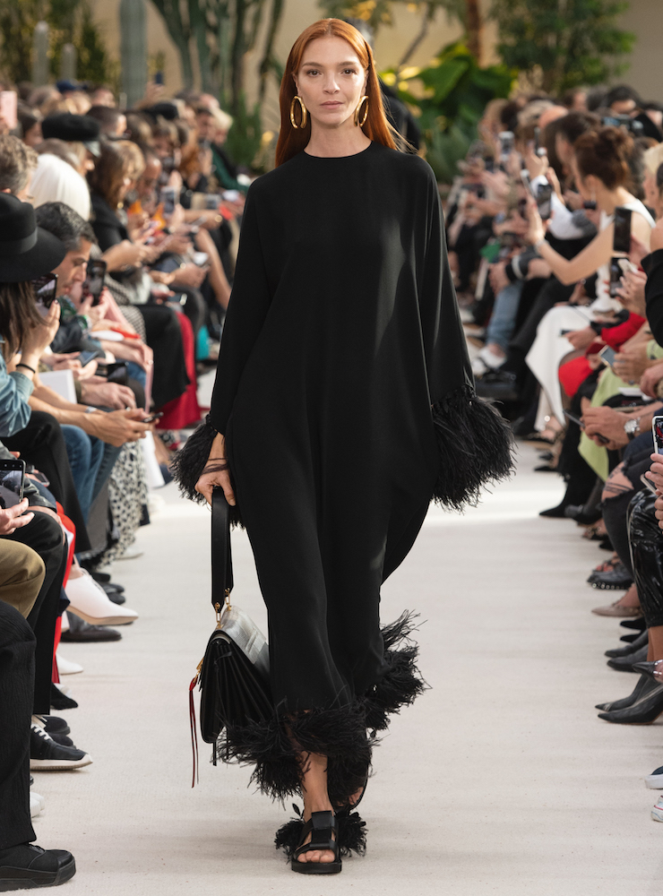 ジョーゼットに羽のトリミングをしたIラインドレス、プリーツ加工したように見える針抜きニットドレス、レースのパジャマジャケットにレザーのミニドレスと黒のバリエーションが続く。クリエイティブ・ディレクターの Pierpaolo Piccioli (ピエールパオロ・ピッチョーリ) は「黒はすべての色を混ぜ合わせたエネルギッシュな色」と言う。コレクションは白、ヴァレンティノレッド、バイカラーのプリント、そして何色ものスパンコールやビジューをつけたアイテムへと移ってゆく。
