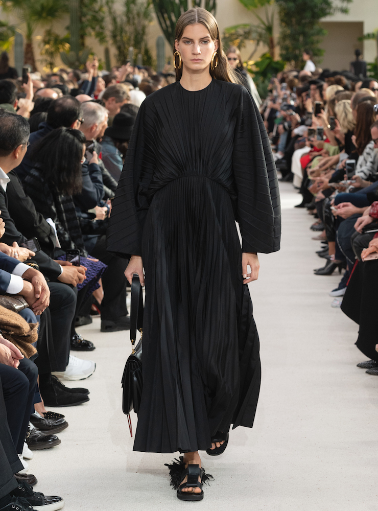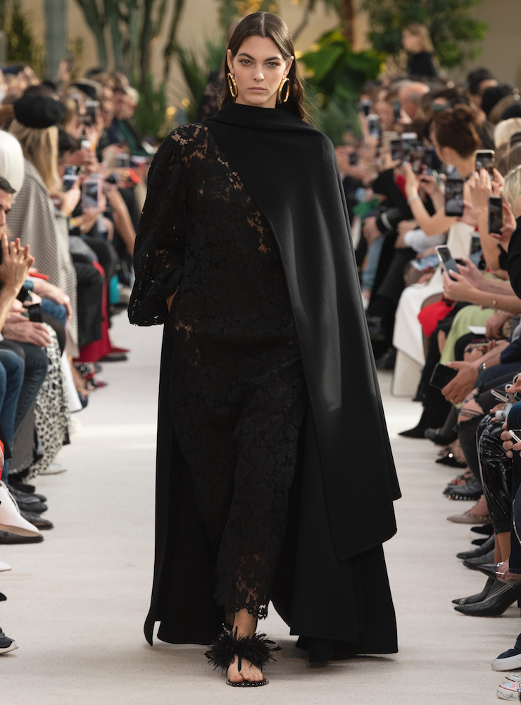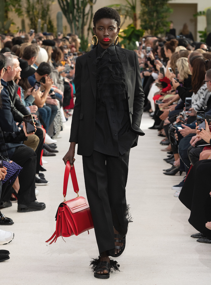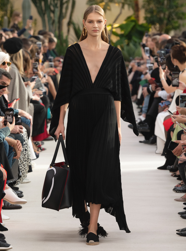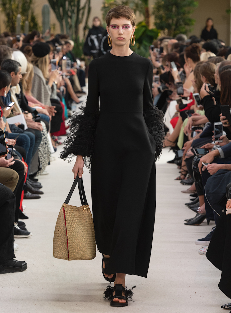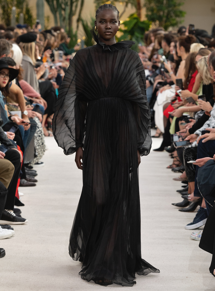 Valentino (ヴァレンティノ) は先シーズンに引き続き、アンヴァリッド(軍事博物館)の横にガラス張りのショー会場を設えてコレクションを発表した。ステージには巨大なサボテンが配置され春夏のトロピカルなイメージかと思いきや、コレクションは黒1色のドレスからスタートした。