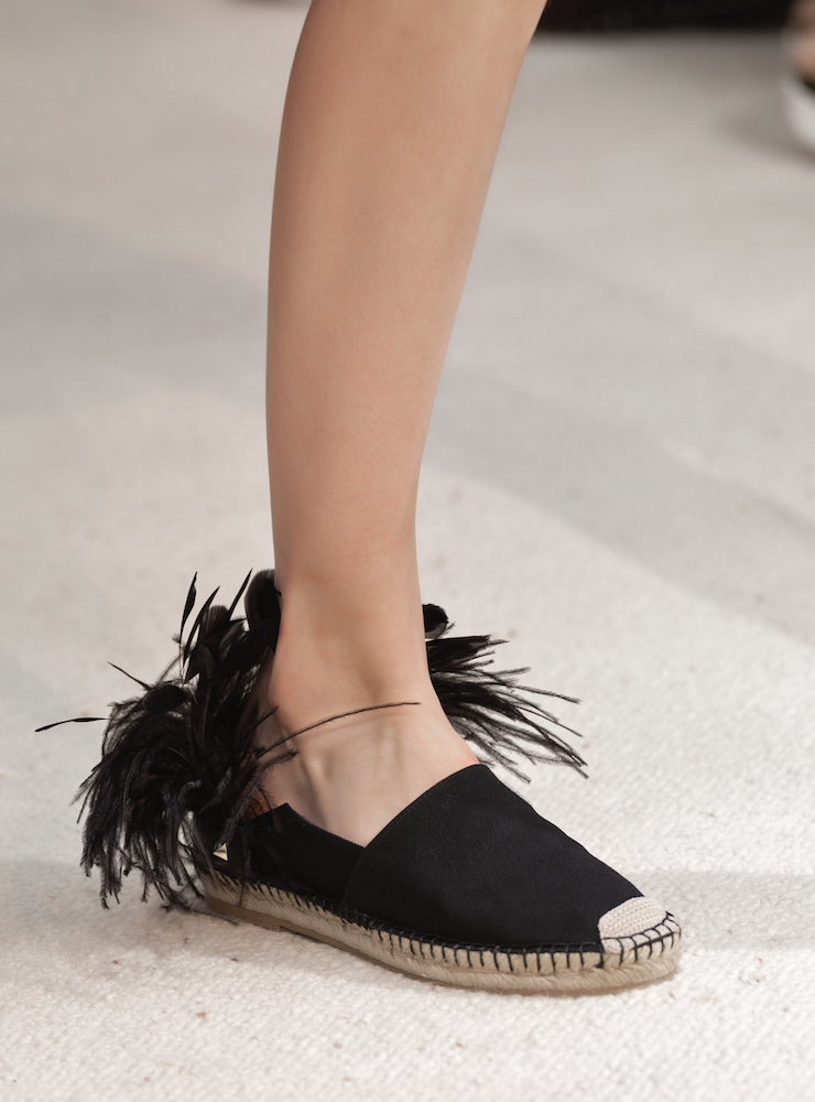 肩をグッと開けたギャザーたっぷりのドレスは、袖がそのまま背中にかけて大きなパラシュートのようなトレーンとなる。歩くたびにサテンの音がキシっとするほどの量感に羽根のついたペタンコサンダルを合わせている。